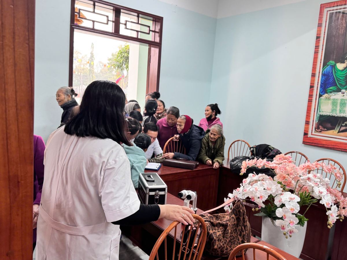 Đoàn bác sĩ gồm 05 bác sĩ, đã có mặt từ thứ Bảy để chuẩn bị cơ sở vật chất, tổ chức nhân sự và quy trình khám bệnh. Sang Chúa Nhật, từ 07 giờ 30 đến 11 giờ 30, đoàn đã tiến hành khám mắt cho 150 người dân, bao gồm bà con trong và ngoài giáo xứ, không phân biệt tôn giáo, hoàn cảnh hay độ tuổi.