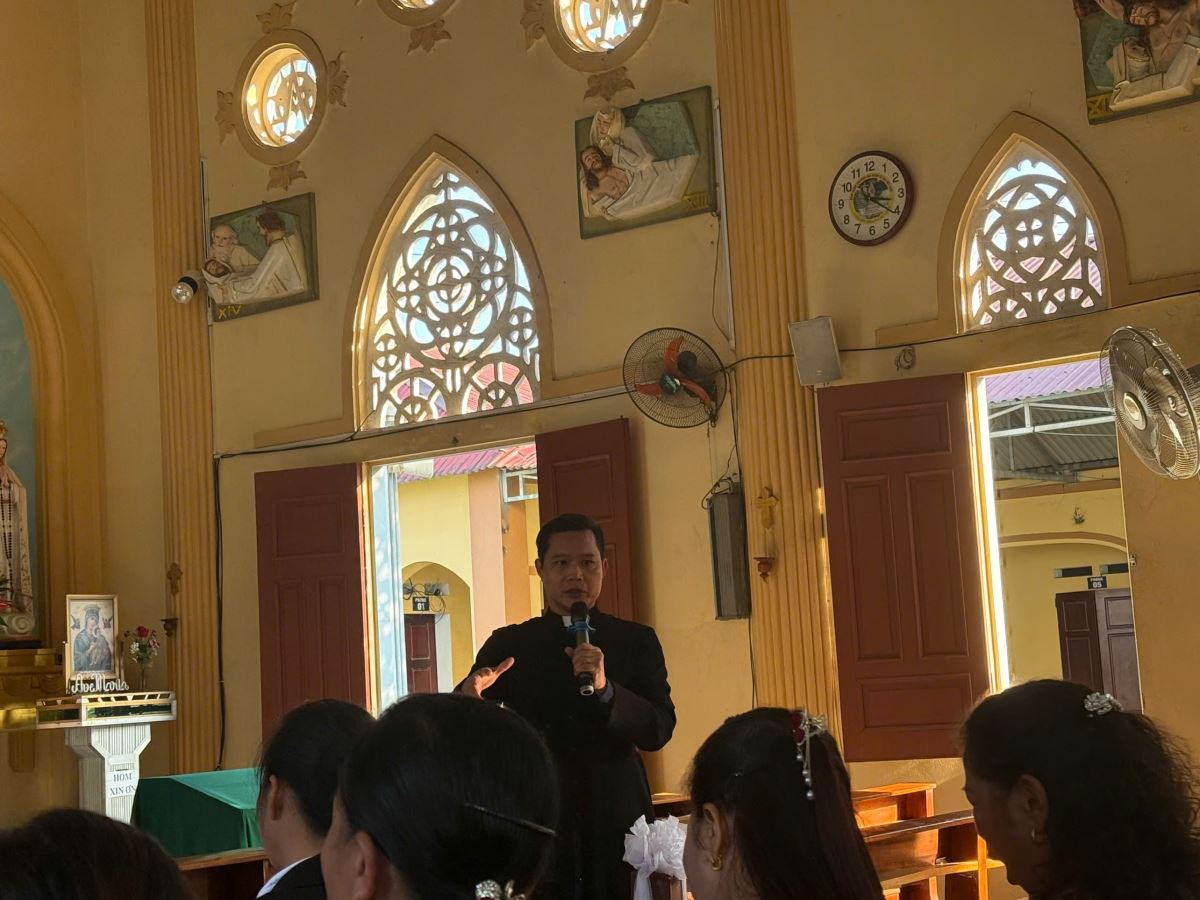 Đến 14g30, anh chị em ca viên bước vào giờ tĩnh tâm, lắng nghe huấn từ của Cha xứ Giuse Cấn Xuân Bằng về tinh thần yêu thương, hiệp nhất và lắng nghe trong sứ vụ tông đồ của các hội đoàn, đặc biệt là đối với ca đoàn.