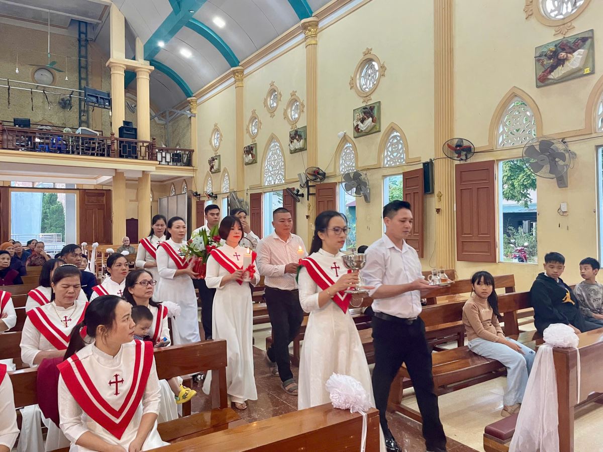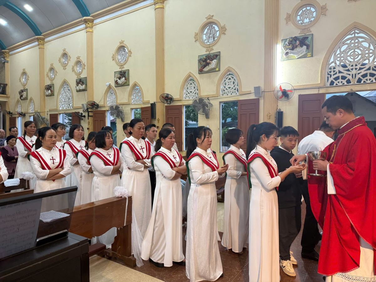 Tiếp đến là phần Phụng vụ Thánh Thể. Tám anh chị em đại diện Ca đoàn tiến lên cung thánh dâng của lễ trong tâm tình tạ ơn, kính dâng lên Chúa những công sức, hy sinh, niềm vui và cả những khó khăn đã trải qua trong suốt 20 năm phục vụ. Cả cộng đoàn cùng hiệp thông sâu xa, đặc biệt trong giây phút tiến lên rước lễ – lãnh nhận chính Chúa là nguồn nuôi dưỡng linh hồn.