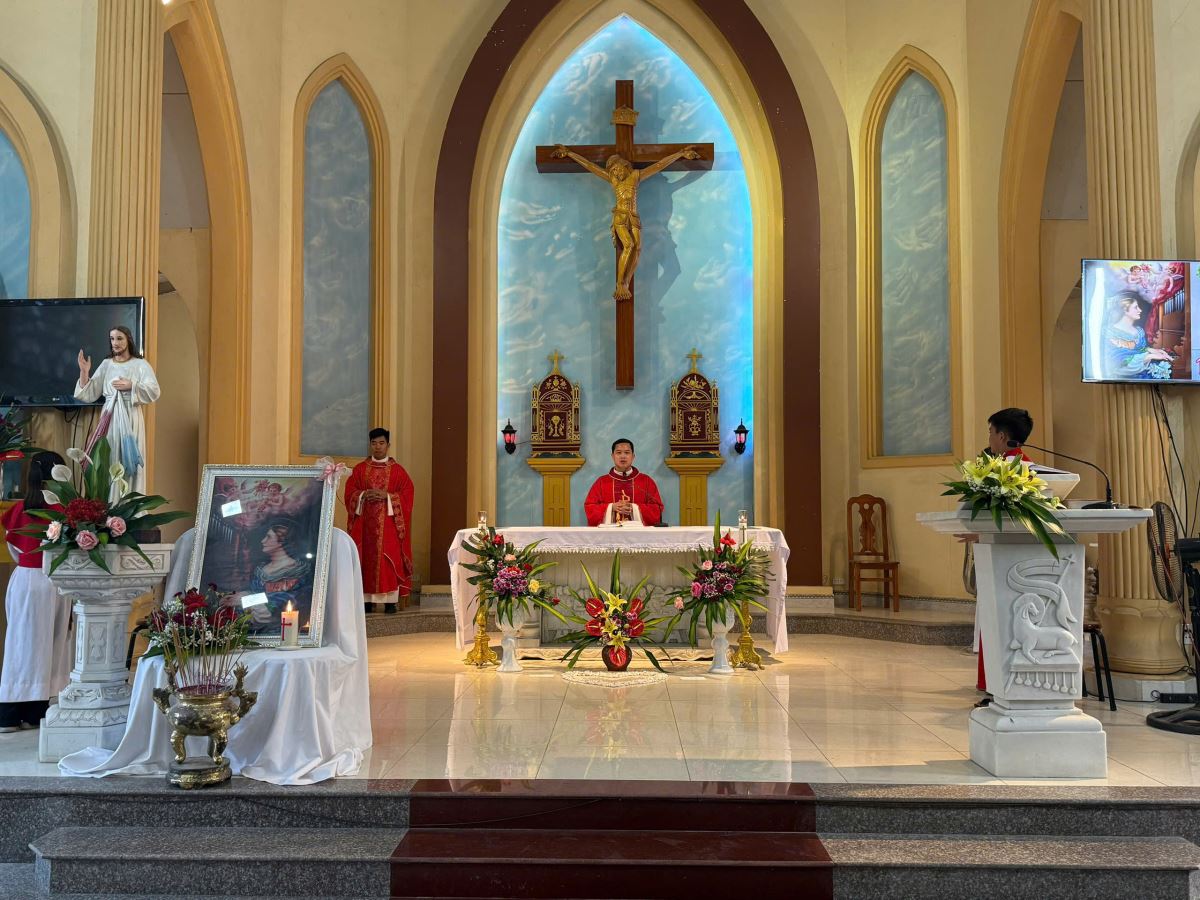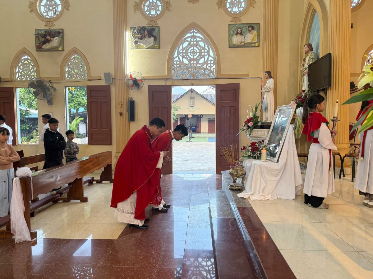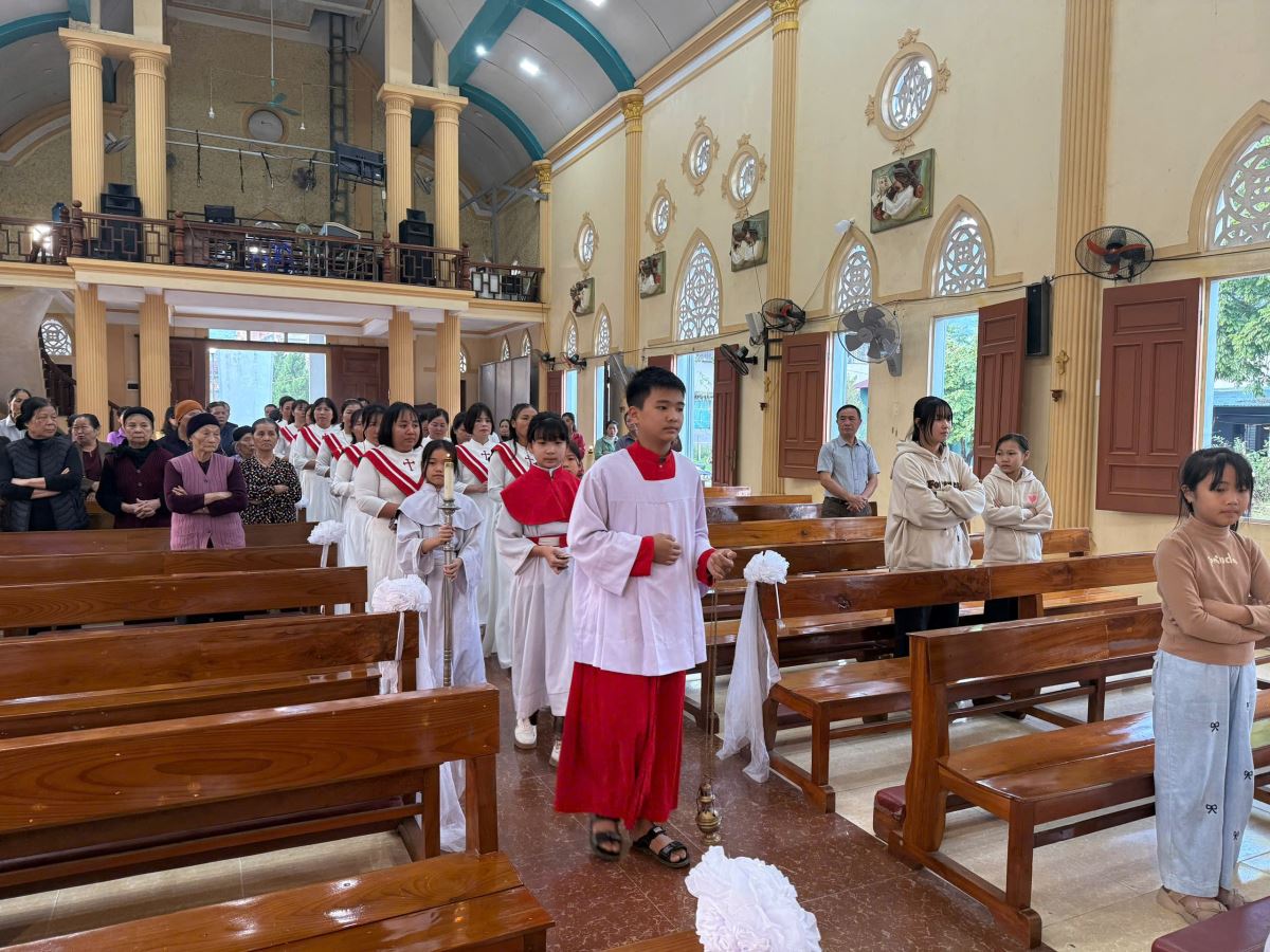 Đúng 16g30, thánh lễ đồng tế được cử hành trong bầu khí trang nghiêm và sốt sắng. Cha xứ Giuse Cấn Xuân Bằng chủ tế, cùng đồng tế có Cha phó Giuse Lê Hữu Phước. Trong lời mở đầu, Cha chủ tế mời gọi cộng đoàn tạ ơn Chúa vì muôn ơn lành, và hiệp ý cầu nguyện cách riêng cho ca đoàn – những người đã chọn Thánh Cecilia làm mẫu gương và là nguồn cảm hứng trong sứ mạng phục vụ bằng lời ca tiếng hát.