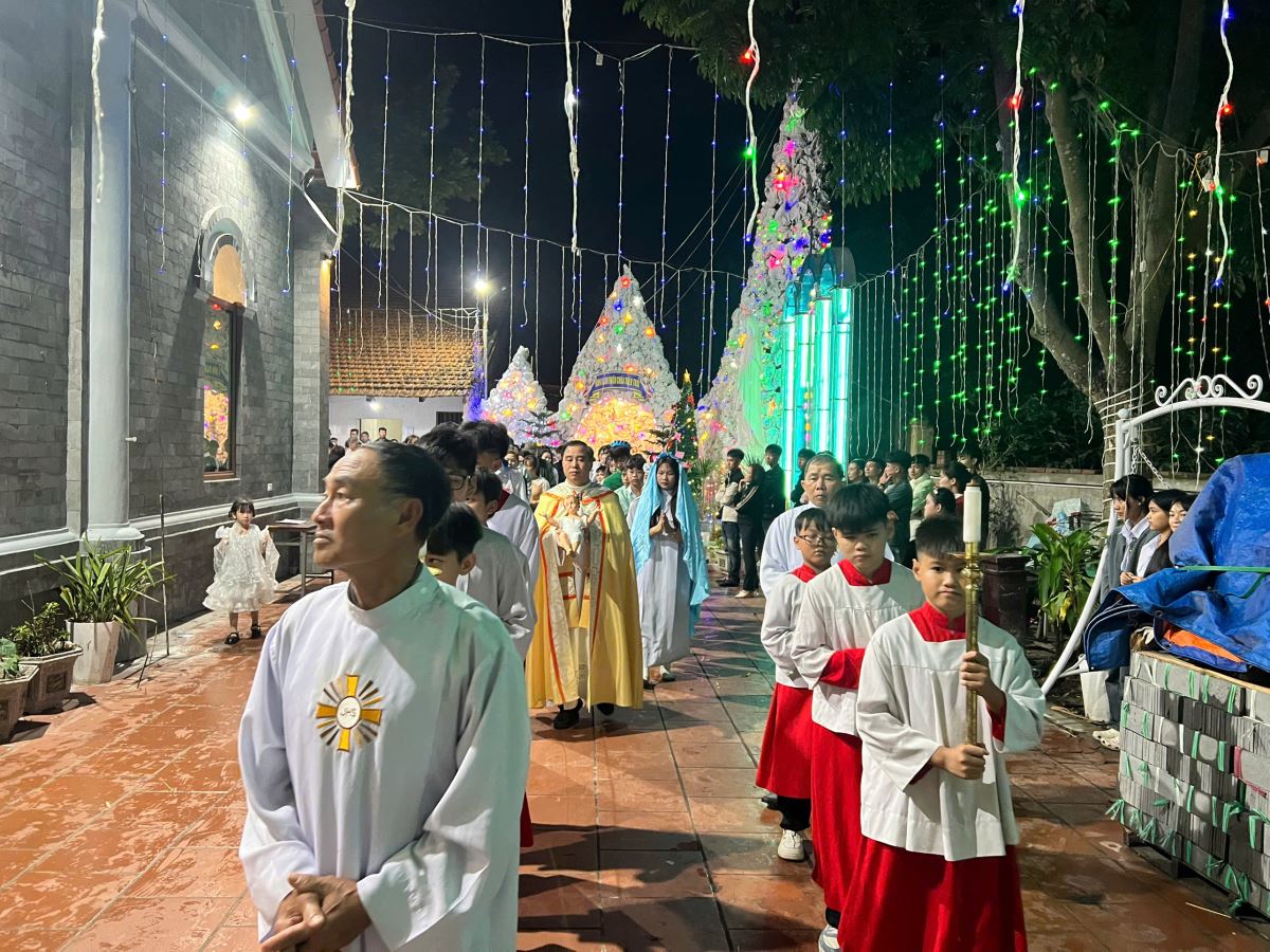 Kết thúc chương trình văn nghệ, cộng đoàn cùng nhau tạ ơn Thiên Chúa và sốt sắng bước vào Thánh lễ mừng Chúa Giáng Sinh. Thánh lễ được cử hành long trọng do Cha xứ Antôn Maria chủ sự. Trong Thánh lễ, Cha chia sẻ và nhấn mạnh đến câu lời Chúa: “Vinh danh Thiên Chúa trên trời, bình an dưới thế cho loài người Chúa thương”