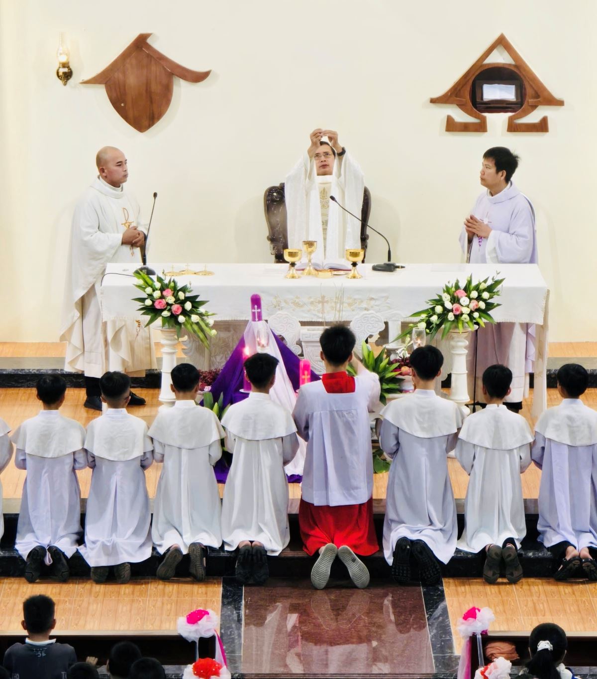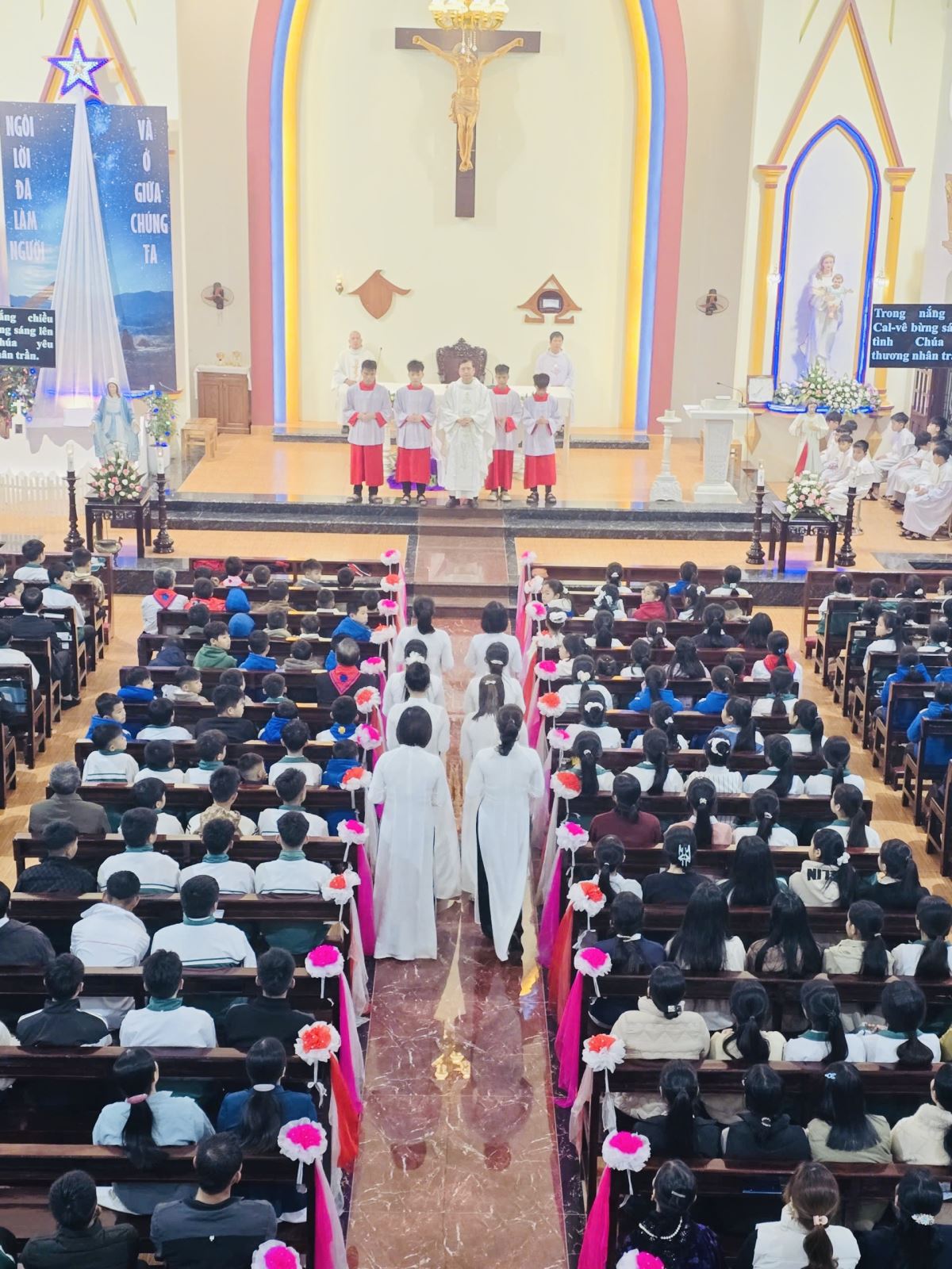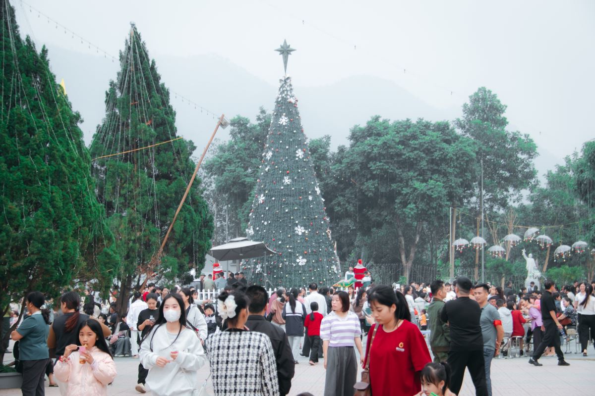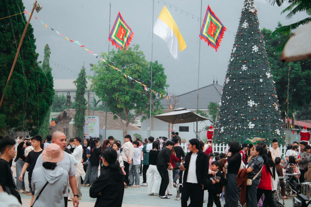 Ngay từ buổi sáng sớm, khuôn viên nhà thờ đã bừng lên một sức sống đặc biệt. Từng dòng người từ khắp nơi trong và ngoài giáo xứ tề tựu về, mang theo những nụ cười rạng rỡ, những lời chào đầu năm và niềm háo hức hiện rõ trên từng gương mặt. Tiếng cười nói rộn ràng hòa cùng những băng reo sinh động của các em thiếu nhi, tạo nên một bầu khí vui tươi, ấm áp và đầy thân tình. Những bước chân quen thuộc của người trong giáo xứ xen lẫn với bước chân lần đầu ghé đến của những vị khách phương xa, tất cả cùng gặp nhau nơi sân nhà thờ, biến không gian ấy thành một ngày hội thực sự của gặp gỡ, hiệp thông và sẻ chia.