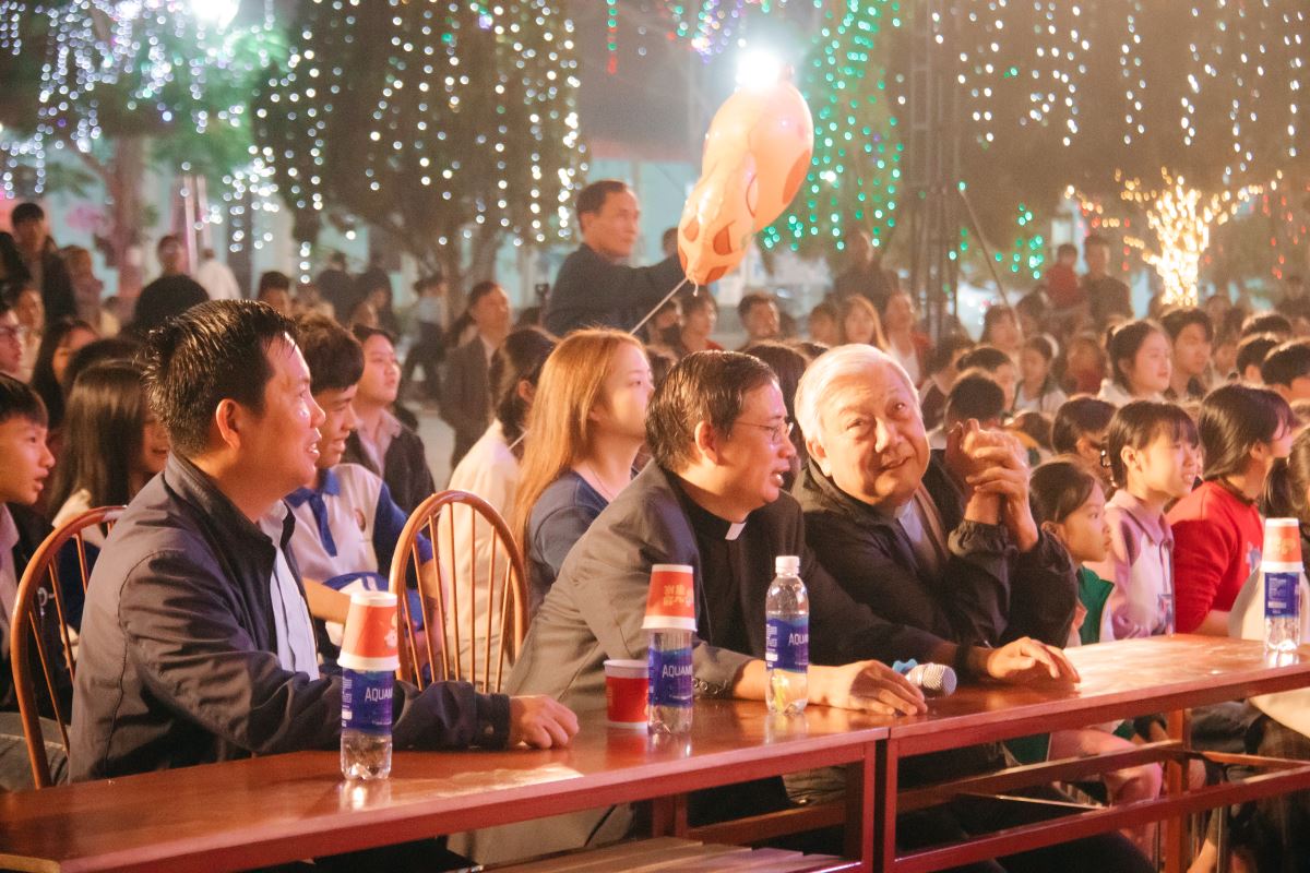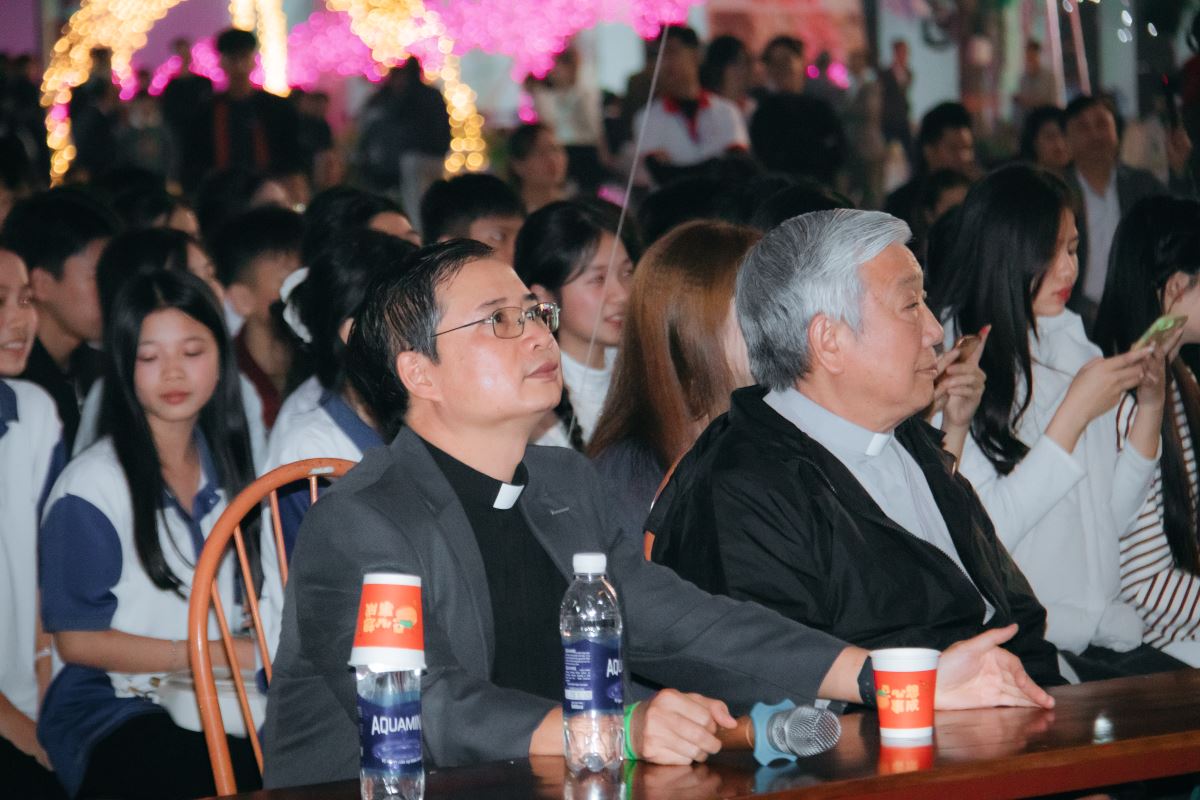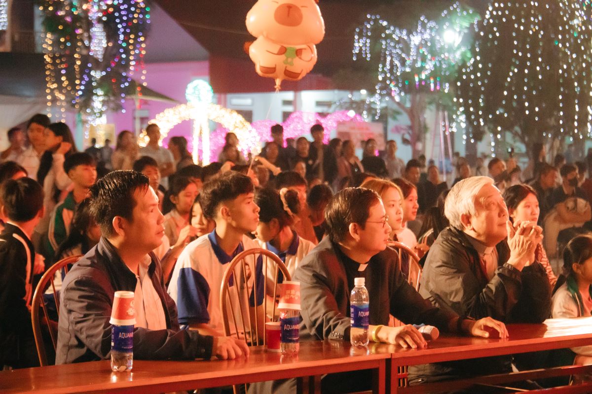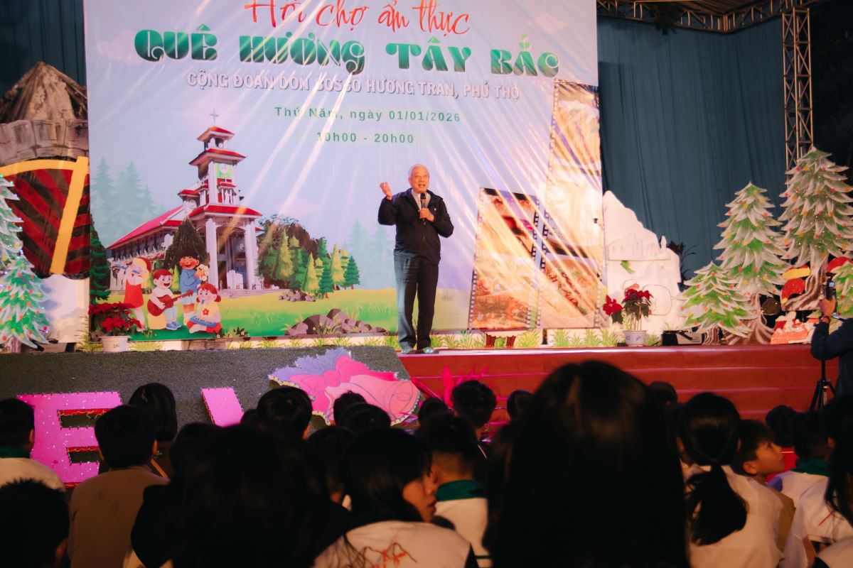 Sau khi kết thúc các hoạt động của các gian hàng hội chợ ẩm thực, sân nhà thờ rực sáng trong chương trình văn nghệ. Trước khi các tiết mục chính thức bắt đầu, cộng đoàn được lắng nghe lời huấn từ của Cha Toma Vũ Kim Long SDB - Bề trên phụ tỉnh Mẹ La Vang. Cha đã nhấn mạnh chiều kích giáo dục toàn diện mà các sinh hoạt Don Bosco đang hướng tới qua các hoạt động như chương trình hội chợ hôm nay.