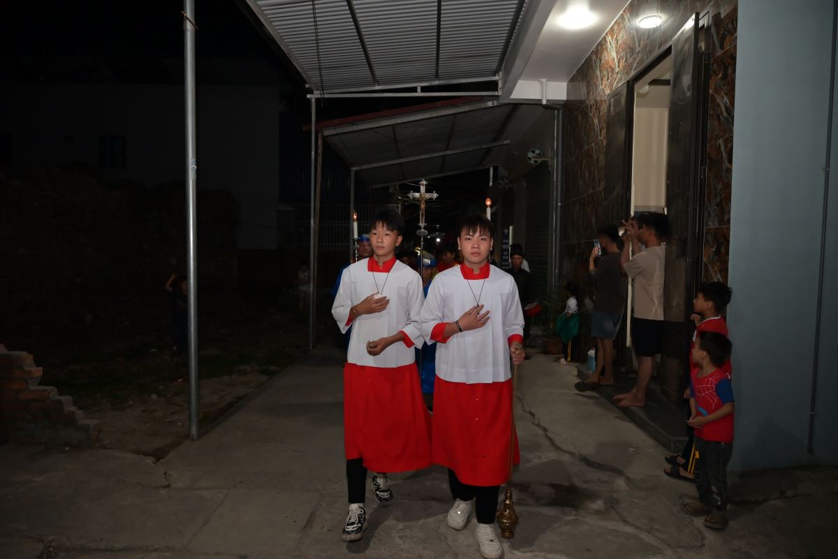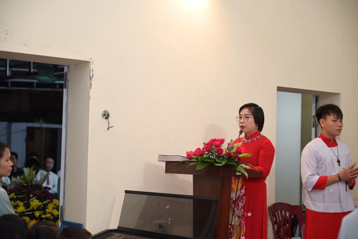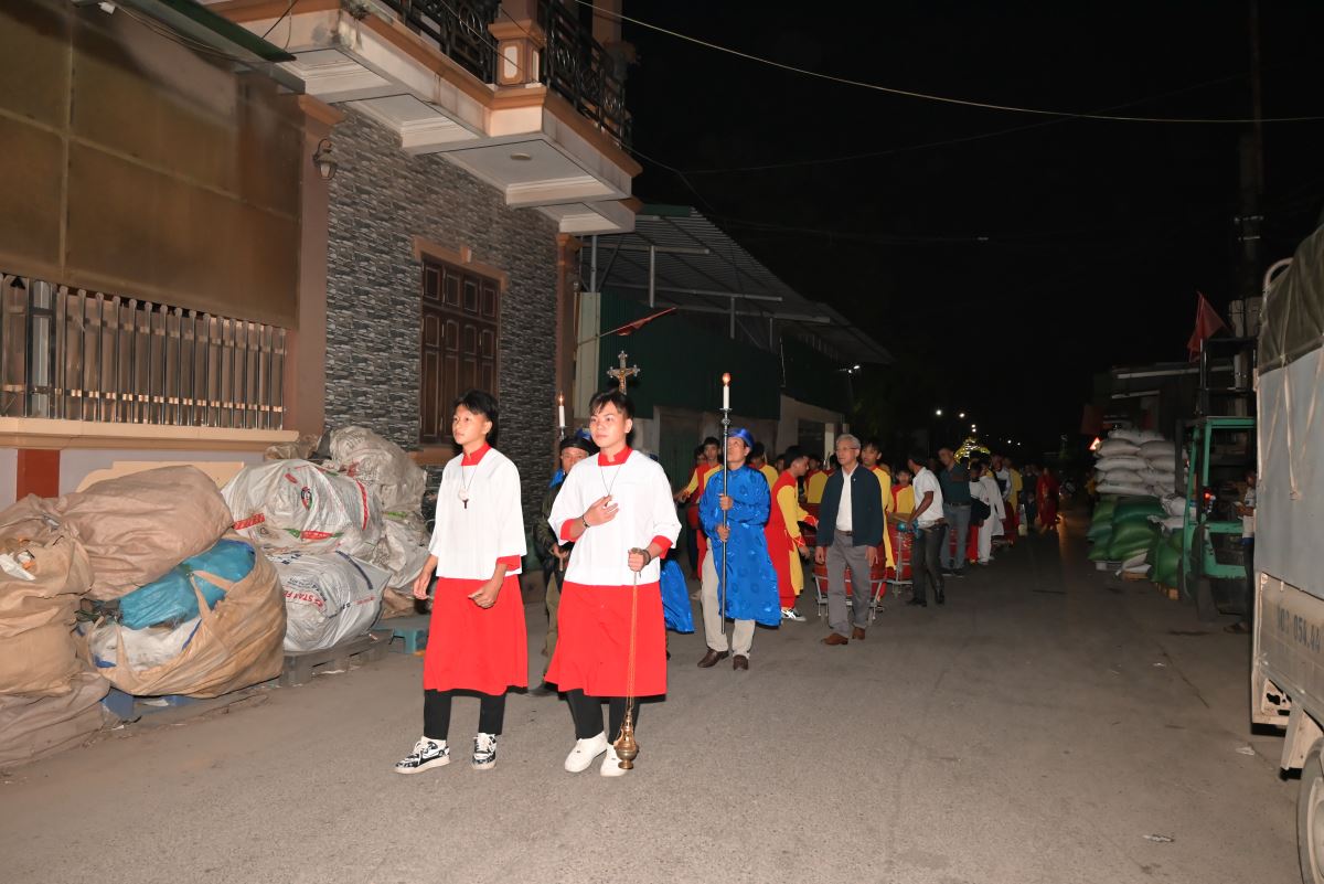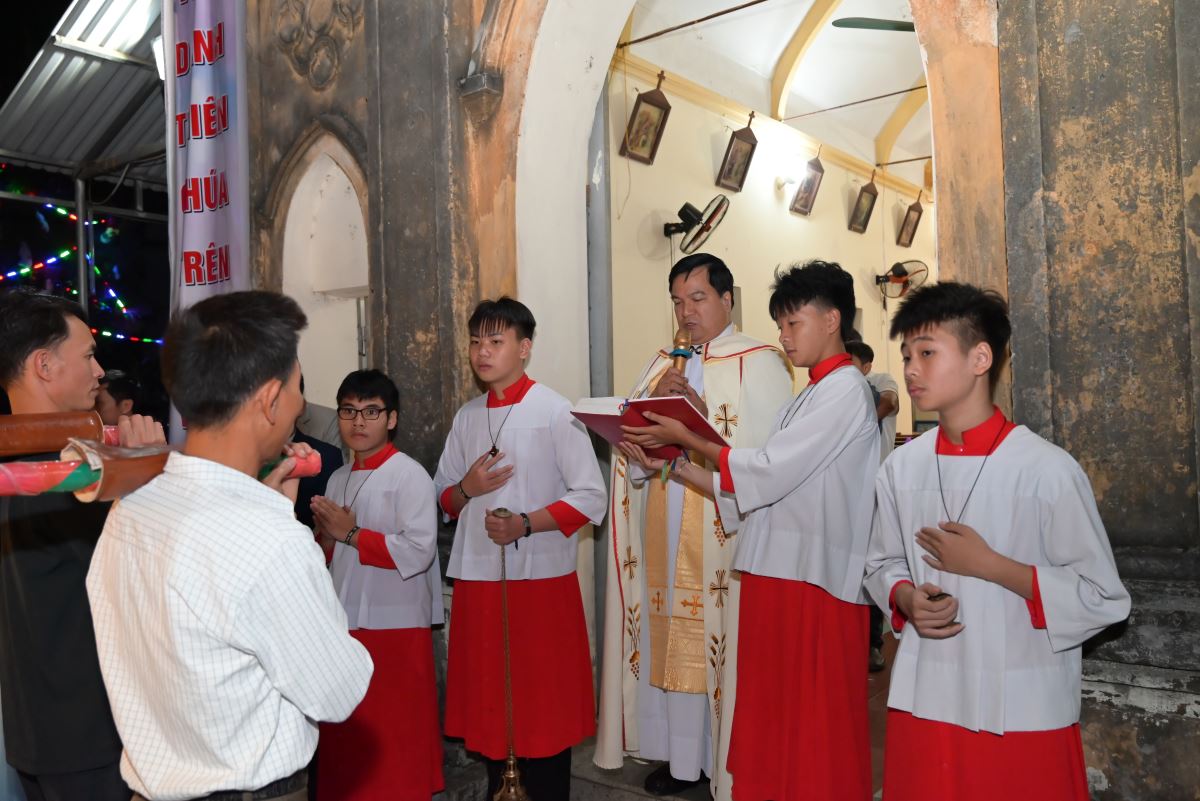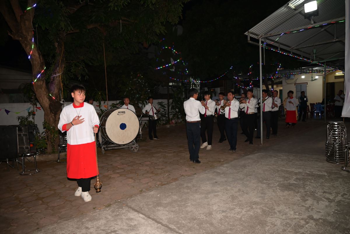 Đúng 20g15, đoàn rước tiến về nhà thờ, cộng đoàn bước vào đêm hoan ca mừng Chúa Giáng sinh 2025. Trong lời khai mạc, cha xứ Đaminh đã nói lên ý nghĩa của đêm hoan ca mừng Chúa Giáng sinh, những lời ca tiếng hát của các bà, các mẹ, các em thiếu nhi, giới trẻ như lời ca của các Thiên Thần vang lên từ đồng cỏ Bêlem năm nào “Vinh danh Thiên Chúa trên trời,
