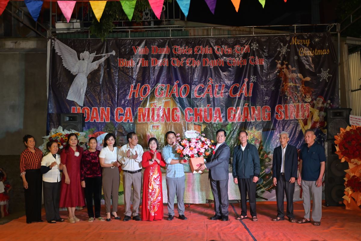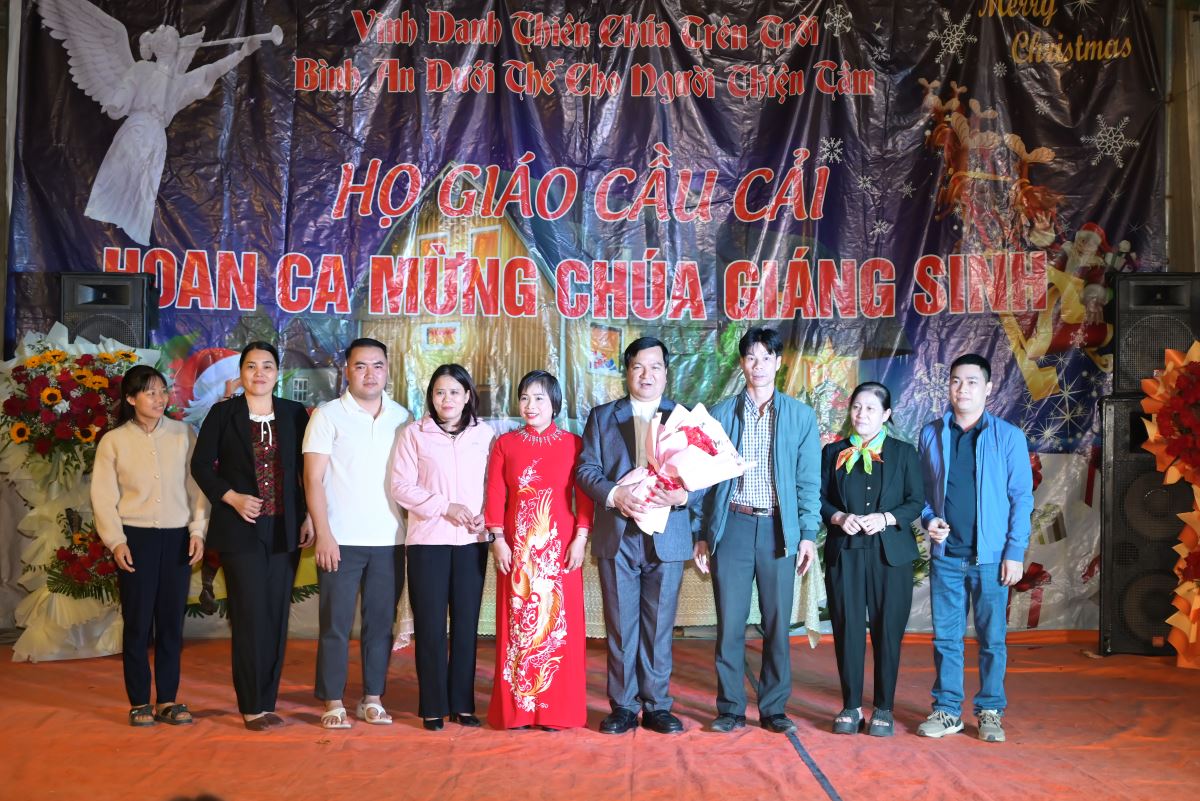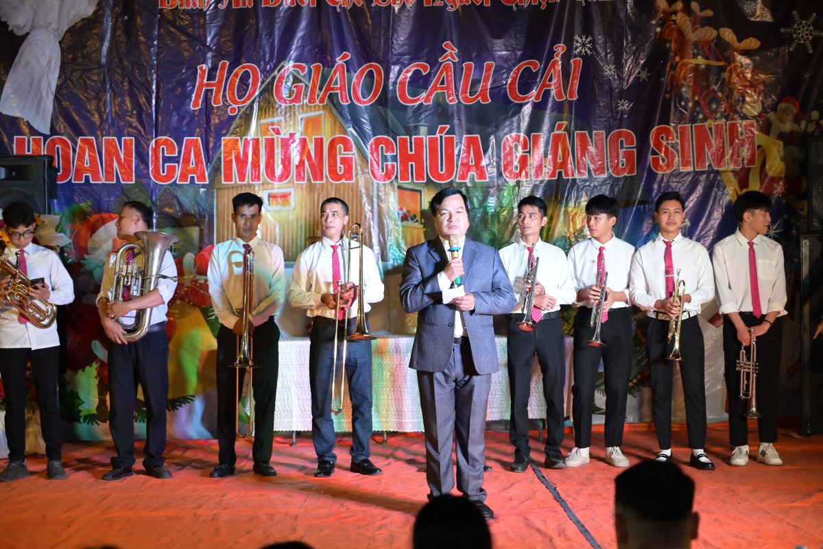 Trong lời khai mạc, cha xứ Đaminh không quên gửi lời cảm ơn đến các cấp chính quyền địa phương, bà con không cùng niềm tin Công giáo đã giúp đỡ, chung chia niềm vui với bà con giáo dân giáo họ Cầu Cải trong dịp này. Cũng trong đêm hoan ca mừng Chúa Giáng sinh 2025, đại diện chính quyền địa phương, các đoàn thể đã có lãng hoa chúc mừng giáo họ Cầu Cải.