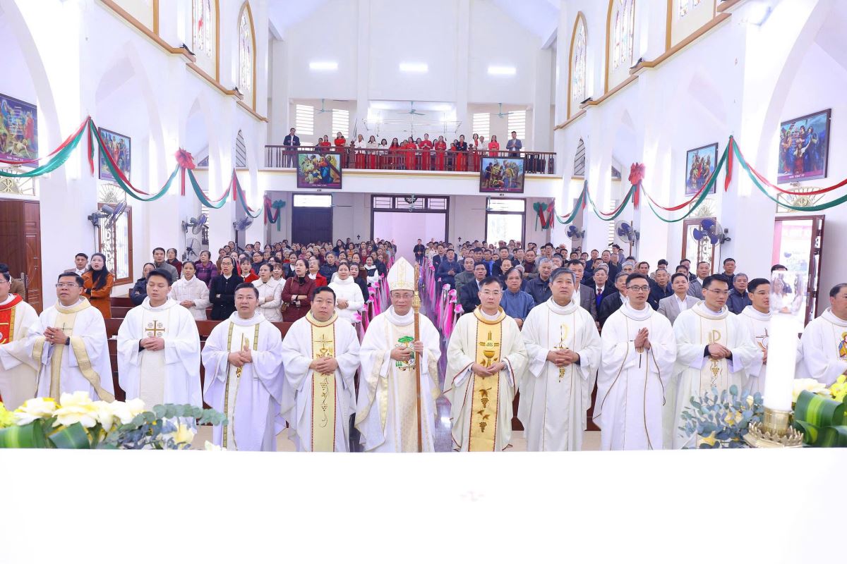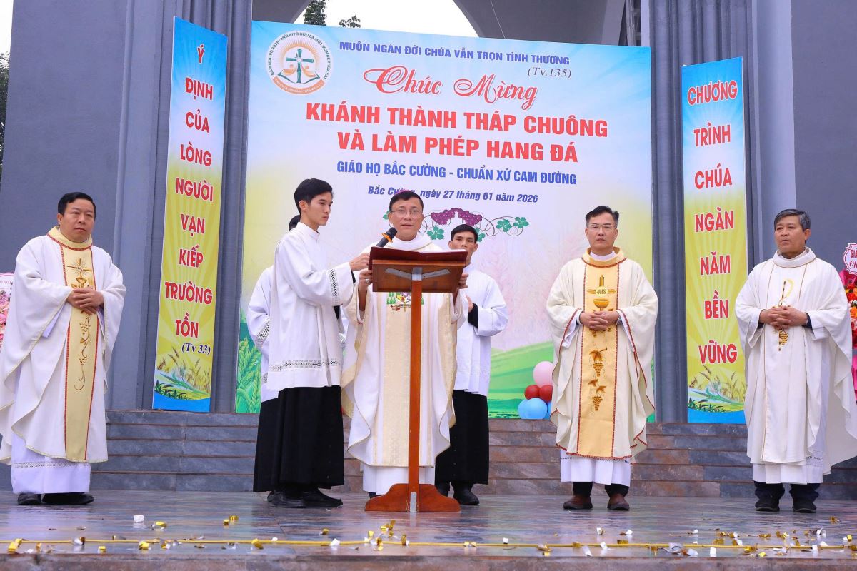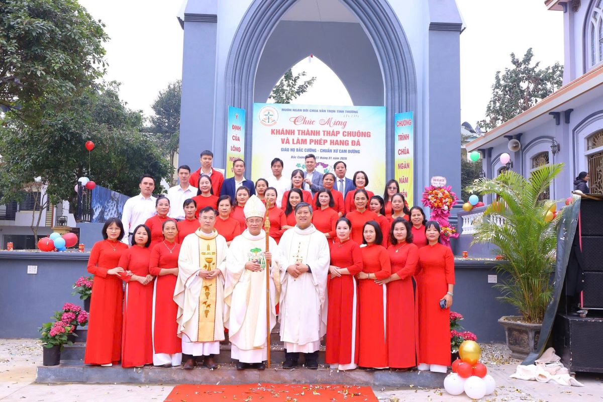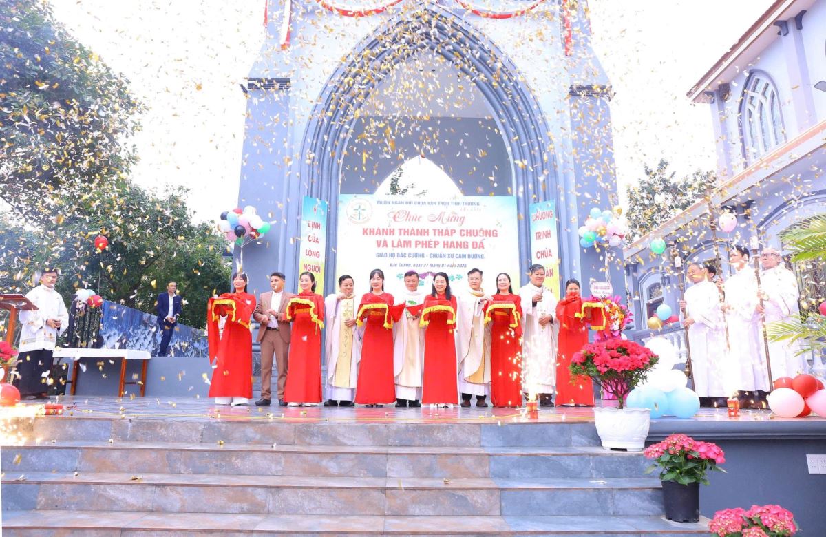 WGPHH – Trong niềm hân hoan và tâm tình tạ ơn Thiên Chúa, sáng ngày 27/01/2026, Đức Cha Phaolô Nguyễn Quang Đĩnh – Giám mục Phụ tá Giáo phận Hưng Hóa đã về giáo họ Bắc Cường, thuộc giáo xứ Lào Cai, để chủ sự Thánh lễ tạ ơn và cử hành nghi thức làm phép hang đá kính Đức Mẹ Mân Côi, đồng thời cắt băng khánh thành tháp chuông của giáo họ. Hiện diện và hiệp dâng trong Thánh lễ có cha quản hạt Giuse Đỗ Đình Tôn, cha xứ Phêrô Nguyễn Đình Đền, quý cha, quý tu sĩ và đông đảo cộng đoàn dân Chúa, góp phần làm lan tỏa bầu khí hiệp thông, trở thành nguồn khích lệ tinh thần sâu sắc cho giáo họ Bắc Cường.