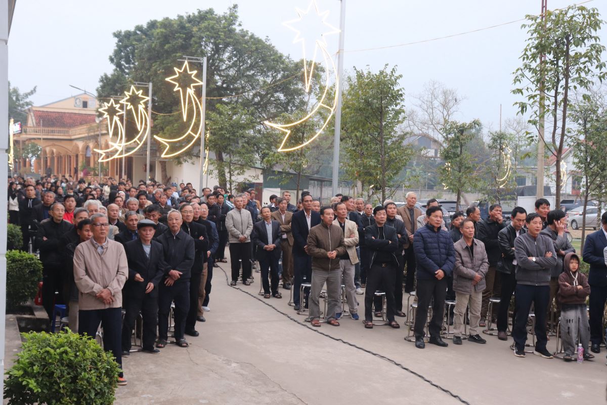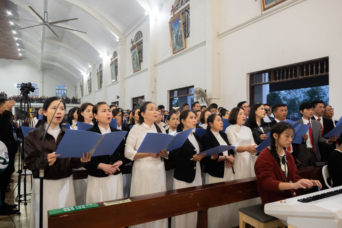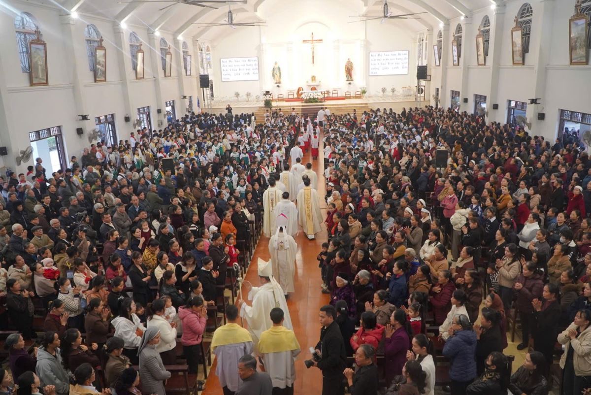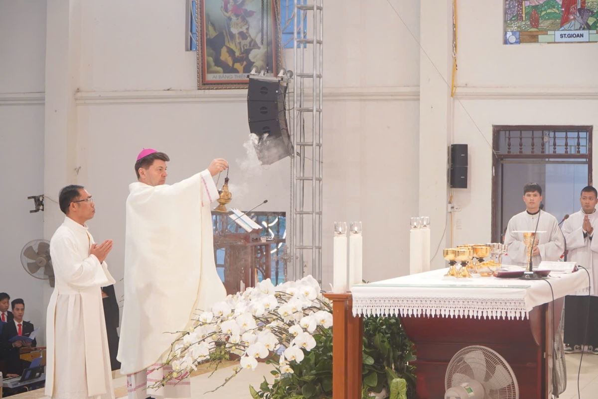 Đúng 16g30, đoàn đồng tế từ nhà mục vụ tiến vào Nhà Đa năng Giáo xứ để hiệp dâng Thánh lễ do Đức Tổng Giám mục Marek Zalewski chủ tế. Đồng tế với ngài có Đức cha Đaminh Hoàng Minh Tiến, Cha Quản hạt Antôn Vũ Thái San – Chính xứ Hoàng Xá, cùng quý cha trong Giáo hạt Tây Nam Phú Thọ.