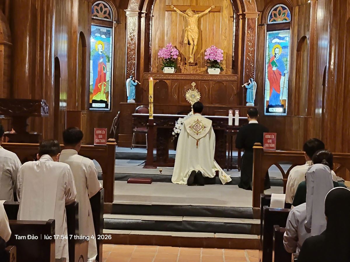 Tiếp đó, mọi người cùng lắng đọng tâm hồn bên Chúa Giêsu Thánh Thể trong không gian linh thiêng của ngôi thánh đường cổ kính Tam Đảo – nguồn mạch sức mạnh của đời sống thánh hiến.