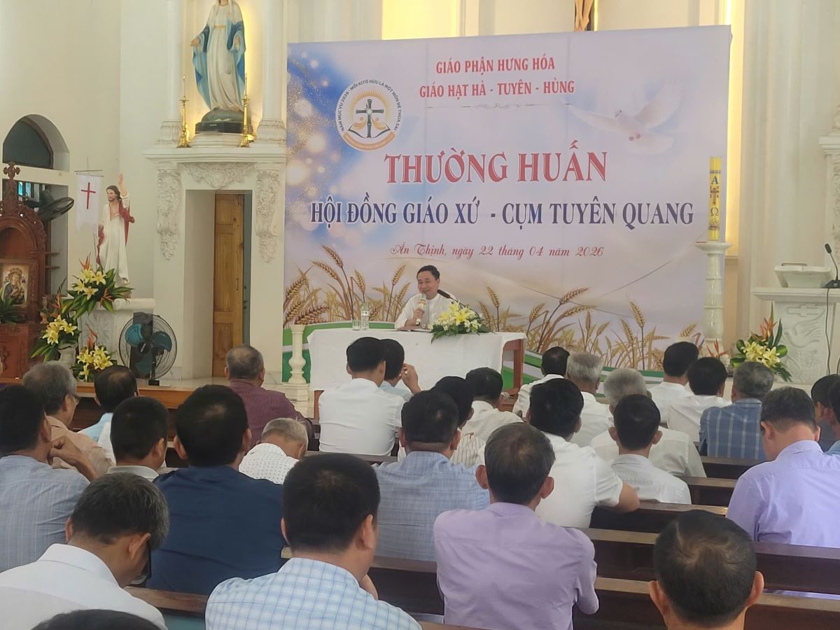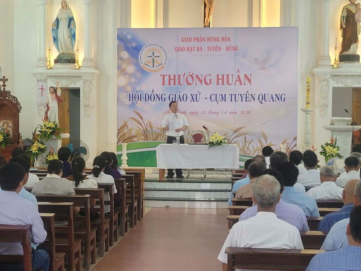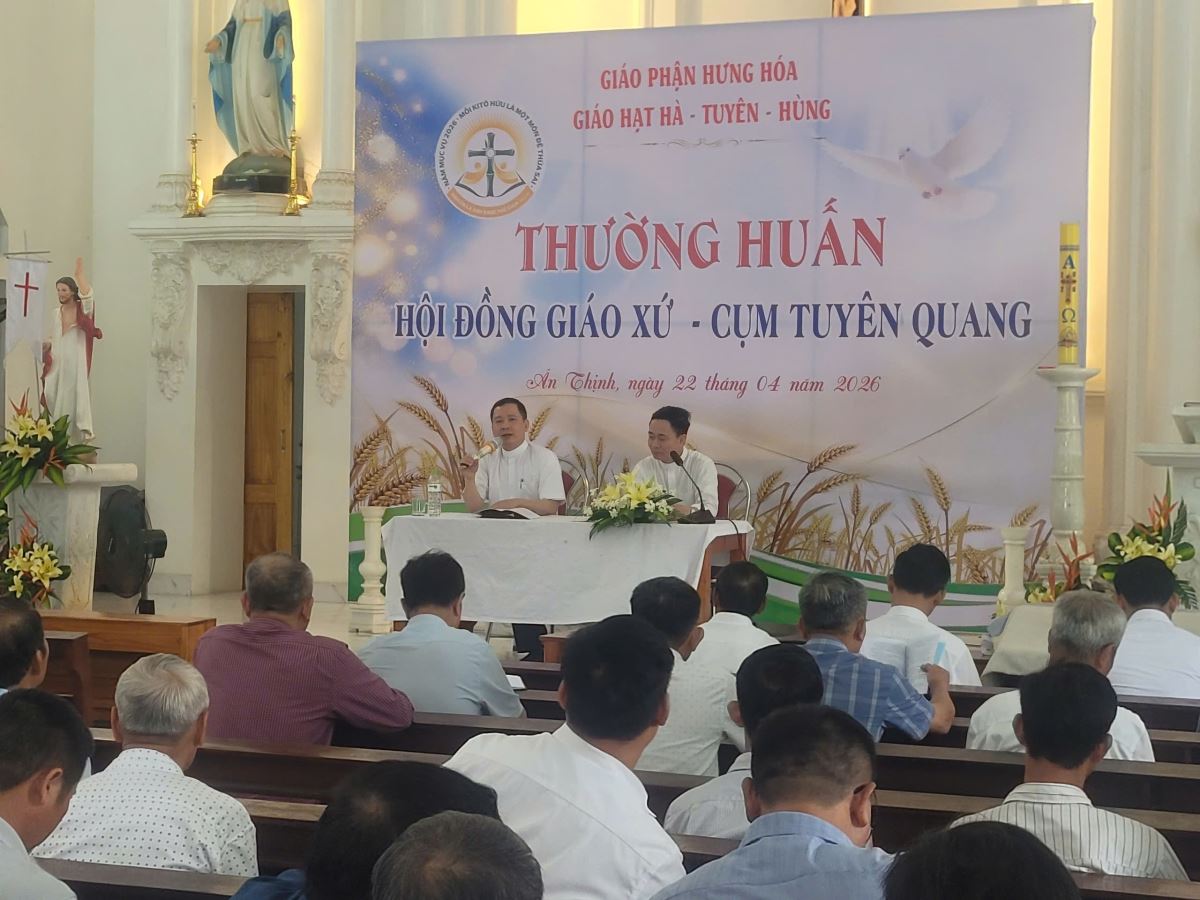 WGPHH - Vào lúc 7g30 sáng ngày 22/4/2026, tại Giáo xứ Ân Thịnh, buổi thường huấn dành cho Hội đồng Giáo xứ cụm Tuyên Quang đã được long trọng tổ chức trong bầu khí trang nghiêm và hiệp nhất. Chương trình quy tụ 120 quý chức Hội đồng Giáo xứ và Ban hành giáo đến từ các giáo xứ trong cụm, cùng sự hiện diện của Cha Giuse Đỗ Ngọc Tháp – đặc trách Ban Mục vụ Giáo dân Giáo hạt, và Cha Giuse Lâm Văn Việt – phó đặc trách Giáo xứ Ân Thịnh.
