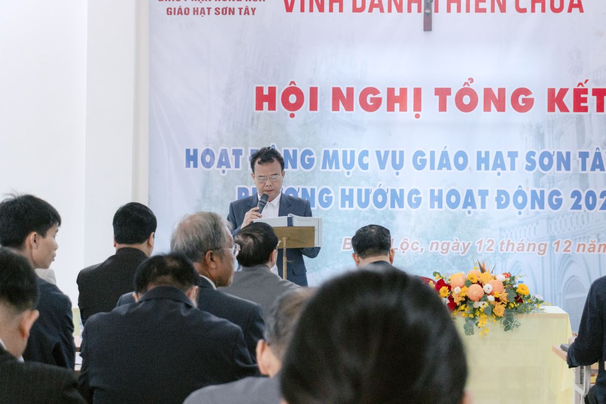 Tiếp đó, ông Giuse Kiều Trí Dũng – Trưởng Ban Chấp hành Giáo hạt trình bày bản báo cáo tổng kết năm 2025. Giáo hạt Sơn Tây hiện có 20 giáo xứ và 1 giáo họ trực thuộc Tòa Giám mục, với 112 giáo họ đang hoạt động ổn định. Trong suốt năm qua, các sinh hoạt mục vụ theo chủ đề từng tháng diễn ra nhịp nhàng và sinh động. Đặc biệt, Năm Thánh 2025 đã giúp cộng đoàn dân Chúa trở về với nguồn mạch ân sủng, đào sâu ý nghĩa hiệp hành và cùng nhau loan báo Tin mừng, để mỗi bước đi đều chất chứa tinh thần yêu thương, phục vụ và chia sẻ.