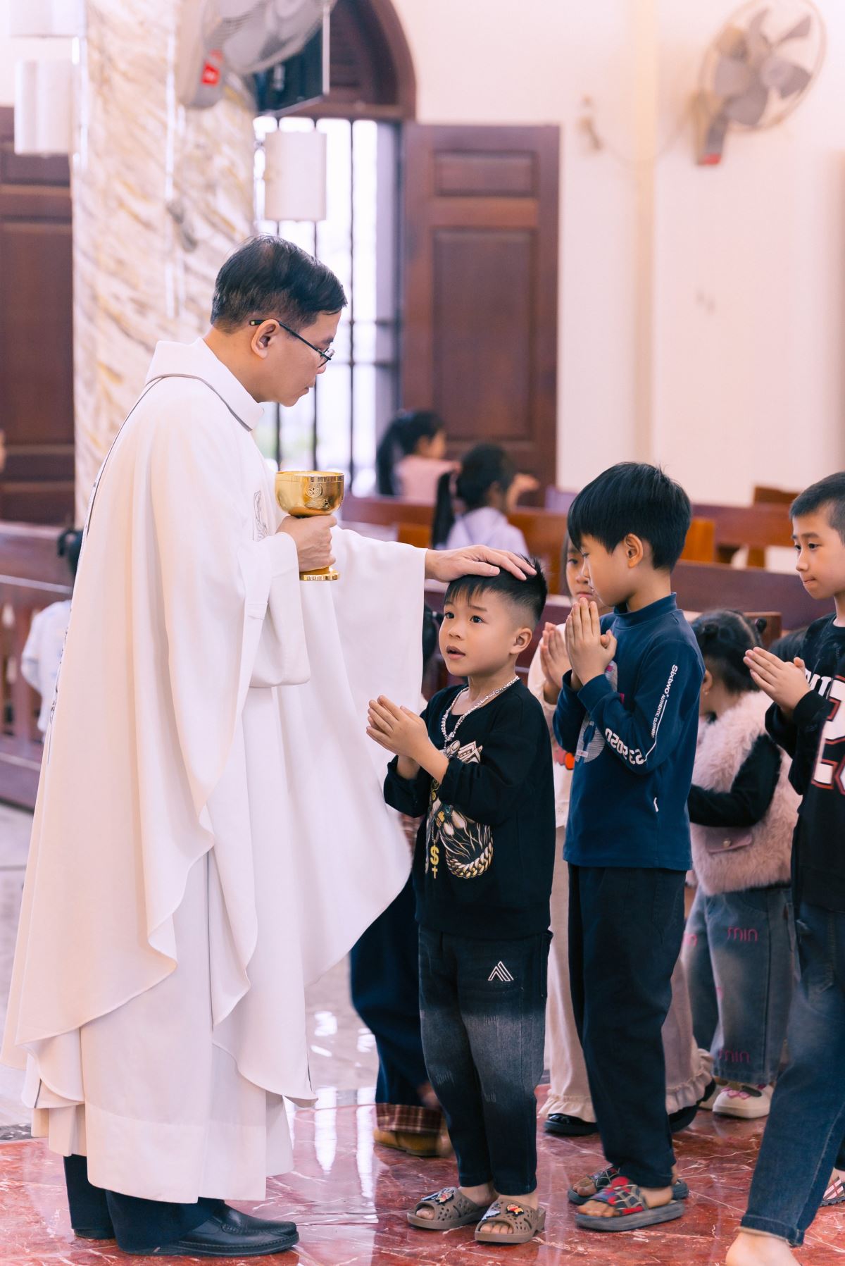 Khi đoàn rước tiến vào nhà thờ, cha chủ tế, các em lễ sinh và cộng đoàn cùng quỳ sốt sắng cất cao lời ca “Cầu Xin Ơn Chúa Thánh Thần”, tha thiết xin Ngài ngự đến, ban bình an cho thế giới, cho Giáo Hội và cho mỗi người trong cộng đoàn, đồng hành và hướng dẫn trong suốt năm mới.