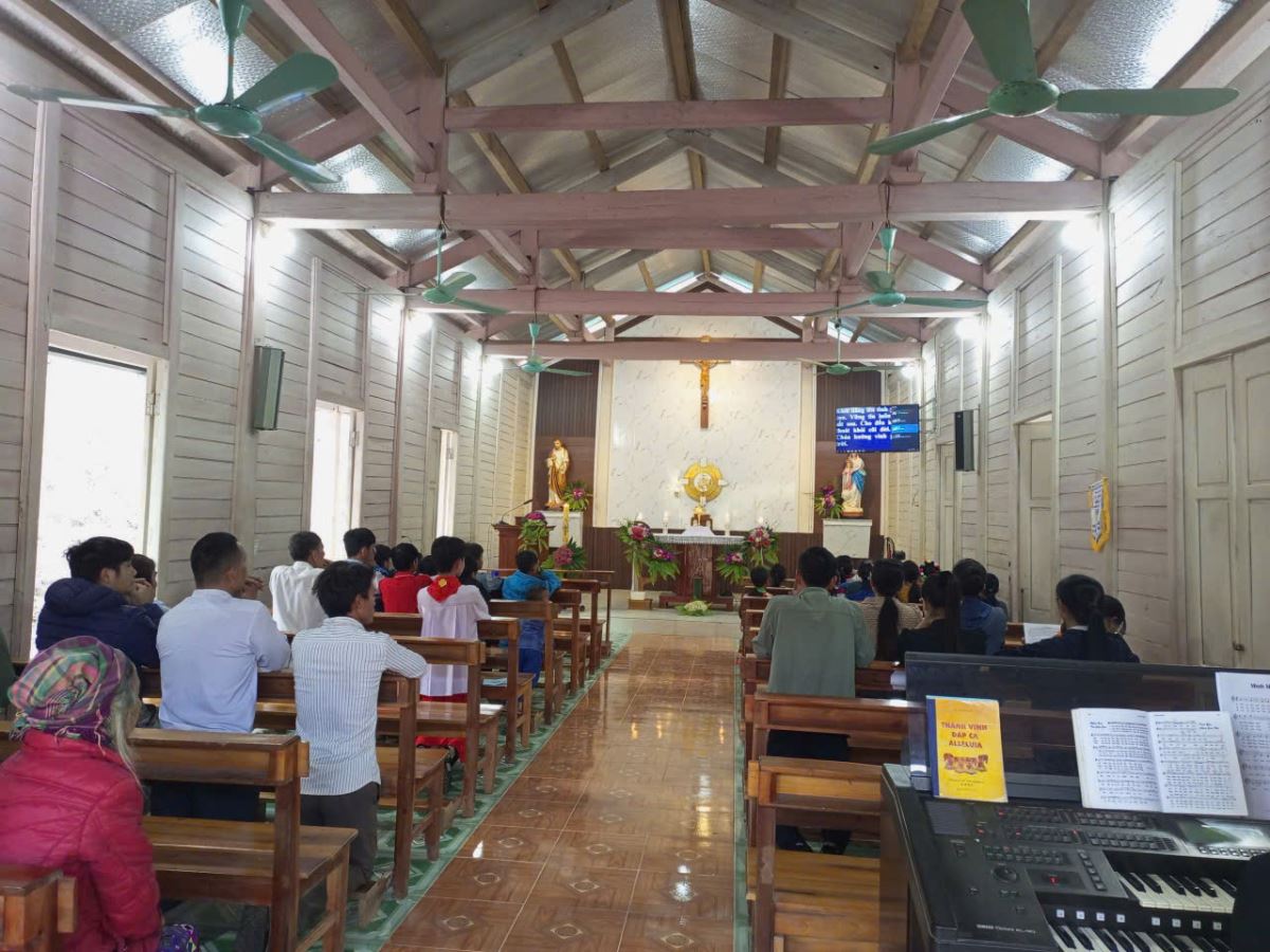 Gác lại những công việc nương rẫy, cộng đoàn quy tụ bên Chúa Giêsu Thánh Thể với lòng tạ ơn và khát khao kín múc nguồn ân sủng, bình an từ Lòng Thương Xót Chúa. Trước đó, để chuẩn bị cho ngày chầu, giáo họ đã tổ chức chầu Tam Nhật, giúp cộng đoàn dọn lòng cách sốt sắng.
