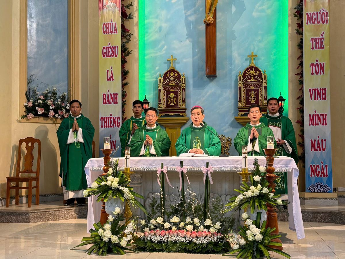 Kết thúc giờ chầu chung, vào lúc 10g00, Thánh lễ Chúa nhật V Thường Niên được cử hành trọng thể do Đức cha Đaminh Hoàng Minh Tiến chủ sự. Đồng tế với ngài có cha xứ Giuse, quý cha phó và quý cha đến từ Giáo phận Lạng Sơn.