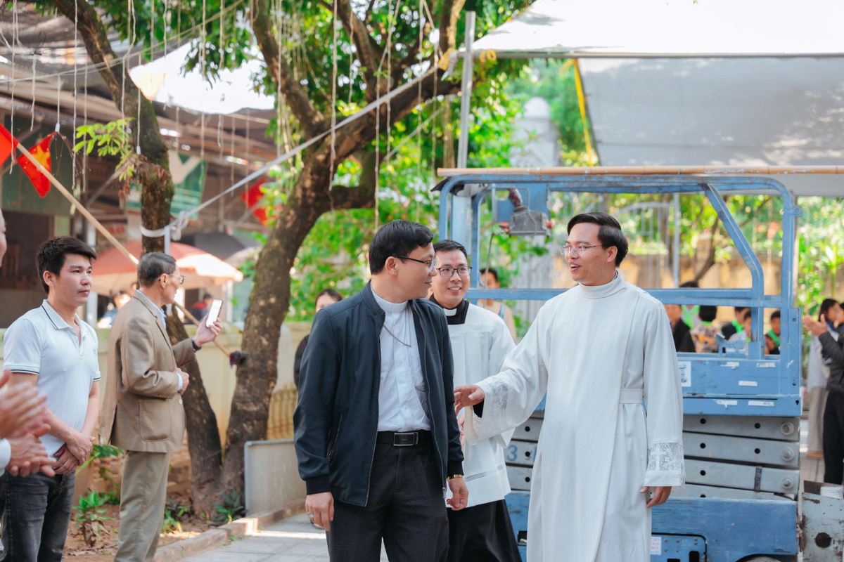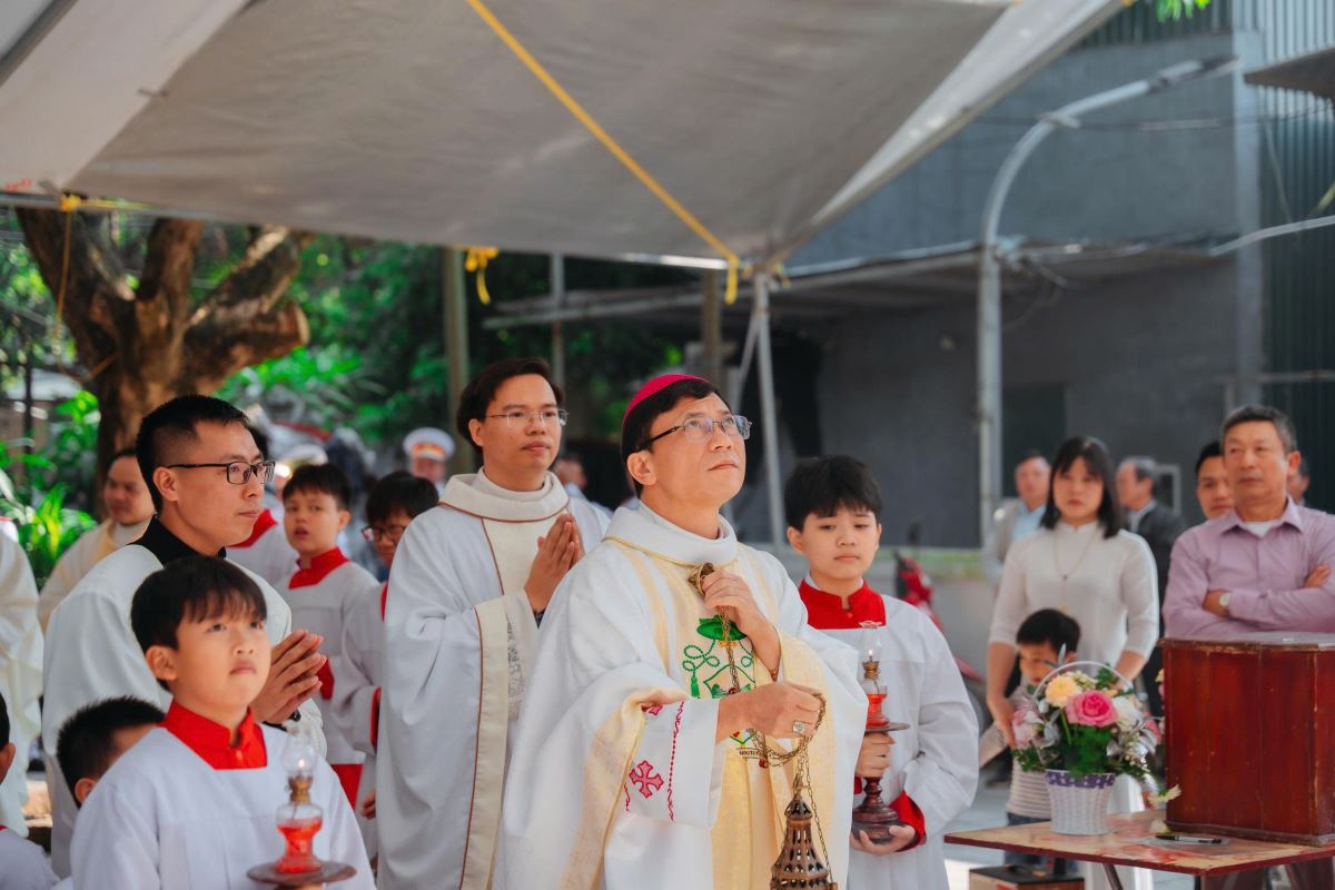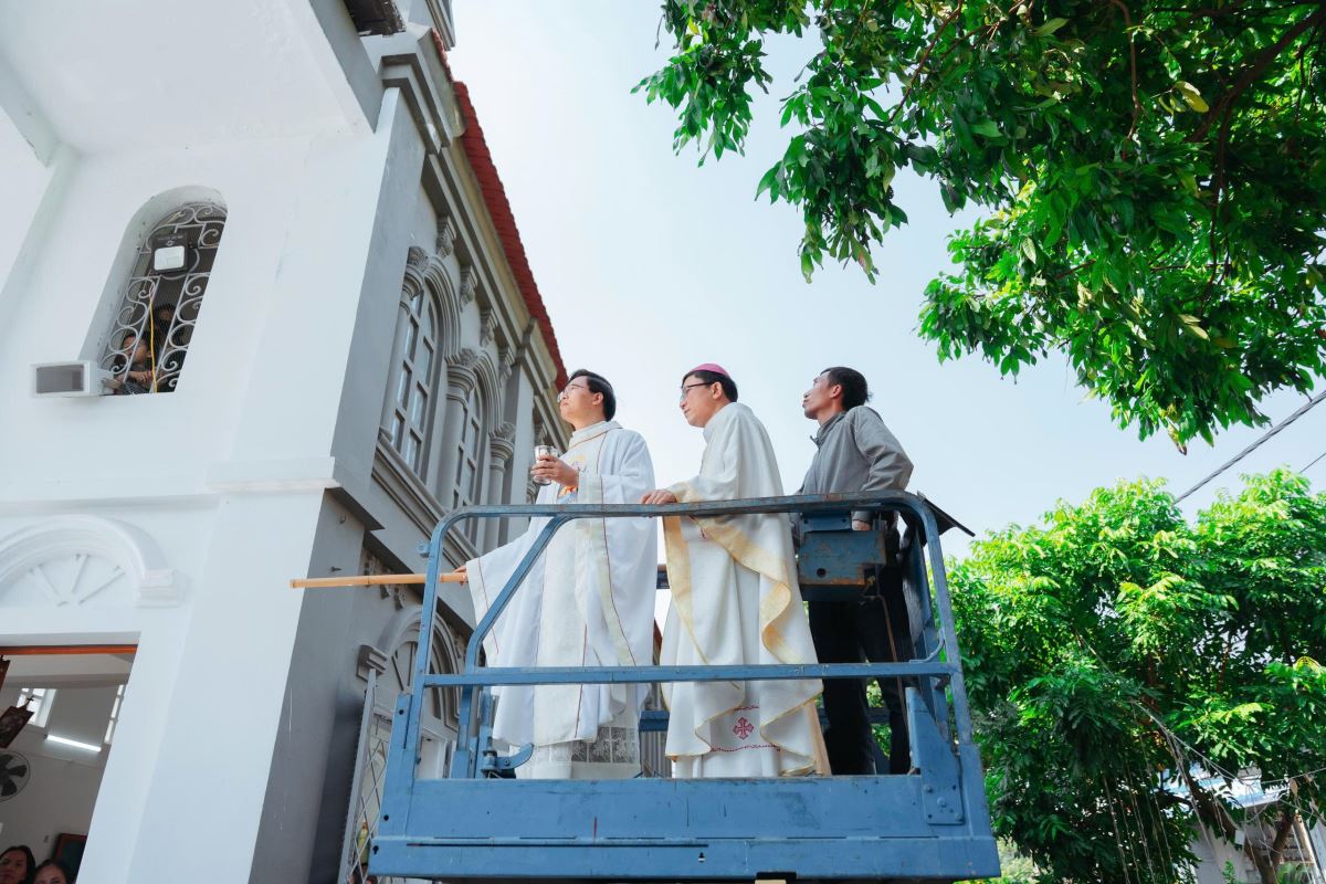 Đúng 10g00, cộng đoàn tập trung trước tháp chuông nhà thờ, tham dự Nghi thức Làm phép chuông mới do Đức Giám mục Phaolô chủ sự.