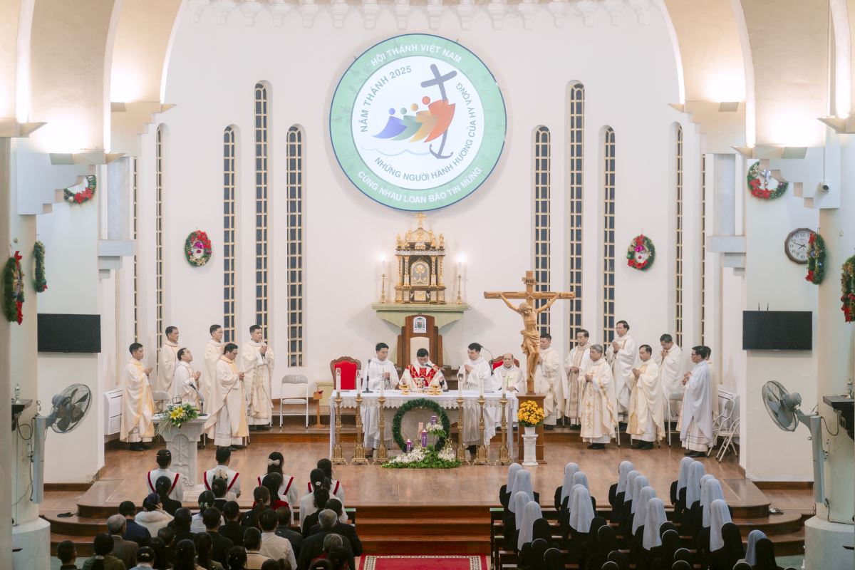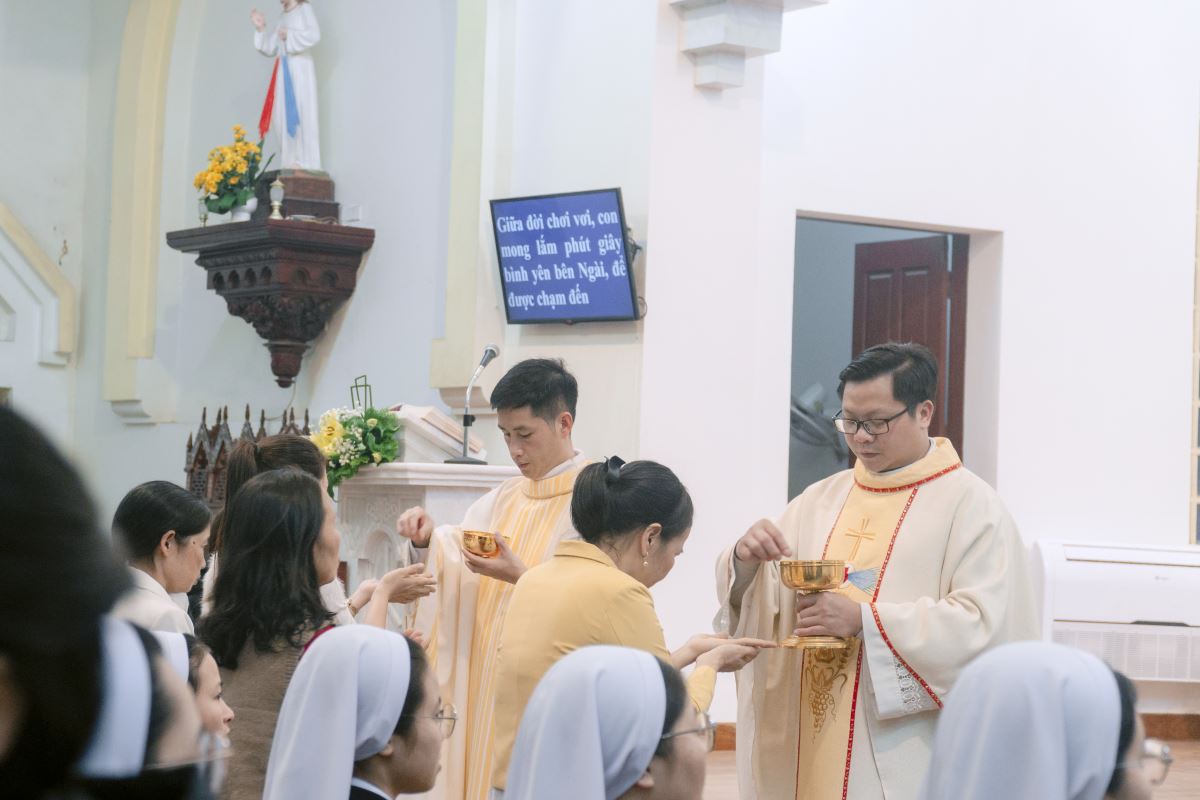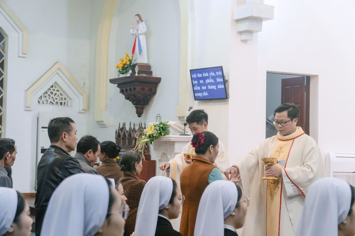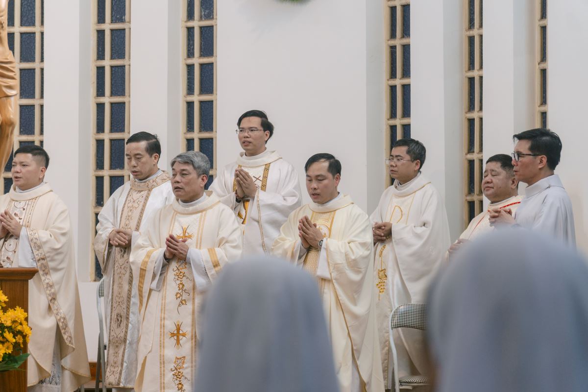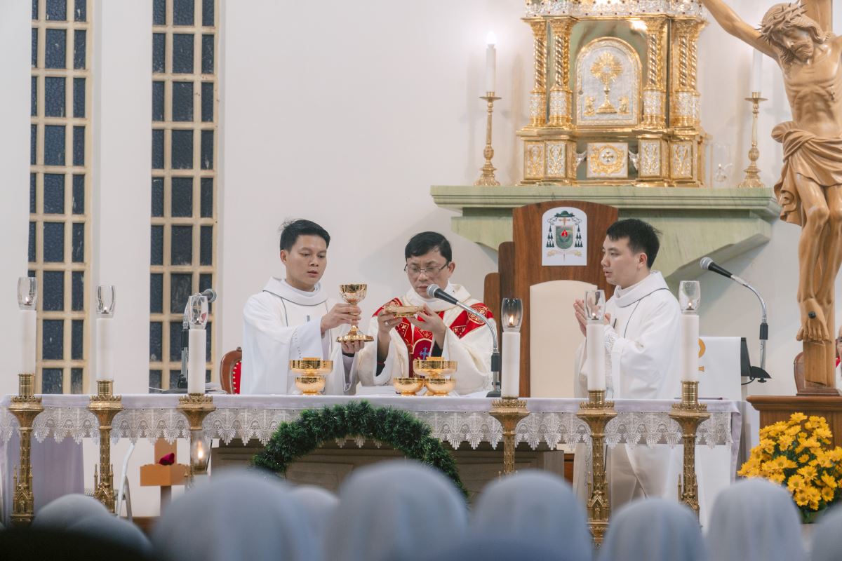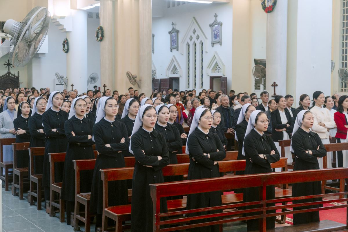 Thánh lễ do Đức cha Phaolô Nguyễn Quang Đĩnh – Giám mục Phụ tá Giáo phận chủ tế. Đồng tế với ngài có Đức cha Gioan Maria Vũ Tất – nguyên Giám mục Giáo phận, quý cha trong linh mục đoàn, cùng sự hiện diện của quý thầy, quý dì và cộng đoàn dân Chúa.
