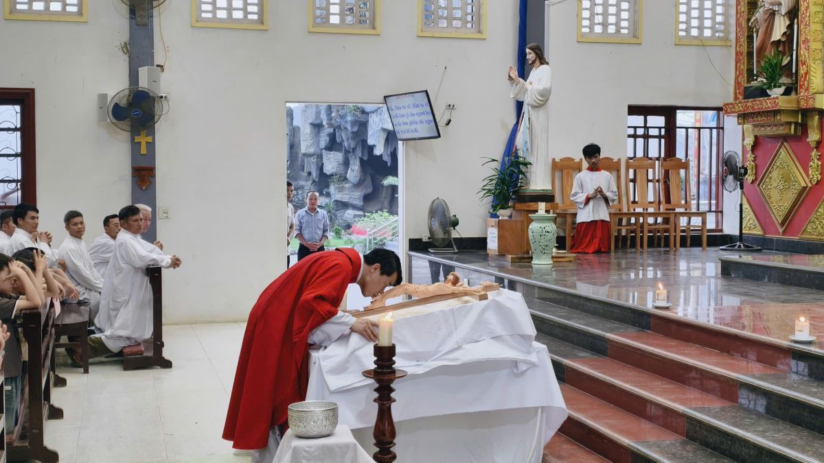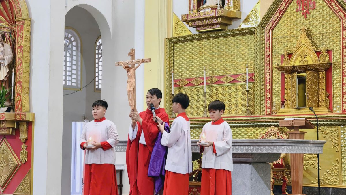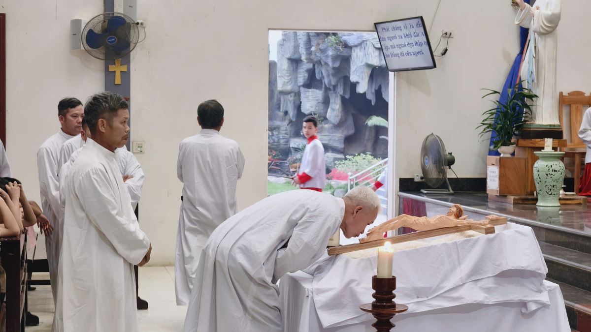 Tiếp đến là nghi thức suy tôn Thánh Giá. Trong bầu khí trang nghiêm, các tín hữu lần lượt tiến lên kính thờ Thánh Giá với lòng sốt mến.
