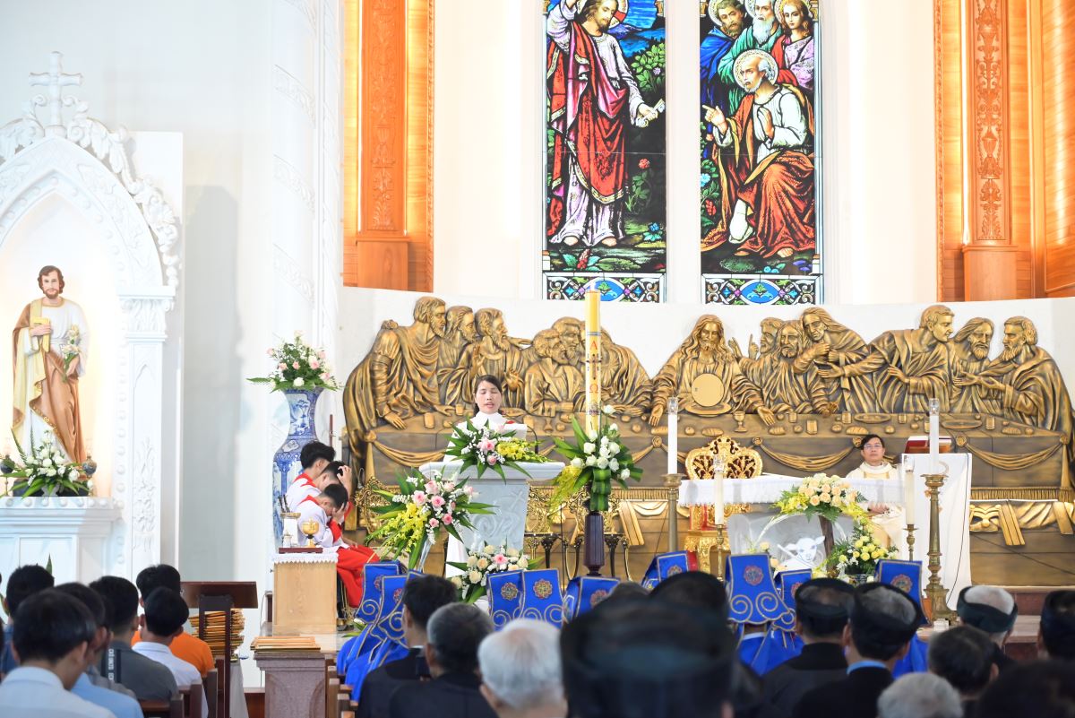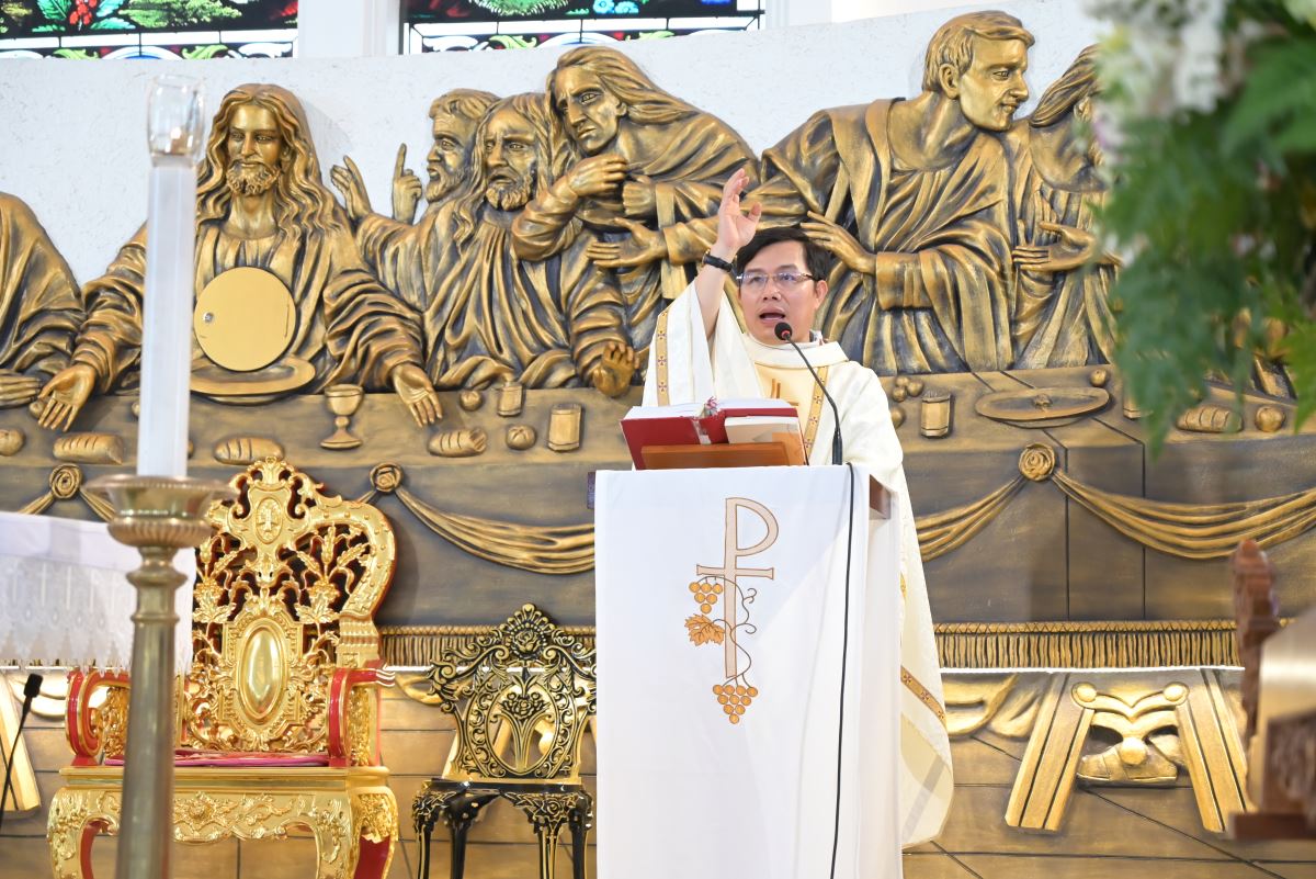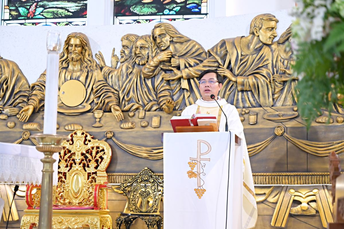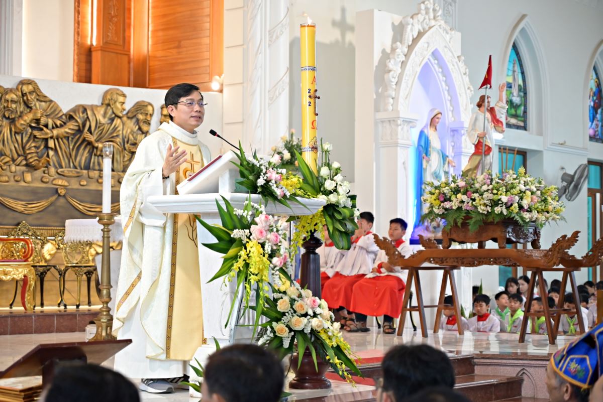 Trong bài giảng lễ, cha Giuse Nguyễn Minh Hoàng, OP mời gọi cộng đoàn trở lại ngôi mộ trống năm xưa. Theo cha Giuse hình ảnh ngôi mộ trồng gợi lên cho chúng ta hình ảnh thế giới ngày hôm nay đang trống vắng tình yêu, trống vắng niềm tin và phó thác vào Thiên Chúa. Chính sự trống vắng ấy là nguyên nhân của những xung đột của cá nhân cũng như của quốc gia, trống vắng tình yêu là nguyên nhân dẫn đến đau khổ. Giữa lúc một thế giới đầy những đau khổ nhưng chúng ta phải nhìn như Thánh Phêrô và Gioan (người môn đệ Chúa yêu). Cái nhìn của người môn đệ Chúa Giêsu là cái nhìn thấu suốt để hiểu tất cả là trật tự mà Thiên Chúa tạo ra, hơn hết luôn phải nhìn với cái nhìn hy vọng, cái nhìn cậy trông vào Thiên Chúa và cuối cùng để thấy rằng Thiên Chúa chưa bao giờ bỏ rơi chúng ta.