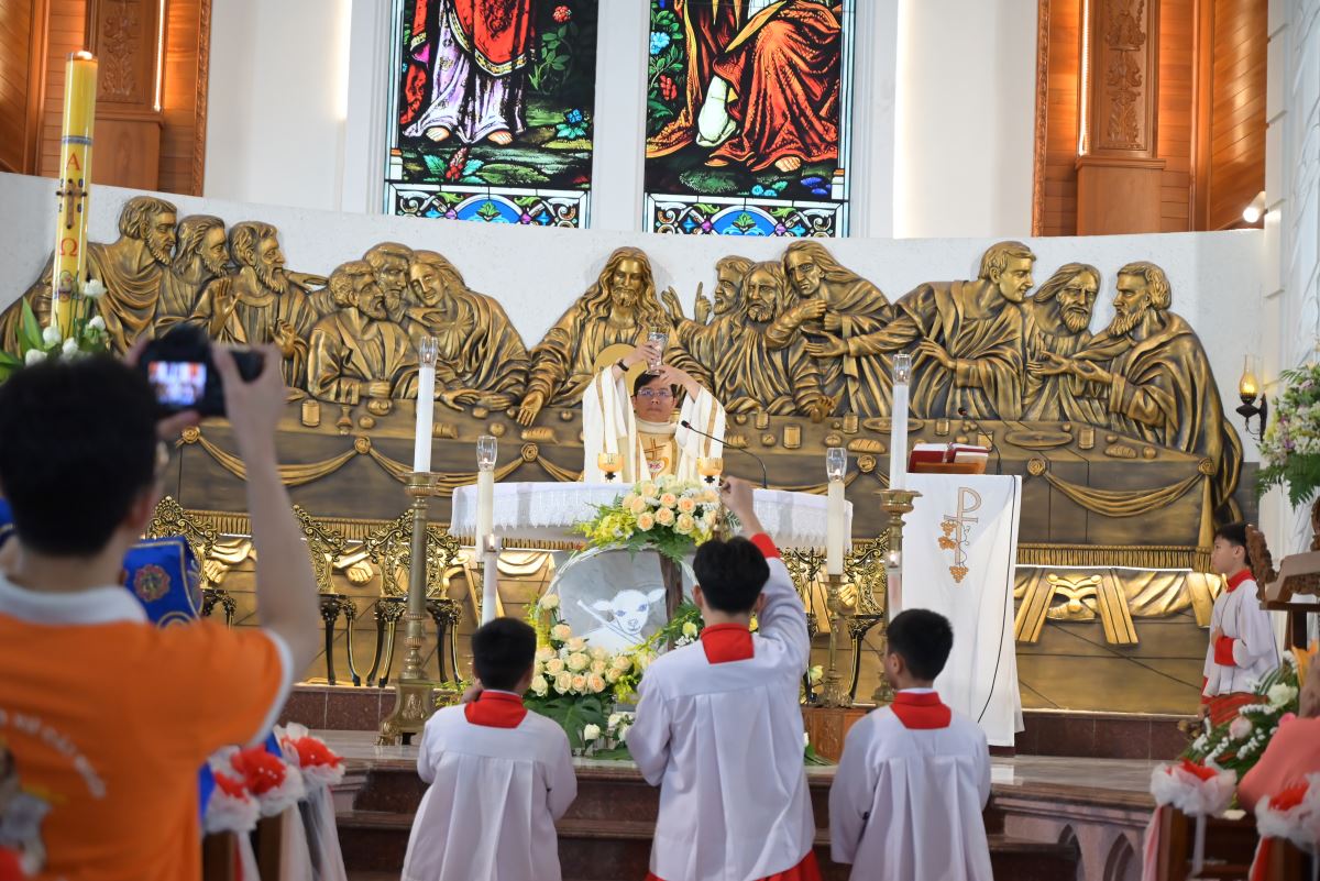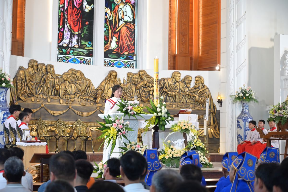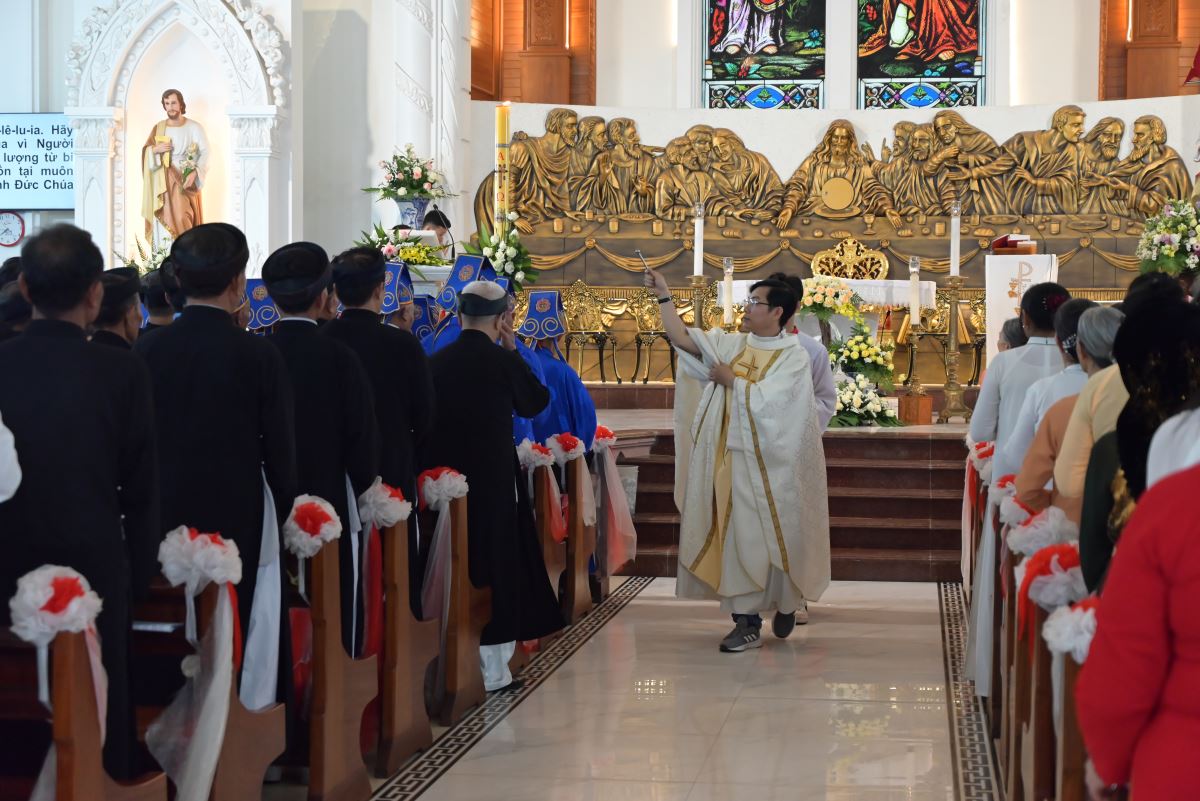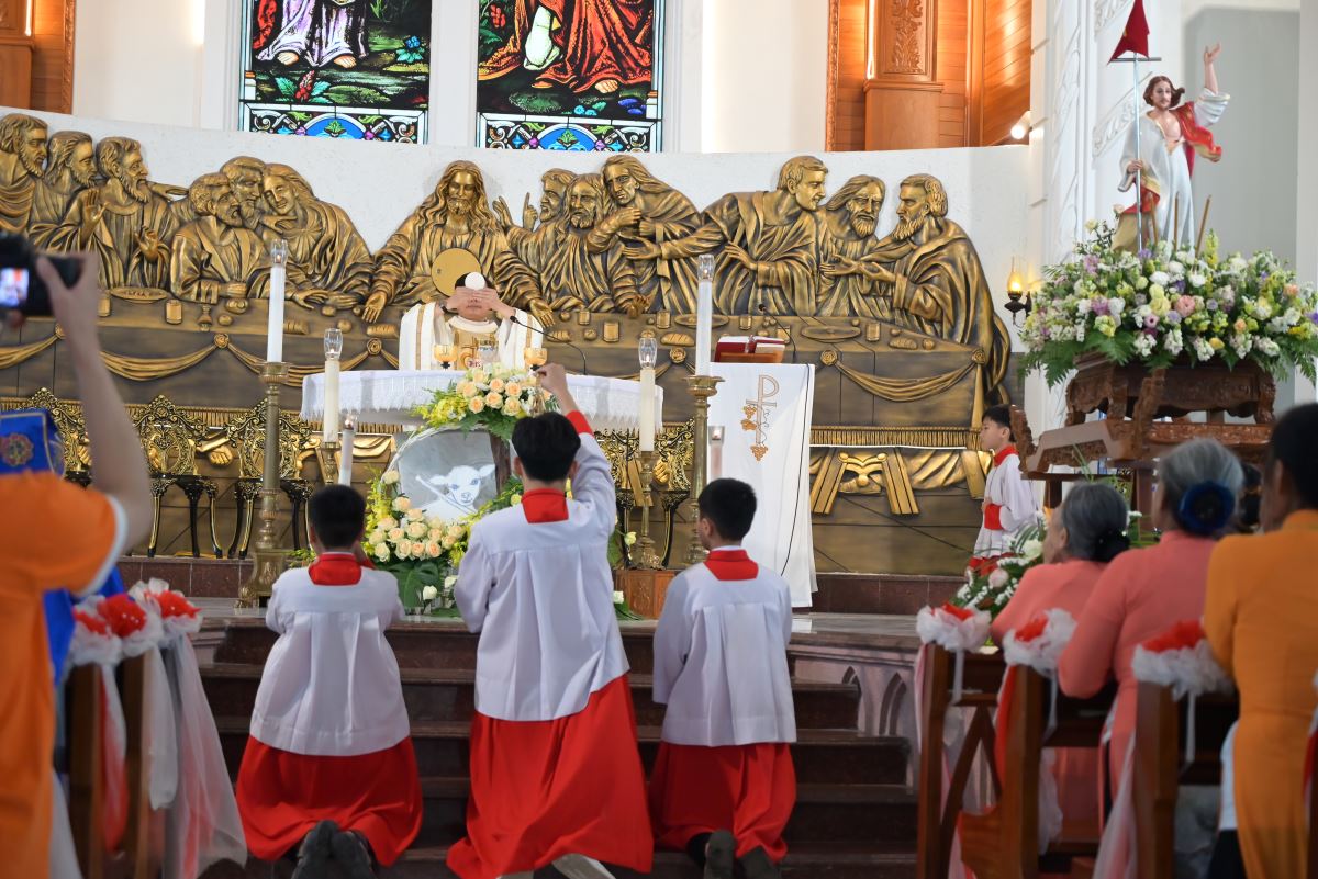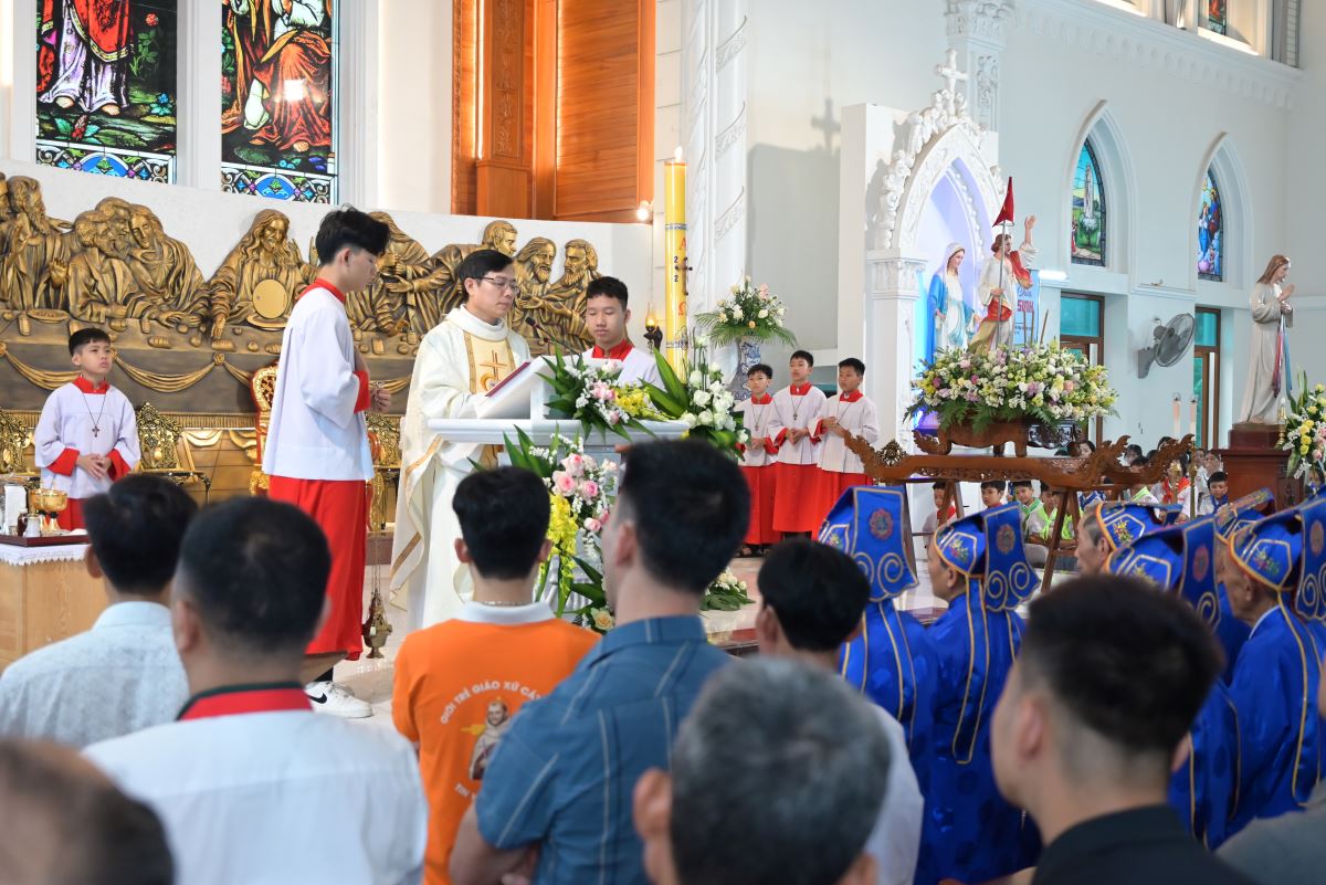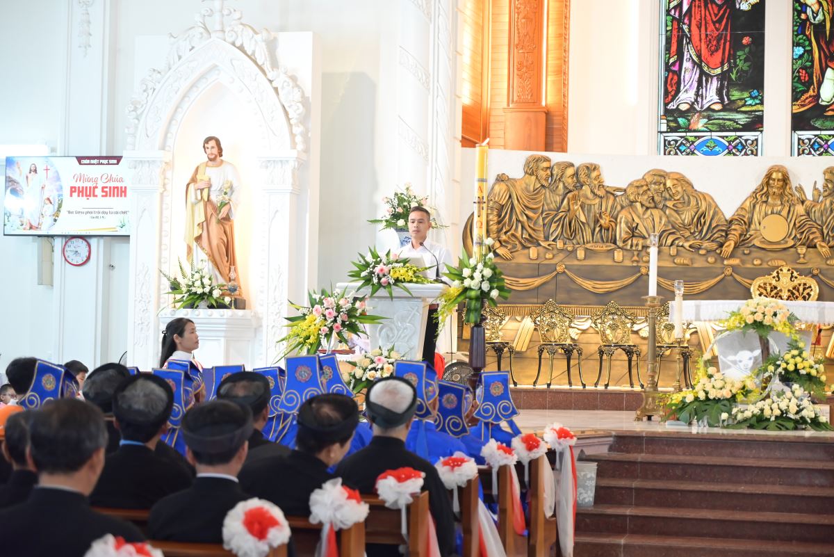 Sau cuộc rước là Thánh lễ mừng Chúa Phục Sinh. Mở đầu Thánh lễ cha Giuse Nguyễn Minh Hoàng, OP gửi lời chúc mừng Chúa Phục Sinh đến toàn thể cộng đoàn. Tiếp đến cha Giuse làm phép và rẩy nước phép lên cộng đoàn.
