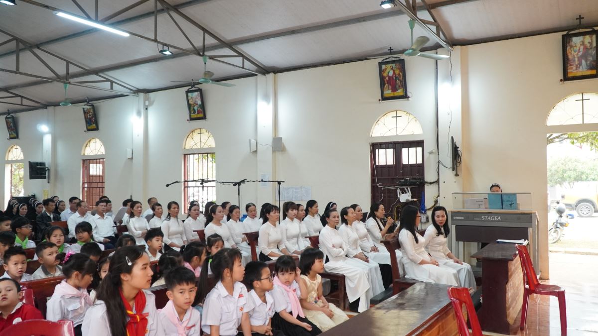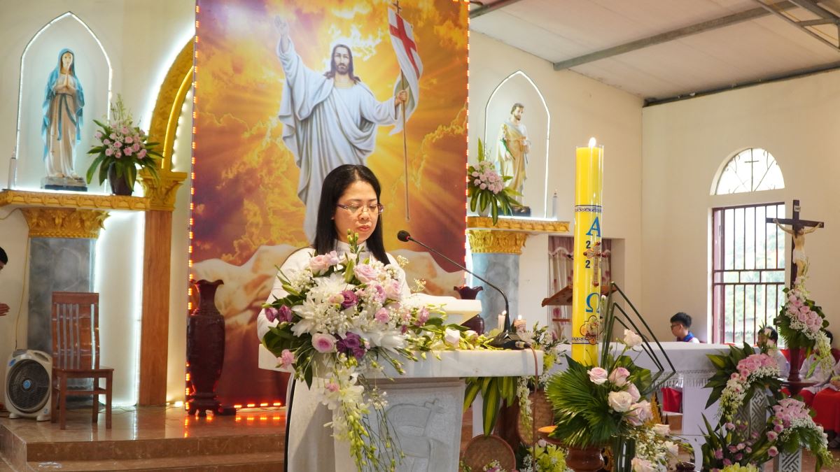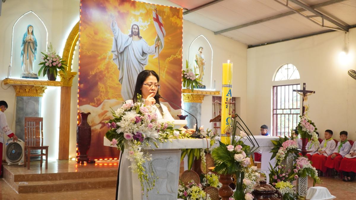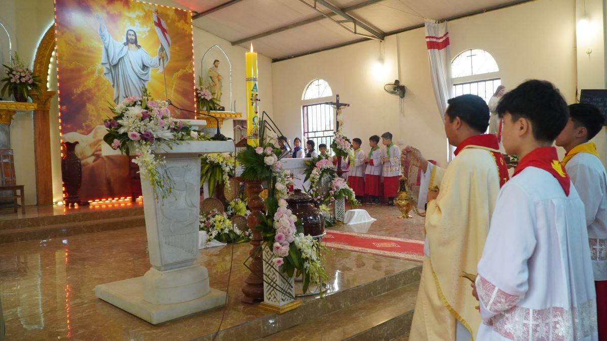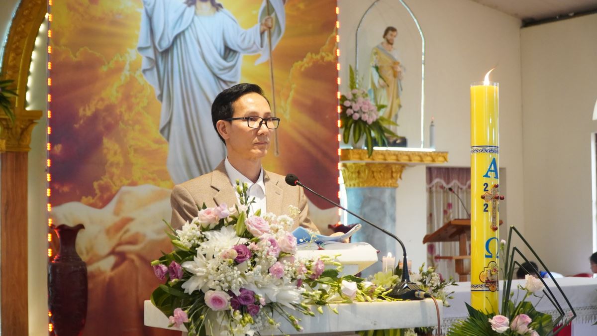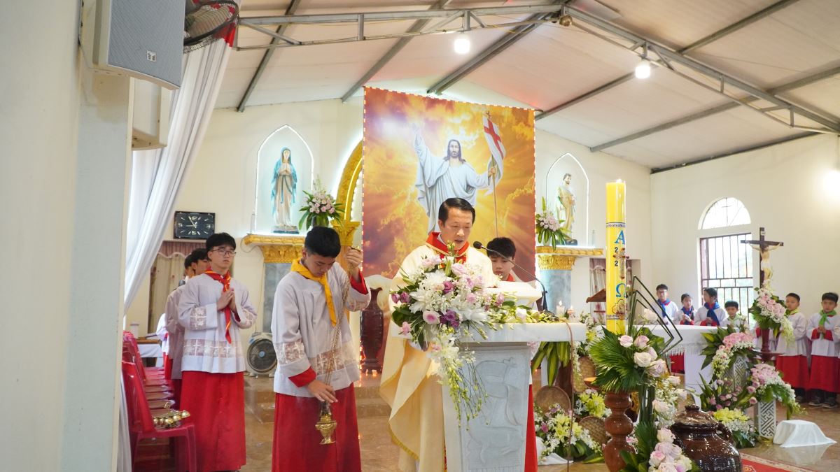 Thánh lễ cử hành lúc 08g30 do Cha xứ Phêrô Trần Văn Hương chủ tế. Trong phần chia sẻ Lời Chúa, Cha xứ mời gọi mỗi người Kitô hữu hãy để ánh sáng Phục Sinh biến đổi đời sống, mang lại hy vọng và niềm vui bình an cho gia đình cũng như bản làng vùng cao.