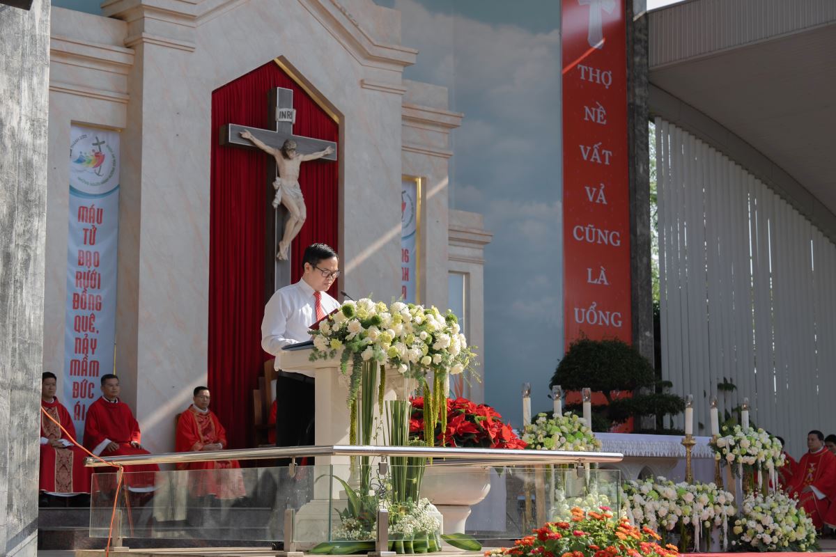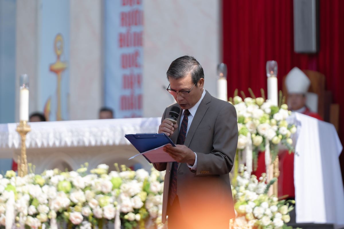 Sau lời nguyện hiệp lễ, ông Giuse Cao Đức Hoàng – Chủ tịch HĐGX đại diện cộng đoàn dâng lời tri ân Đức cha, quý cha và toàn thể quý khách.