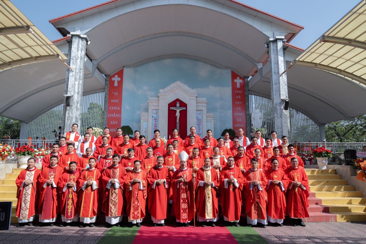 Thánh lễ kết thúc lúc 10g30. Sau bài ca kết lễ, Đức cha và quý cha chụp hình lưu niệm tại lễ đài.