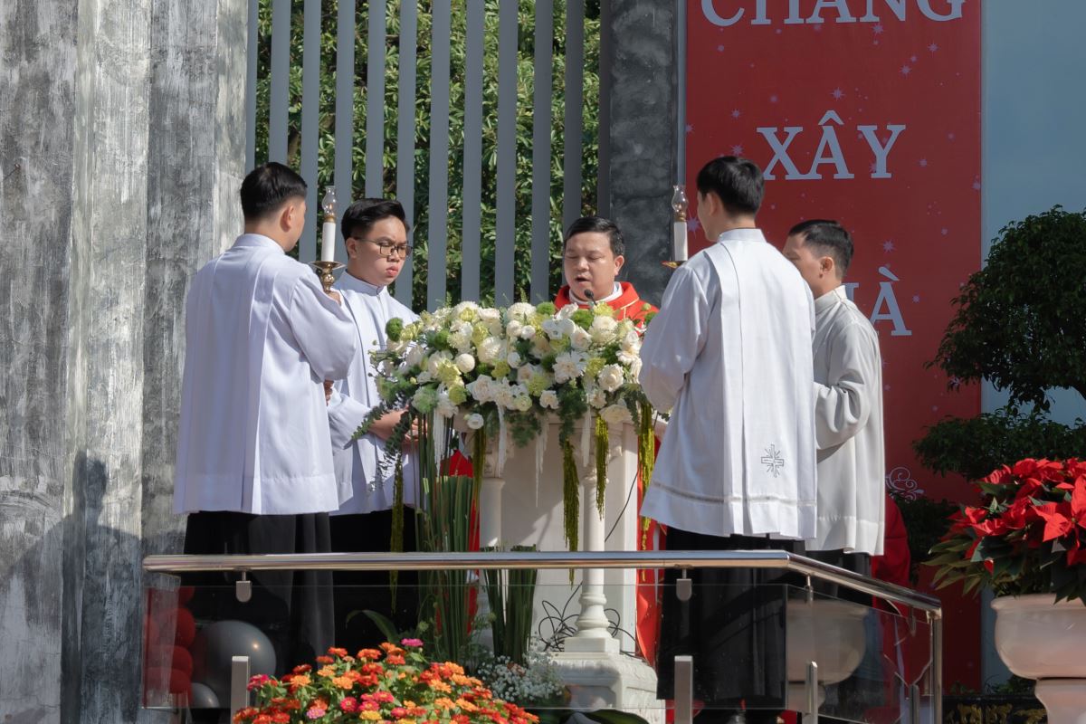 Sau lời chào đầu lễ, Đức cha làm phép diện tích khu đất xây dựng nhà thờ mới. Trong khi ngài rảy nước thánh, trên toàn khu vực công trình, ca đoàn cất vang bài thánh ca “Rảy Nước Thánh” làm cho không gian trở nên lắng đọng, diễn tả tâm tình nguyện xin Thiên Chúa thánh hóa công trình và thanh tẩy tâm hồn từng người, để cùng nhau bước vào Thánh lễ trong niềm tín thác và tri ân.