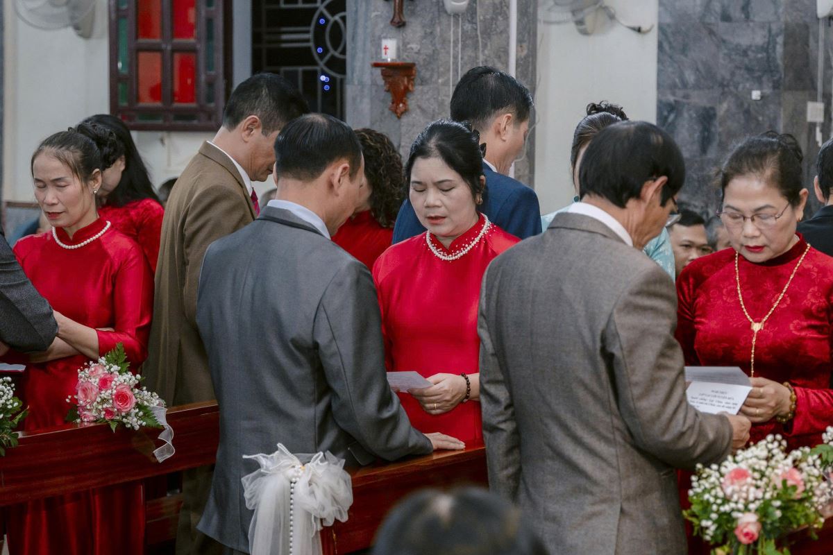 Sau bài giảng, 15 đôi vợ chồng nắm tay nhau lặp lại lời hứa hôn phối trước sự chứng kiến của cộng đoàn phụng vụ.