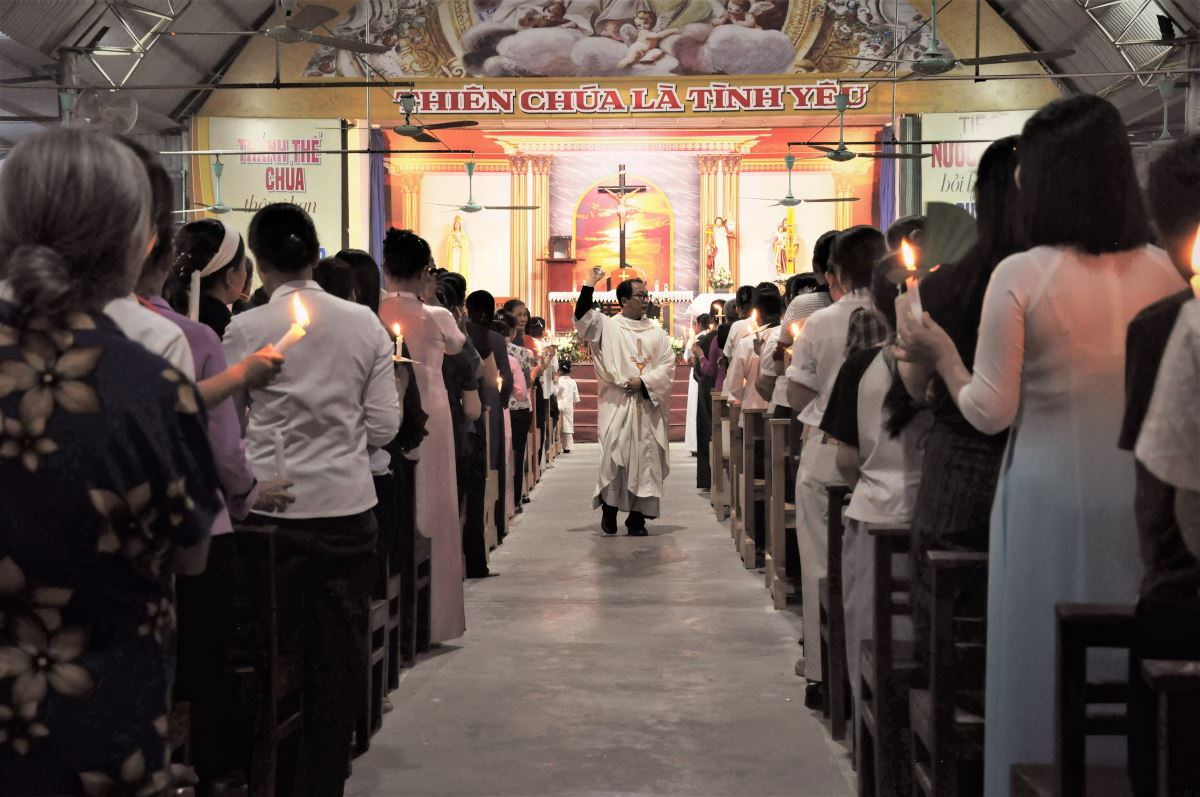 Đoàn rước long trọng tiến vào thánh đường trong tiếng tung hô: “Ánh sáng Chúa Kitô”, và nghe công bố Tin mừng Phục sinh (Exsultet).