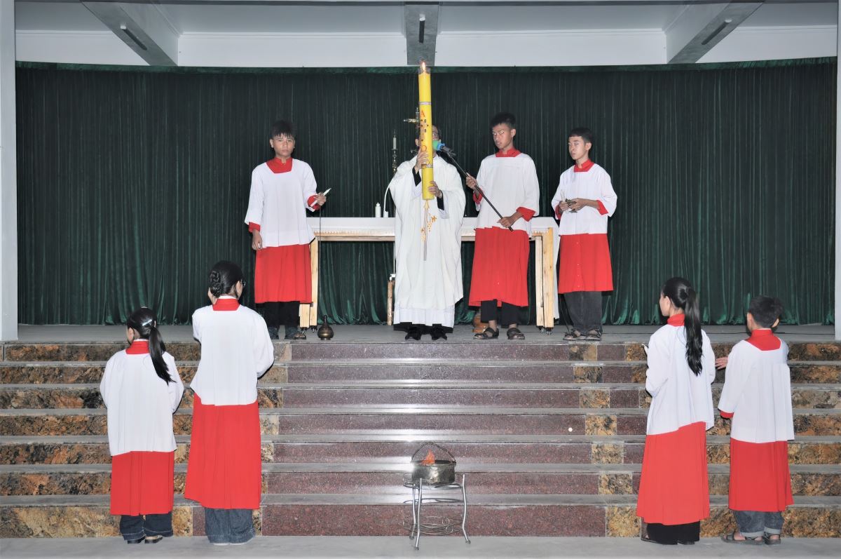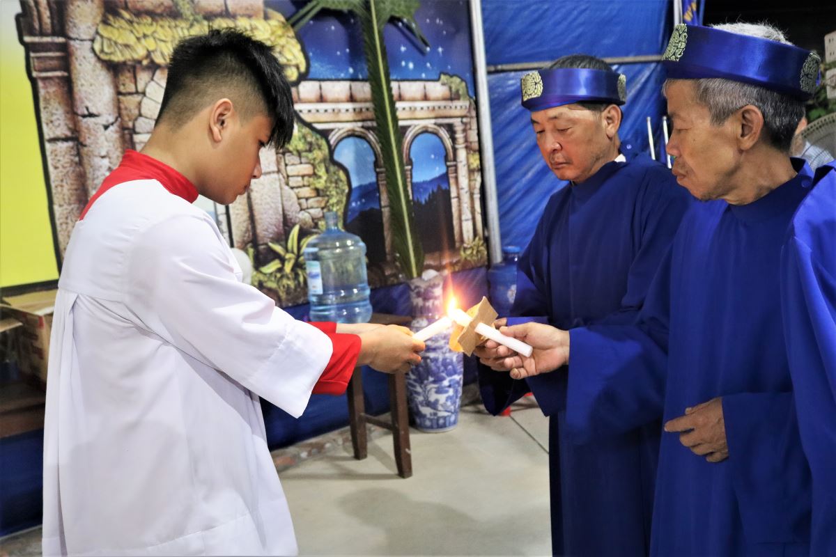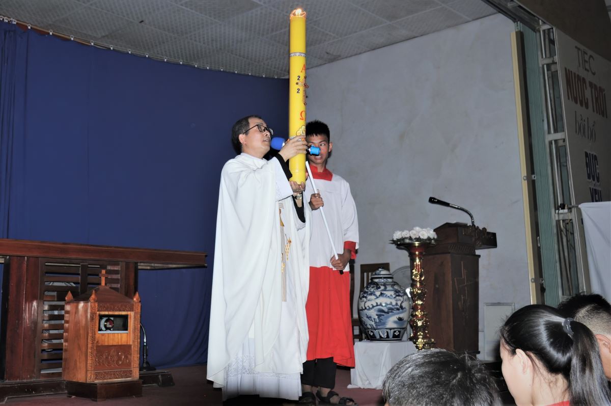 Mở đầu nghi thức, cộng đoàn quy tụ tại hội trường giáo xứ để tham dự nghi thức làm phép lửa và thắp Nến Phục Sinh.