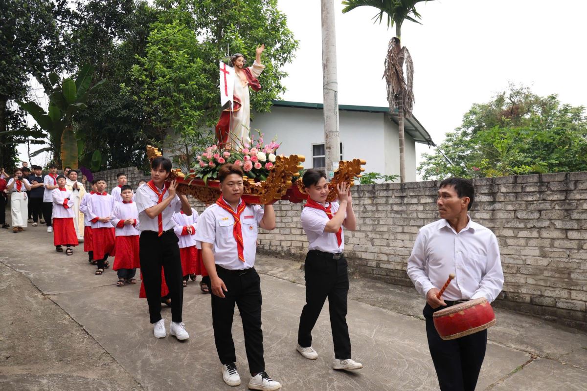 Đúng 7g30, cộng đoàn đã long trọng tham dự cuộc rước kiệu Chúa Phục Sinh, diễn tả niềm vui chiến thắng của Đức Kitô trên sự chết và tội lỗi.