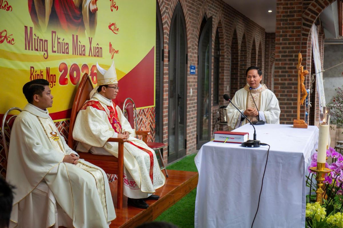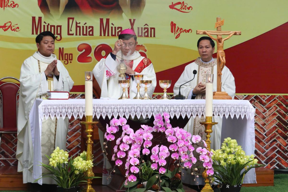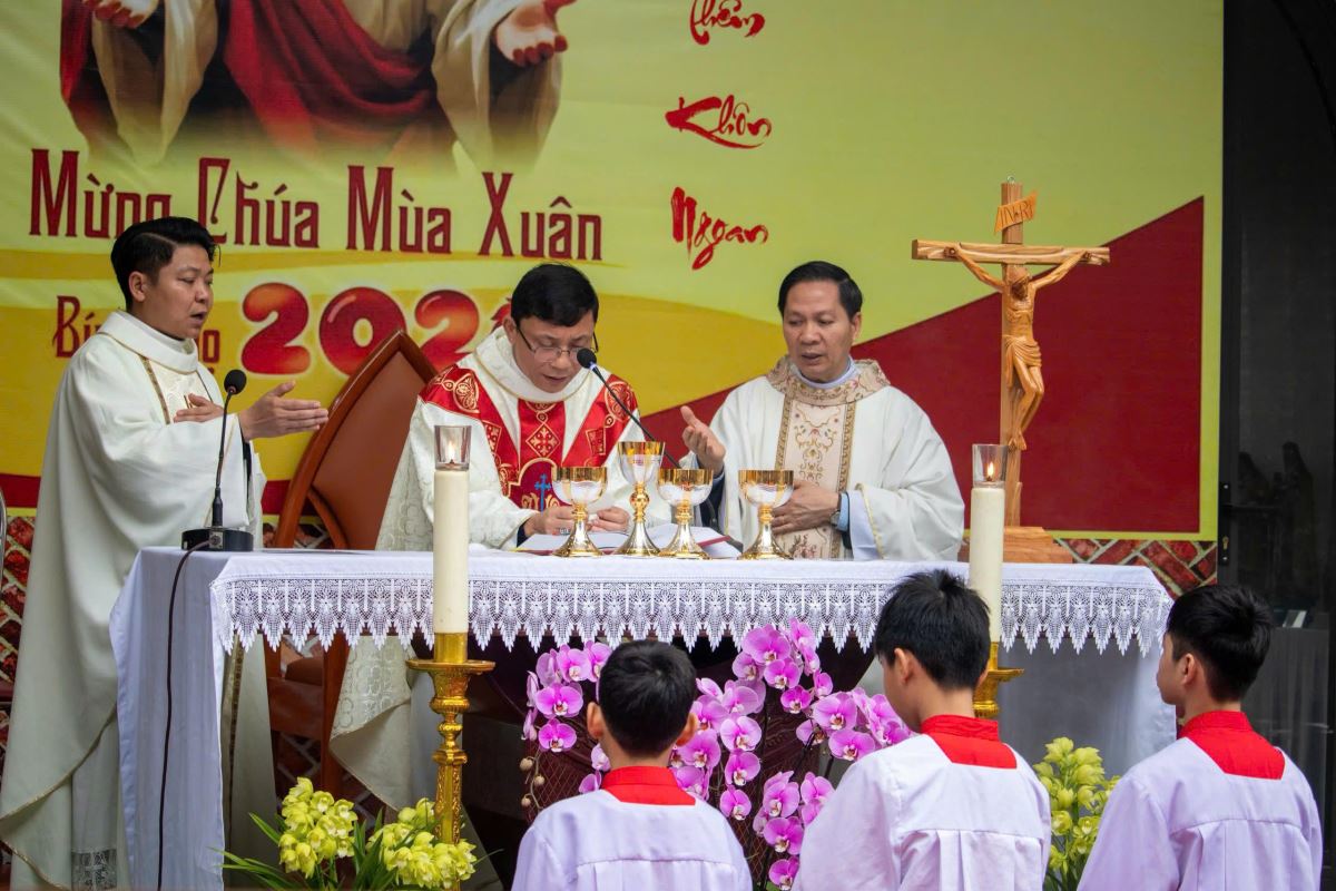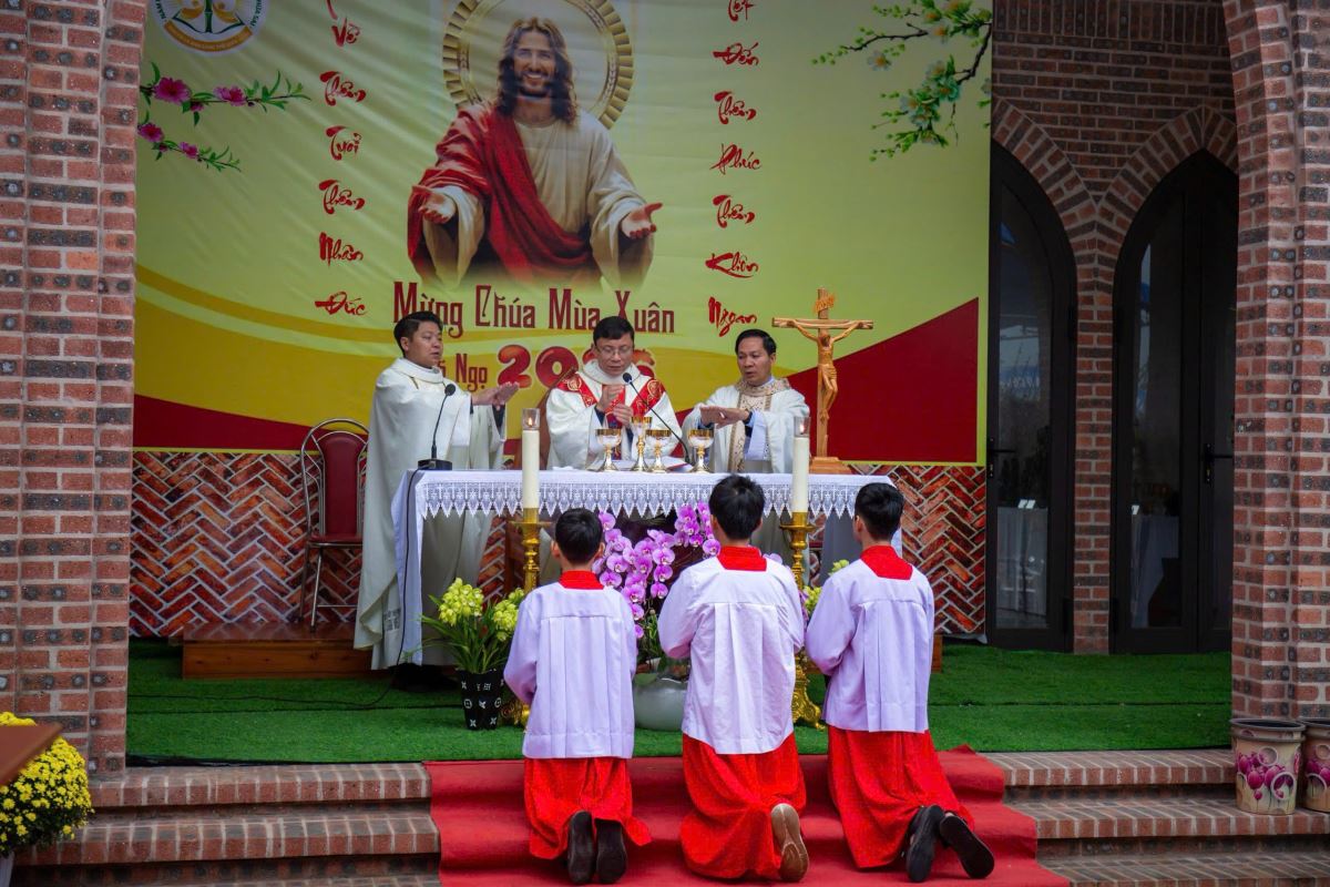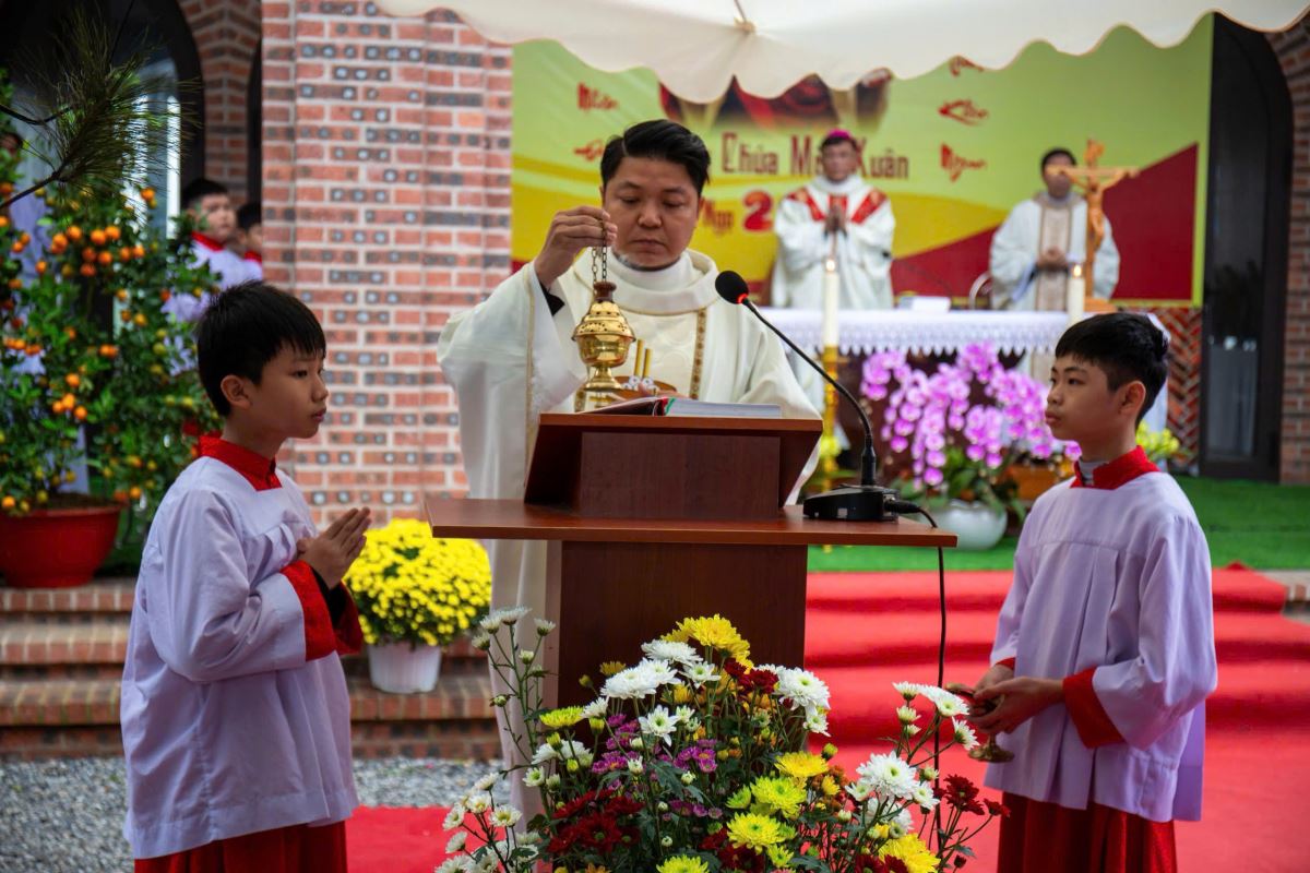 Thánh lễ do Đức cha Phụ tá Phaolô Nguyễn Quang Đĩnh chủ tế. Đồng tế với ngài có Cha xứ Giuse Nguyễn Viết Hiệp và Cha phó Phêrô Nguyễn Xuân Điệp, cùng sự hiện diện đông đảo của cộng đoàn tín hữu trong và ngoài giáo xứ. Trong bầu khí linh thiêng và sốt sắng của những ngày đầu xuân, mọi người cùng dâng lên Thiên Chúa lời tạ ơn vì muôn hồng ân năm cũ, đồng thời khiêm tốn phó dâng năm mới với biết bao dự định, ước mong và thao thức.