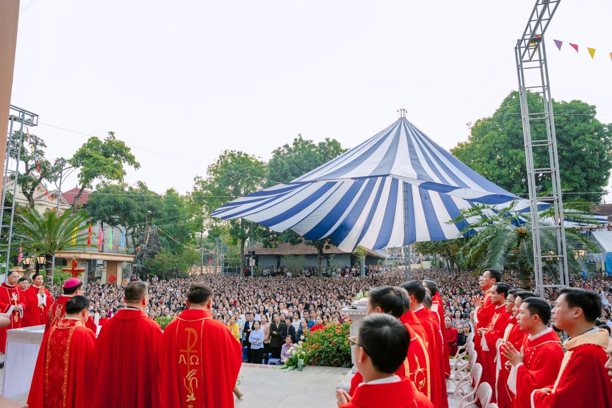 Trong bài giảng, Đức cha làm nổi bật nhân đức khôn ngoan của Thánh Phêrô Vũ Văn Truật – vị thầy giảng trẻ tuổi đã hiến trọn đời mình cho Thiên Chúa. Sự khôn ngoan ấy không chỉ thể hiện nơi lời nói đầy xác tín khi ngài dùng miệng lưỡi để làm chứng cho chân lý, nhưng còn được biểu lộ qua những chọn lựa dứt khoát trong đời sống, khi thánh nhân chọn Chúa làm phần gia nghiệp duy nhất của mình. Đỉnh cao của sự khôn ngoan ấy chính là lòng trung tín đến cùng, được thể hiện qua việc can đảm vác thánh giá và sẵn sàng hy sinh mạng sống vì đức tin. Từ gương sáng của thánh bổn mạng, Đức cha mời gọi cộng đoàn, cách riêng các giáo lý viên hôm nay biết chọn Chúa làm lẽ sống, trung thành với đức tin và can đảm sống Tin Mừng, để trở nên những chứng nhân sống động cho thế hệ trẻ.