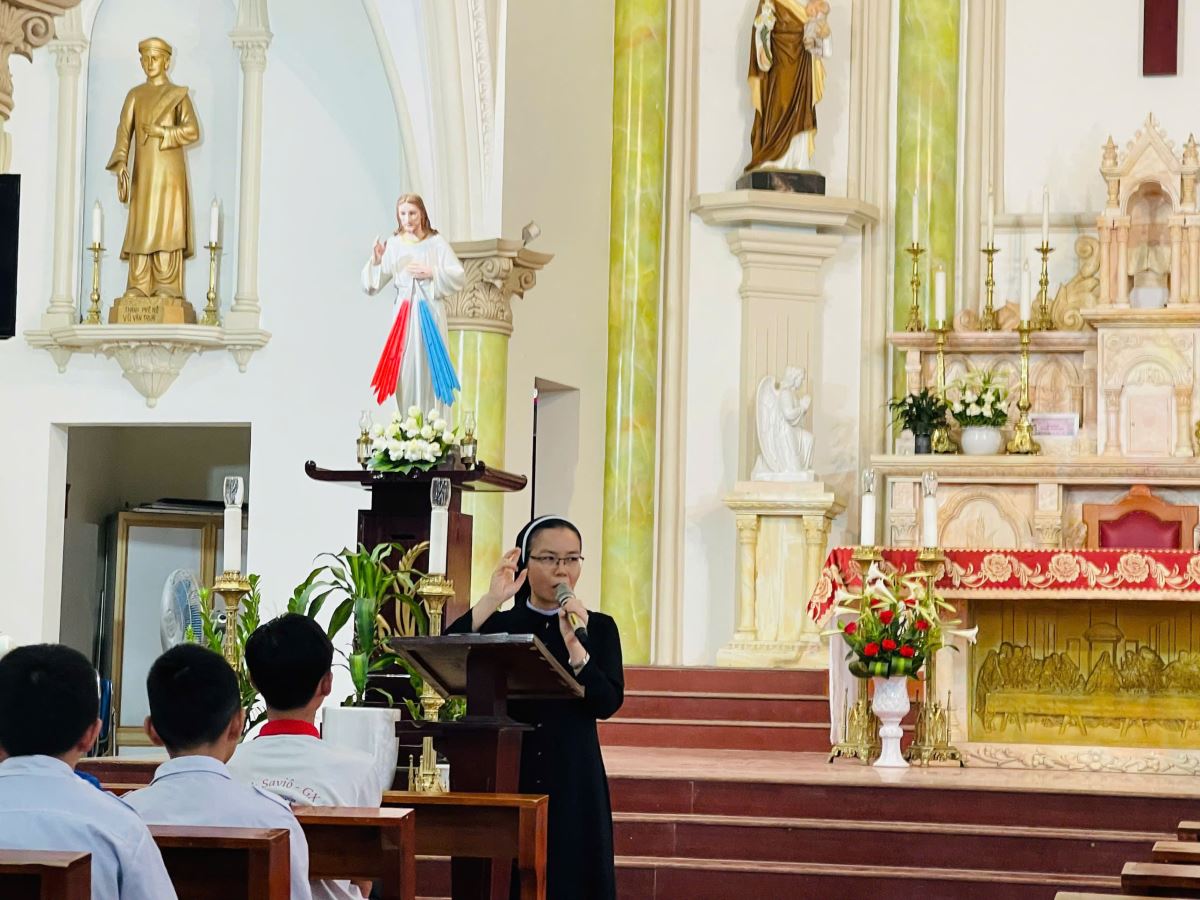 Từ 15g15 đến 16g30, dì Tê-rê-sa Nguyễn Thị Hộ và dì Maria Hoàng Minh Anh, thuộc Hội dòng Mến Thánh Giá Hưng Hóa, đã có những chia sẻ gần gũi và thực tế về hành trình dâng hiến, giúp các em hiểu rõ hơn về đời sống tu trì cũng như những niềm vui và thử thách trên con đường theo Chúa. Xen kẽ trong phần chia sẻ là các hoạt động sinh hoạt như Đố vui Kinh Thánh và tìm Ơn gọi có quà, tạo bầu khí sôi nổi, vui tươi và tăng thêm sự gắn kết giữa các tham dự viên.