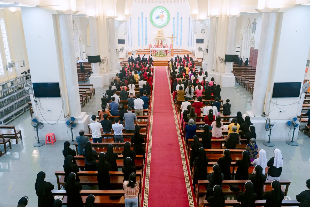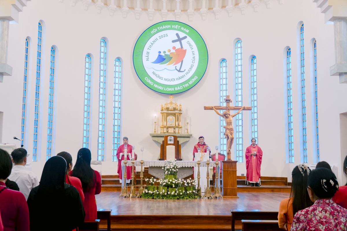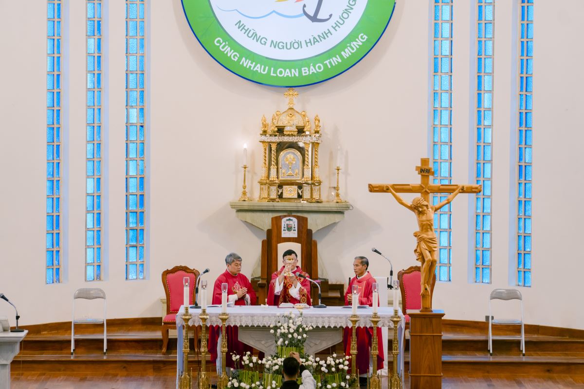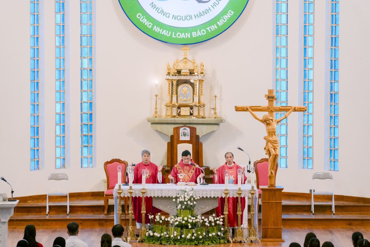 Lúc 10g05, Thánh lễ mừng kính Các Thánh Tử đạo Việt Nam được cử hành long trọng do Đức cha Phaolô chủ tế. Đồng tế với ngài có cha Anrê Phùng Văn Thành và cha xứ Sơn Lộc – Giuse Nguyễn Đình Tuyến. Mở đầu Thánh lễ, Đức cha mời gọi cộng đoàn cầu nguyện đặc biệt cho Giới Giáo chức, để từng thành viên và gia đình luôn chu toàn sứ vụ cao quý mà Thiên Chúa trao phó.