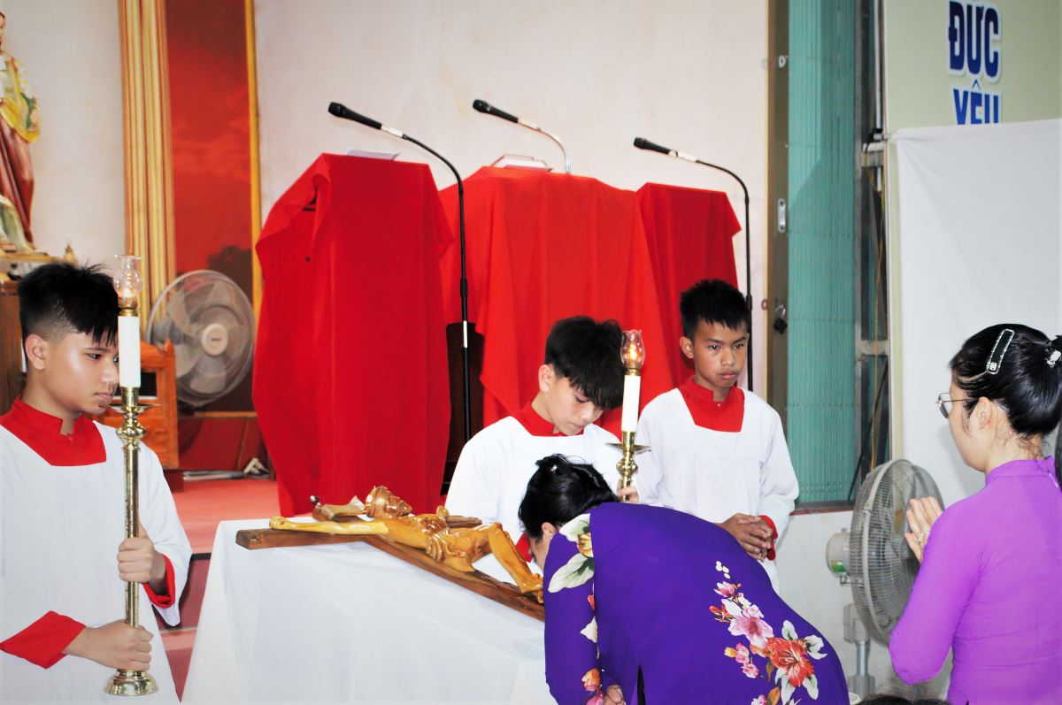 Tiếp nối tâm tình đó, vào lúc 19g30 cùng ngày, cộng đoàn giáo xứ đã quy tụ tham dự nghi thức tưởng niệm cuộc thương khó của Chúa. Nghi thức được cử hành cách trang nghiêm với phần phụng vụ Lời Chúa, lời nguyện chung và đặc biệt là nghi thức tôn vinh Thánh Giá.