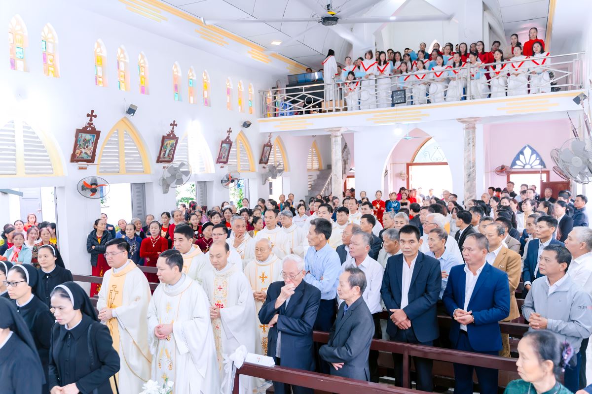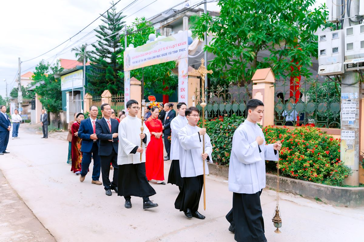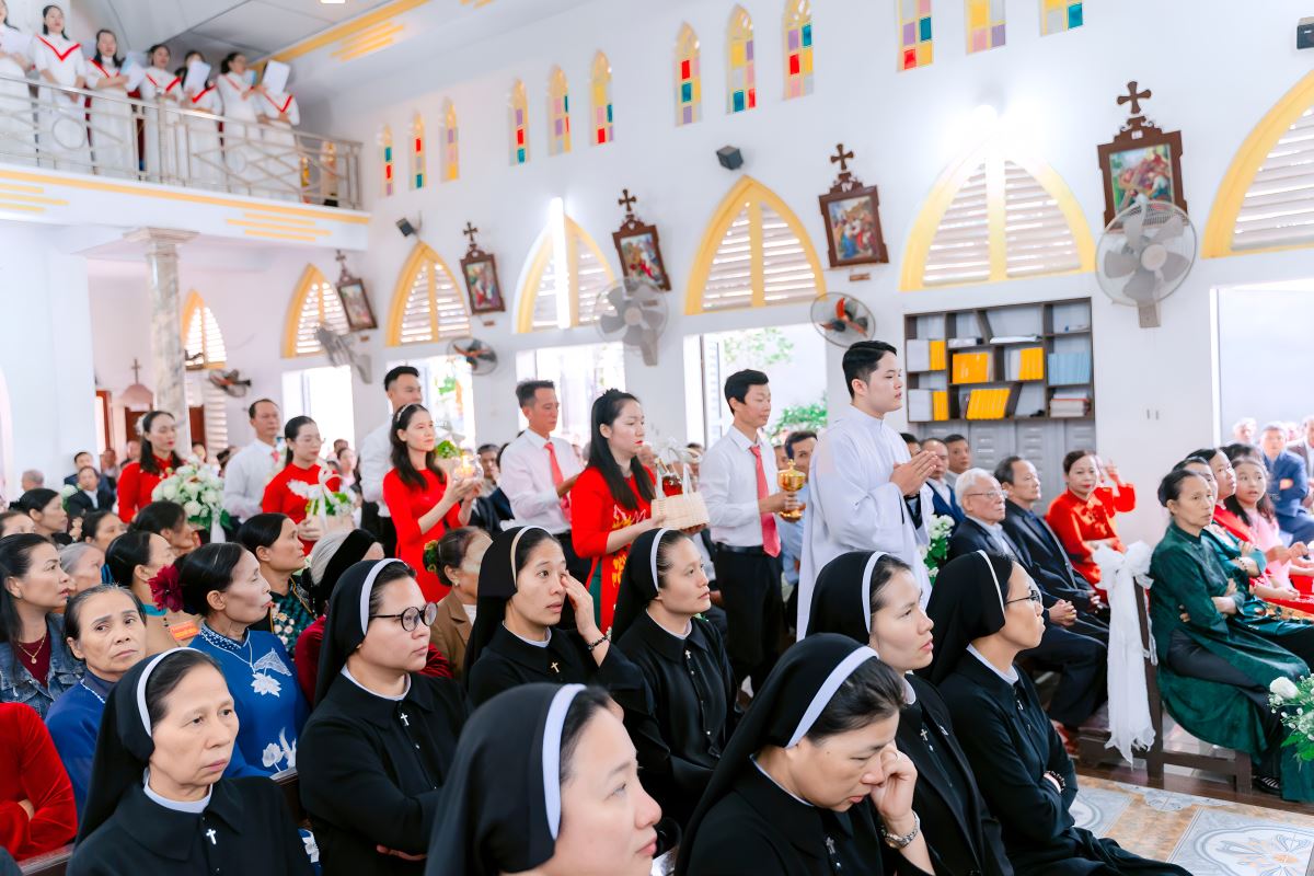 Đúng 09g00, đoàn rước đồng tế trang nghiêm tiến vào thánh đường trong tiếng kèn trống và lời ca hân hoan của ca đoàn. Cùng hiệp dâng Thánh lễ với Tân linh mục Giuse có sự hiện diện của quý Cha quê hương, quý Cha trong và ngoài giáo hạt, cùng đông đảo tín hữu gần xa.