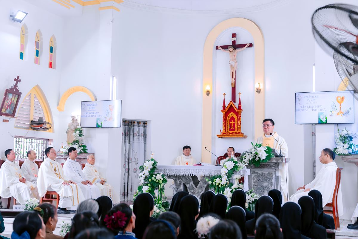 Chia sẻ trong Thánh lễ, cha Giuse Nguyễn Hữu Thái, OFM, nhấn mạnh rằng chức linh mục là một hồng ân nhưng không Thiên Chúa trao ban, chứ không phải là sự thăng tiến về địa vị hay của cải trần thế. Ngài cầu chúc Tân linh mục trở nên khí cụ của bình an và tình yêu thương, noi gương Chúa Giêsu – Vị Mục Tử nhân lành. Cha cũng ví đời sống linh mục như chiếc bình sành dễ vỡ, luôn cần đến ơn Chúa và lời cầu nguyện nâng đỡ của cộng đoàn để vượt qua những thử thách và chông gai trên hành trình phục vụ. Thông điệp cuối cùng, cha mời gọi Tân linh mục luôn gìn giữ tình yêu ban đầu và sống trọn vẹn lý tưởng của người tôi tớ trung tín, phục vụ tha nhân theo mẫu gương Đức Kitô.