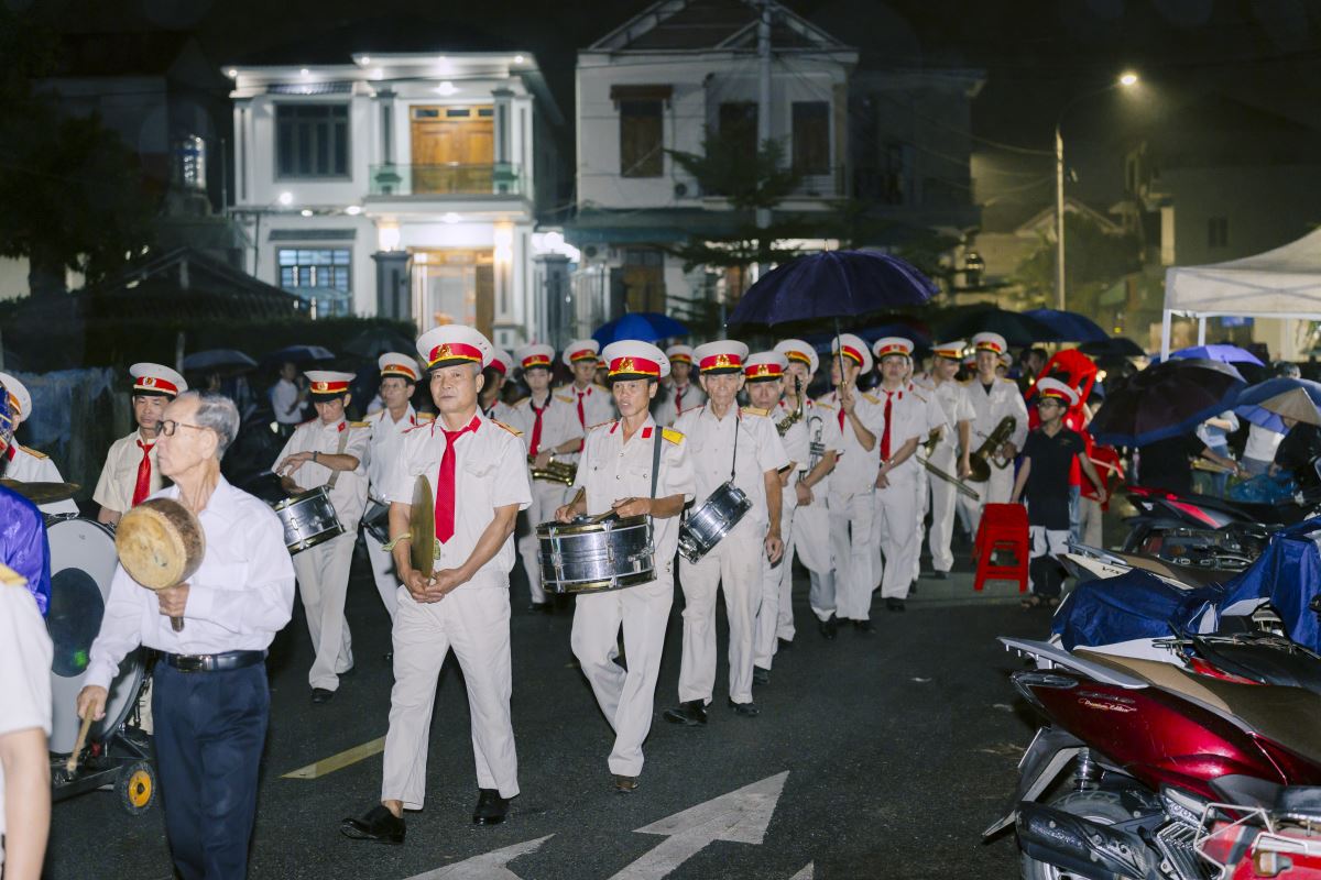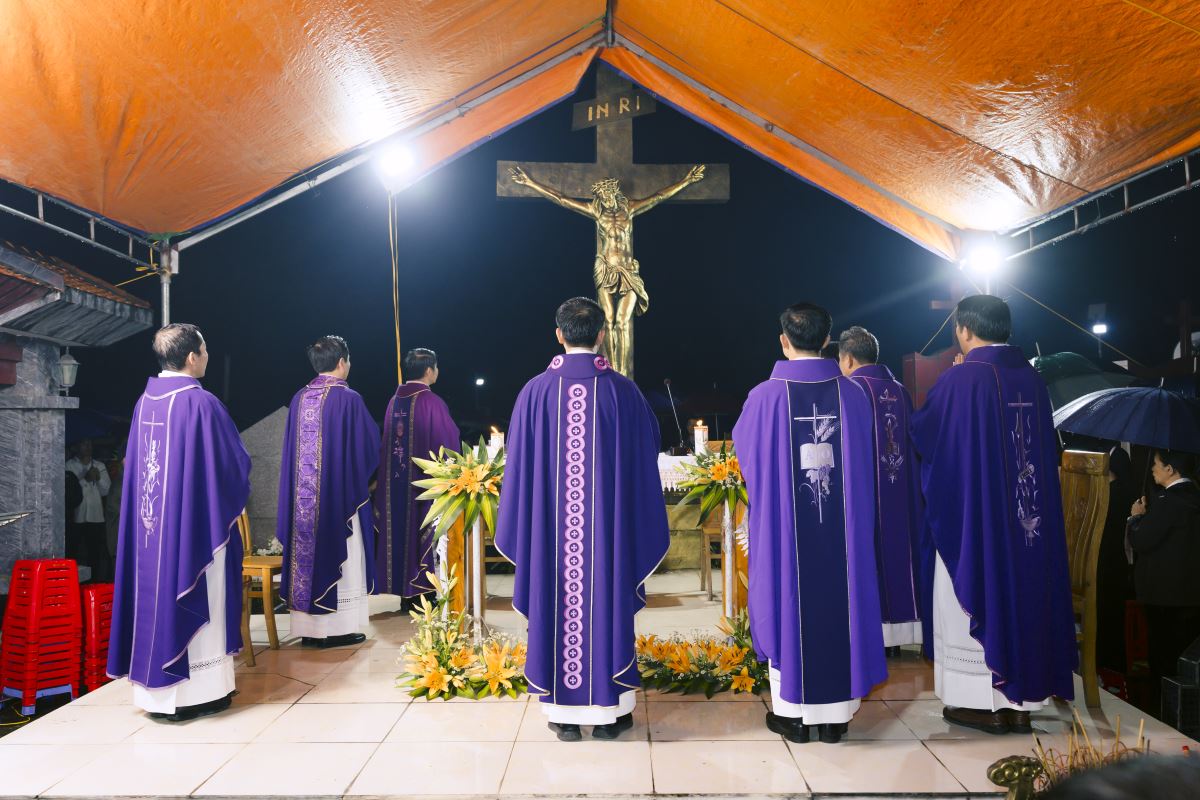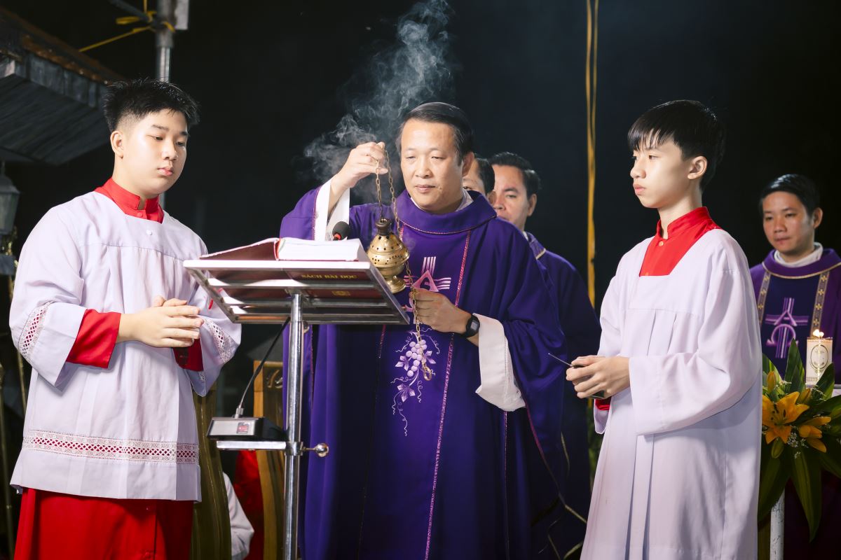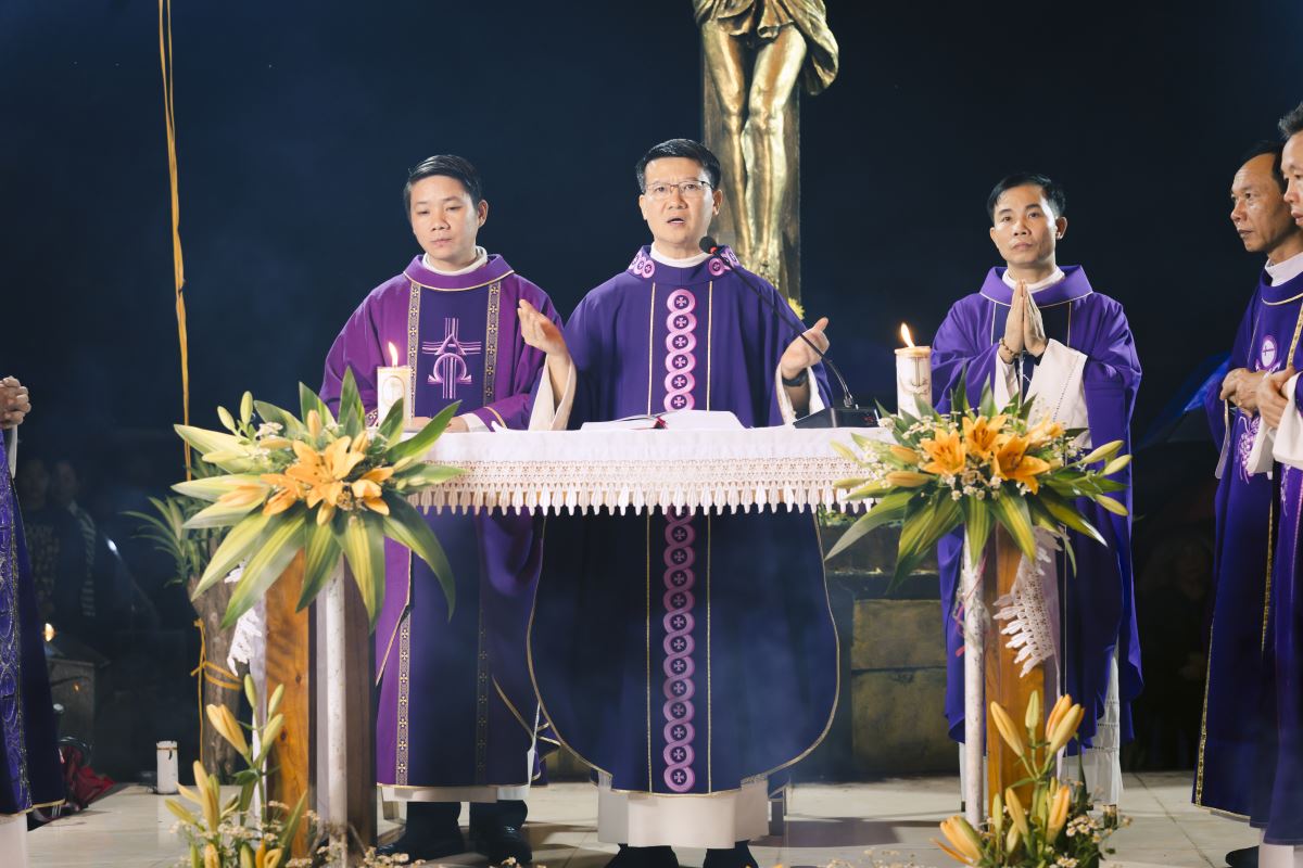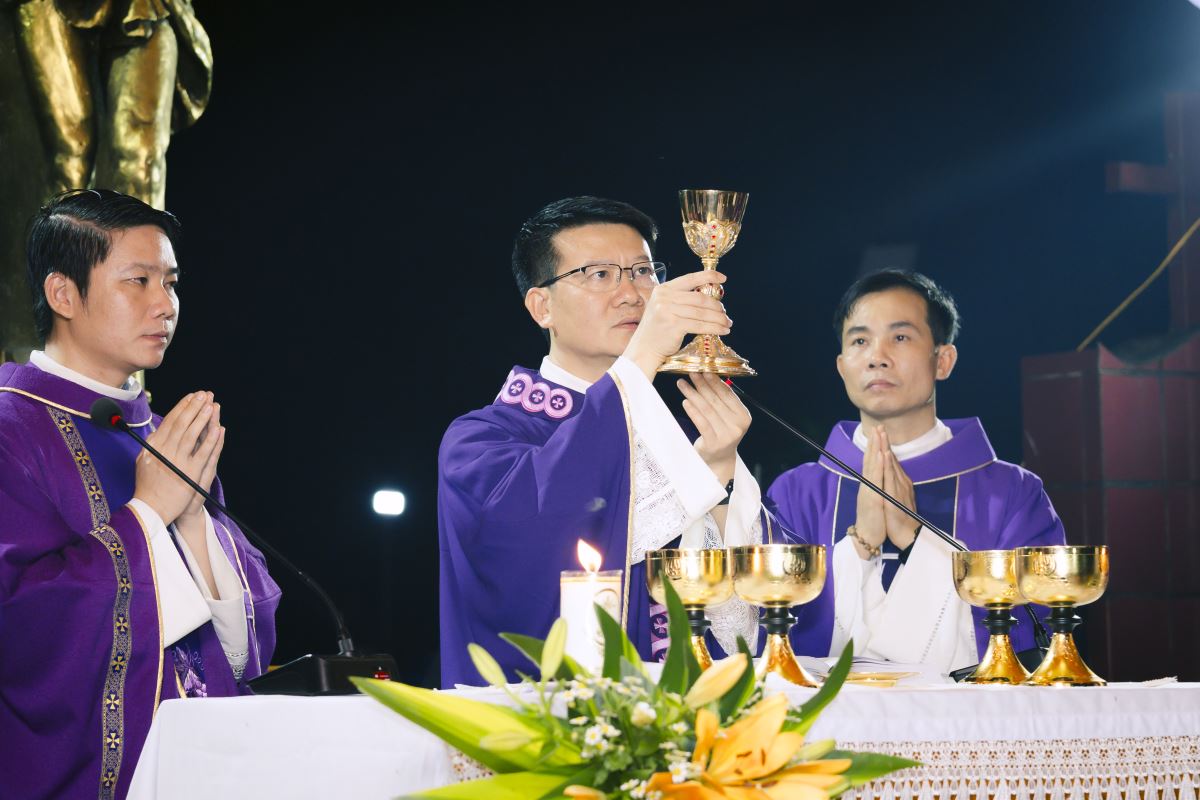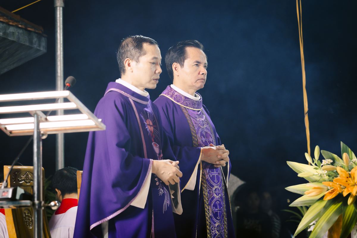 Đúng 19g00, đoàn rước đoàn đồng tế từ nhà thờ ra Vườn thánh trong tiếng trống hòa tiếng kèn đồng âm vang. Quý cha tiến lên lễ đài trong lời ca nhập lễ đầy tín thác: “Tôi tin rằng Đấng Cứu Chuộc tôi hằng sống và ngày tận thế tôi sẽ từ bụi đất sống lại và trong thân thể này tôi sẽ được chiêm ngưỡng Đấng Cứu Chuộc tôi”.