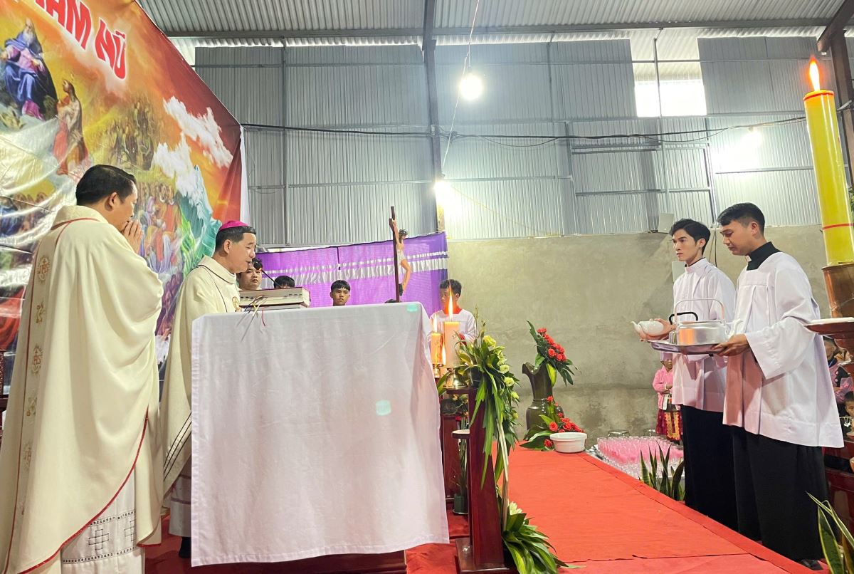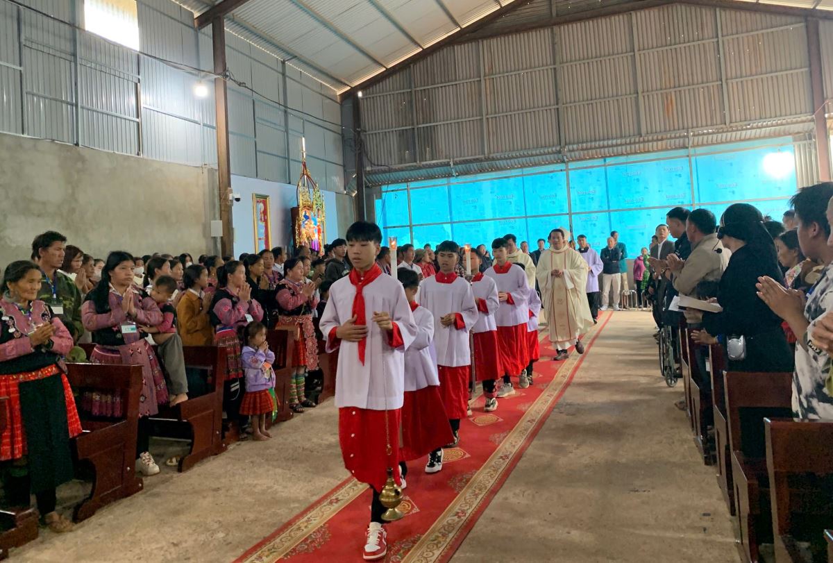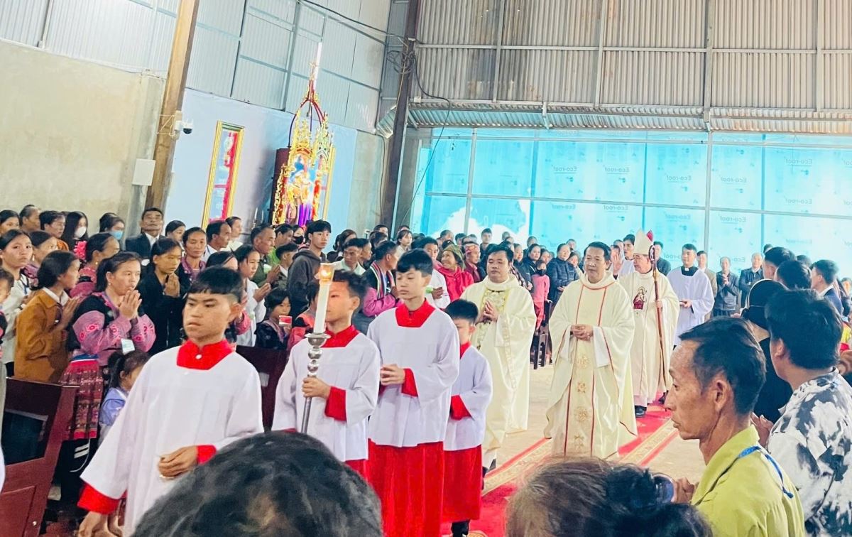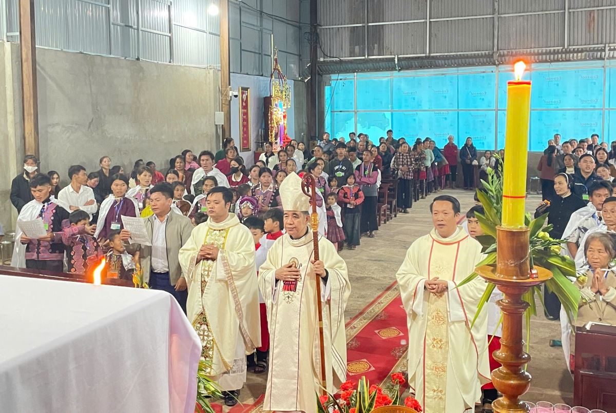 Thánh lễ được bắt đầu lúc 15 giờ, do Đức cha Đaminh Hoàng Minh Tiến – Giám mục giáo phận Hưng Hóa chủ tế. Hiện diện trong Thánh lễ có cha xứ Phêrô Trần Văn Hương, cha phó Giuse Nguyễn Văn Lục, quý dì Hội dòng Mến Thánh Giá Hưng Hóa, quý dì dòng Phaolô và đông đảo bà con giáo dân trong và ngoài giáo xứ. Đặc biệt, một số bà con dân tộc Thái, tuy chưa phải là người Công giáo, cũng đã hiện diện với lòng quý mến và trân trọng, cùng chung chia niềm vui trong ngày trọng đại của giáo họ.