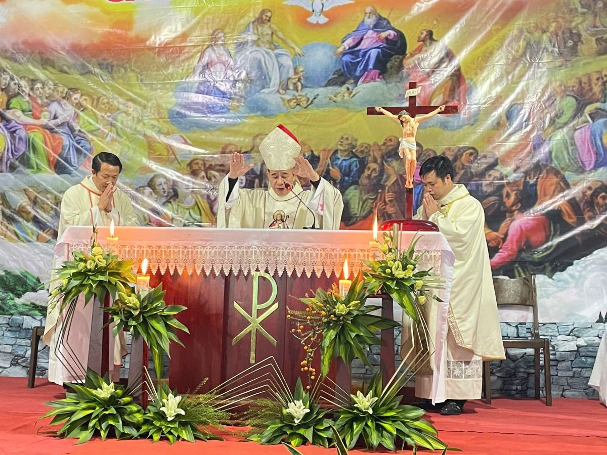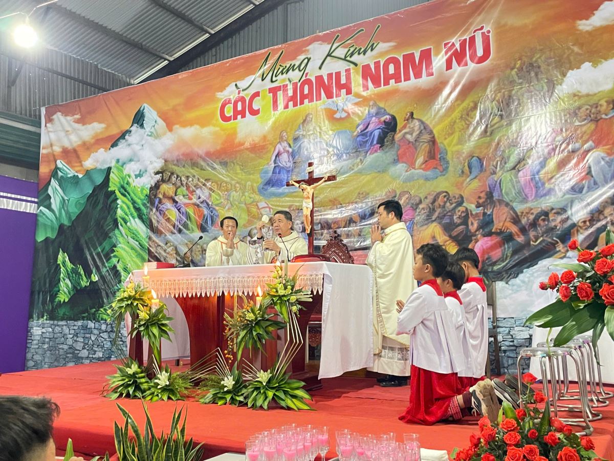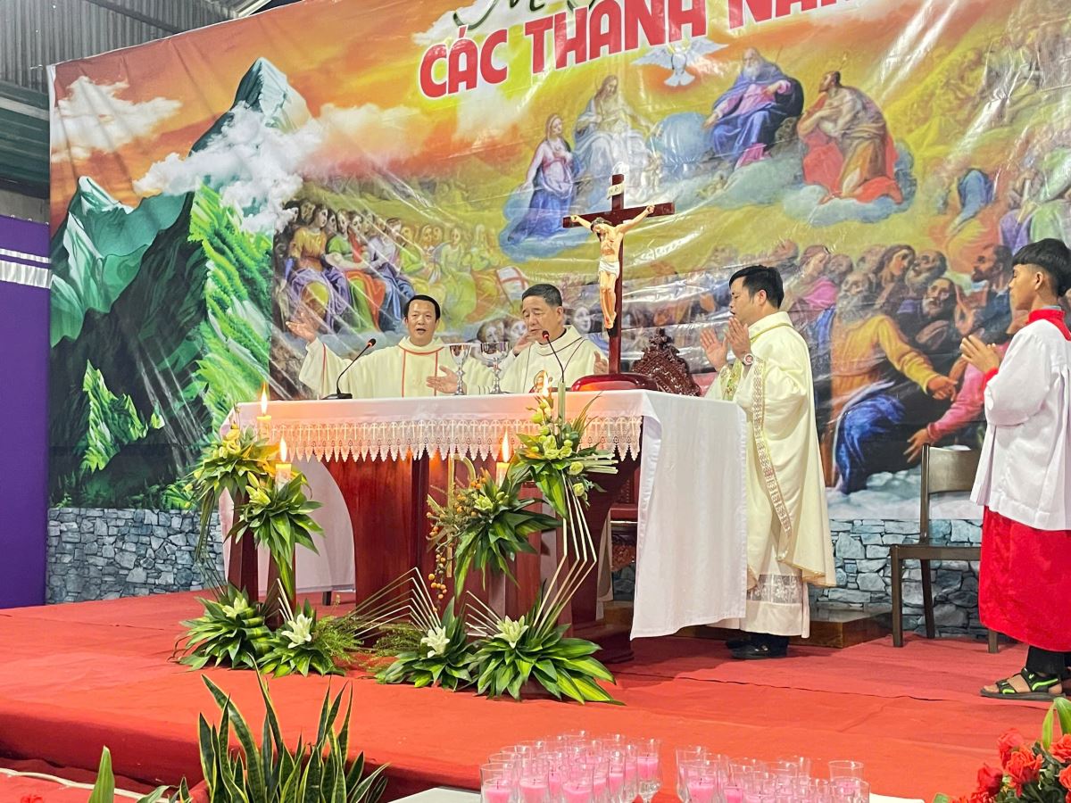 Thánh lễ được bắt đầu lúc 15 giờ, do Đức cha Đaminh Hoàng Minh Tiến – Giám mục giáo phận Hưng Hóa chủ tế. Hiện diện trong Thánh lễ có cha xứ Phêrô Trần Văn Hương, cha phó Giuse Nguyễn Văn Lục, quý dì Hội dòng Mến Thánh Giá Hưng Hóa, quý dì dòng Phaolô và đông đảo bà con giáo dân trong và ngoài giáo xứ. Đặc biệt, một số bà con dân tộc Thái, tuy chưa phải là người Công giáo, cũng đã hiện diện với lòng quý mến và trân trọng, cùng chung chia niềm vui trong ngày trọng đại của giáo họ.