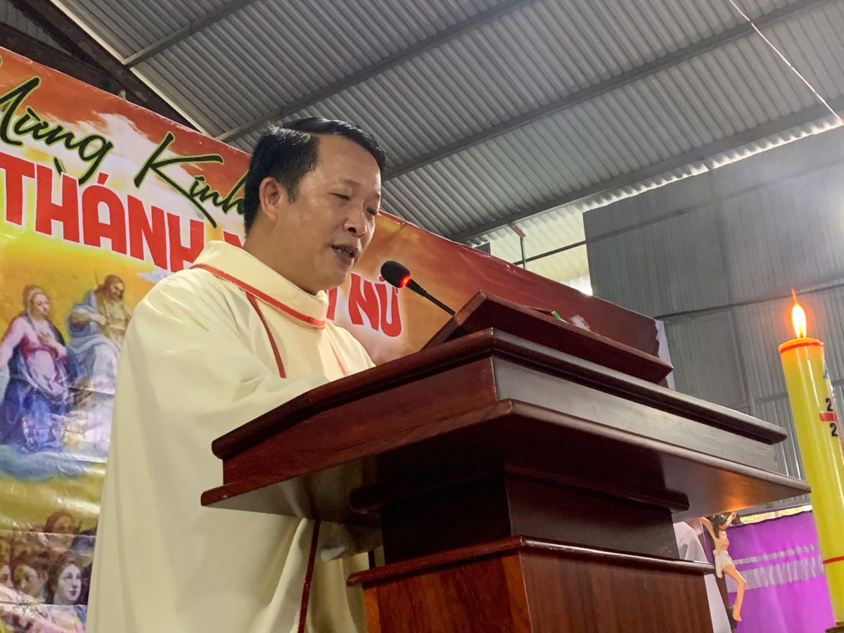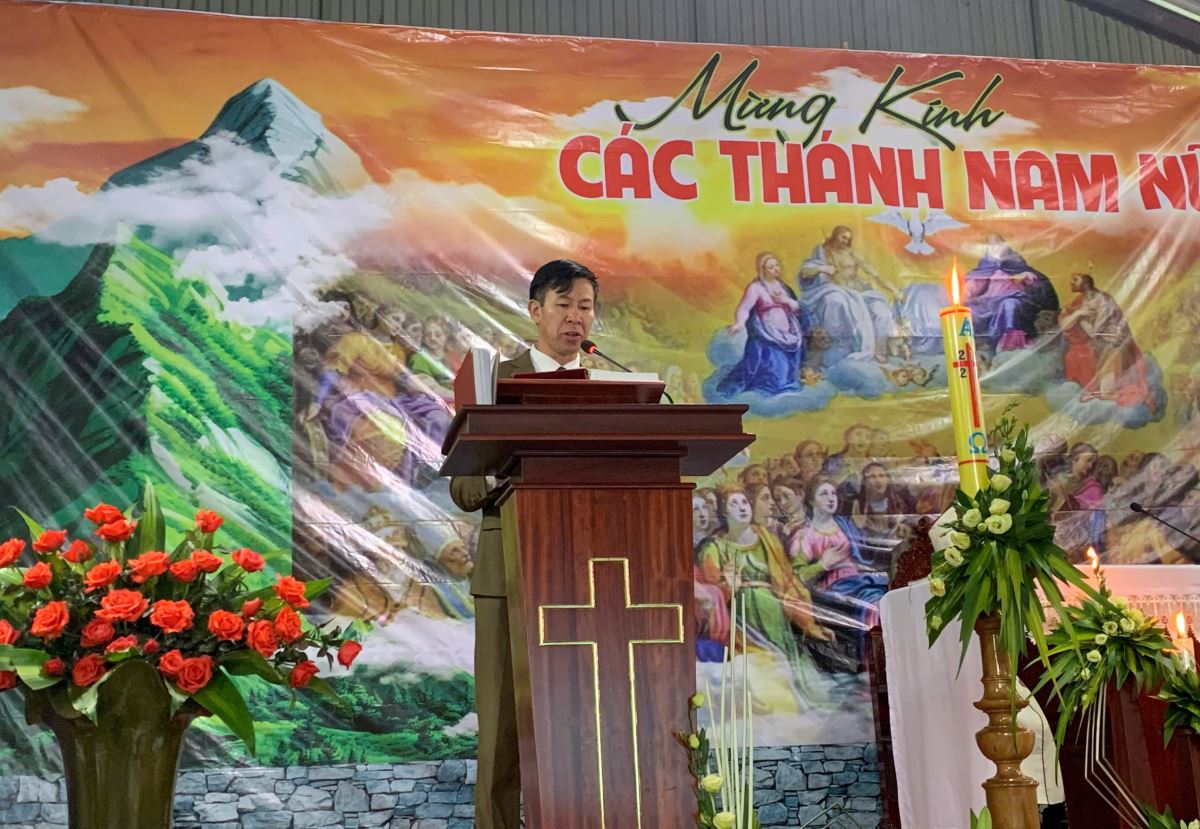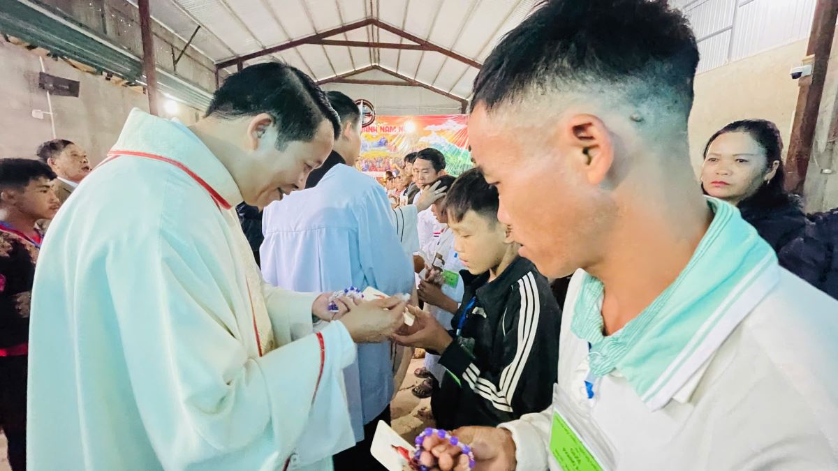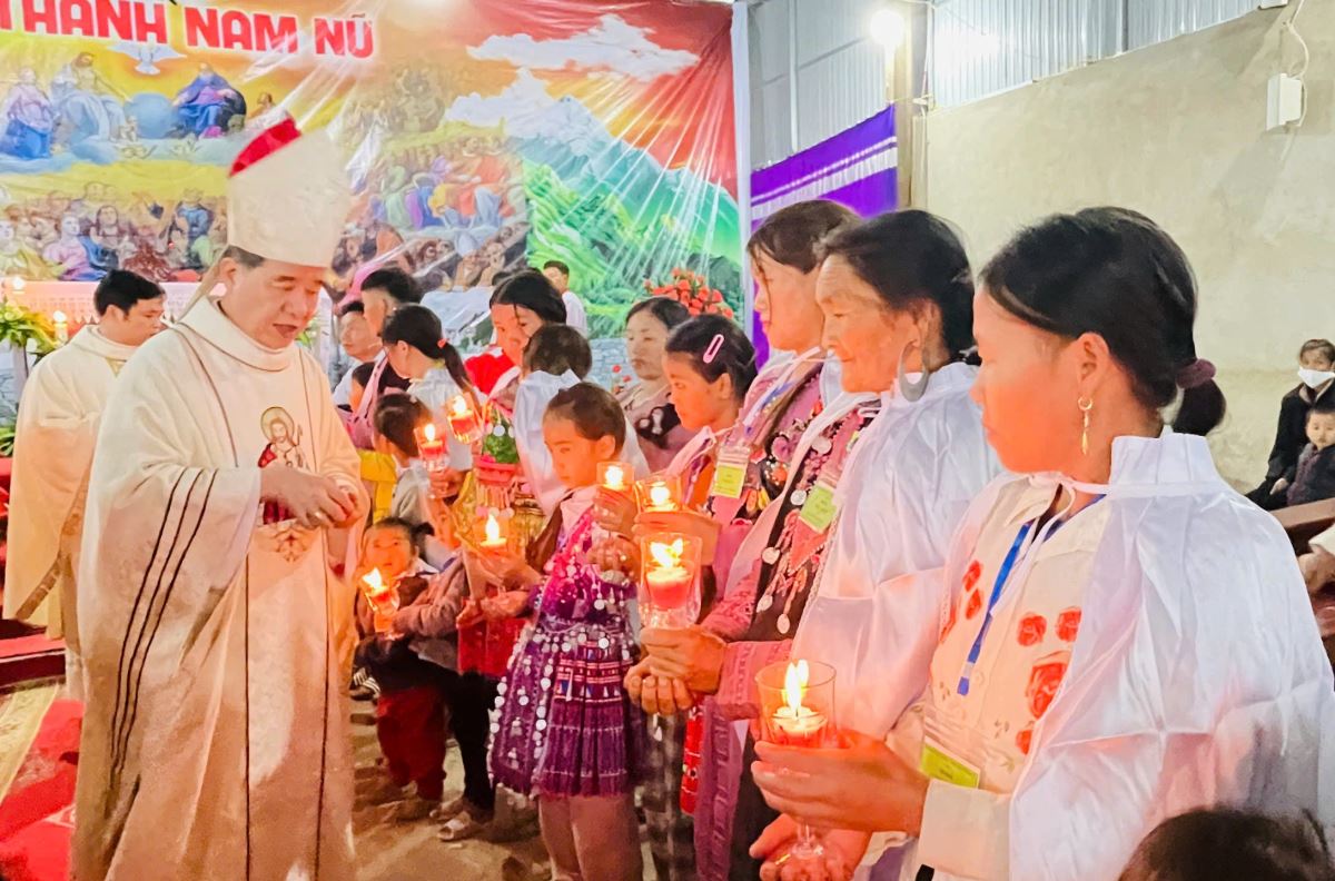 Giảng trong Thánh lễ, Đức cha Đaminh chia sẻ về truyền thống hiếu thảo của dân tộc Việt Nam và hành trình đức tin dẫn con người đến gặp gỡ Thiên Chúa. Đức cha cho thấy nét đẹp về lòng hiếu thảo của người Việt Nam, dù ở miền xuôi hay miền núi, dù là dân tộc Kinh, dân tộc Hmong, dân tộc Thái hay các dân tộc khác, mọi người đều biết tôn kính ông bà cha mẹ. Khi gặp khó khăn, nhiều người chưa biết Chúa vẫn thường cầu khẩn cùng ông Trời, cùng tổ tiên để xin phù hộ cho mình và gia đình. Đó là niềm tin tự nhiên, cũng là một con đường Thiên Chúa dẫn con người đến gặp gỡ Ngài. Đức cha mời gọi các dự tòng hôm nay hãy tiếp nối truyền thống hiếu thảo ấy trong ánh sáng Tin Mừng, để không chỉ hiếu thảo với ông bà tổ tiên nhưng còn biết sống hiếu thảo với Thiên Chúa là Cha chúng ta nữa. Mỗi người hãy biết tạ ơn Thiên Chúa là Cha, đồng thời cầu nguyện cho tổ tiên được hưởng phúc trong Nước Trời. Lời giảng giản dị nhưng sâu sắc ấy đã chạm đến trái tim mọi người, giúp các tân tòng nhận ra hành trình đức tin của họ chính là sự tiếp nối và thăng hoa của những truyền thống tốt đẹp. Đức tin không phải là điều xa lạ, mà rất gần gũi và thiết thực với đời sống con người, giúp con người kết nối được với Trời chính là Thiên Chúa và được sống hạnh phúc chan hòa với anh chị em xung quanh mình.