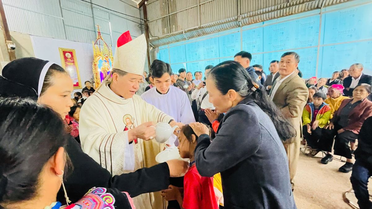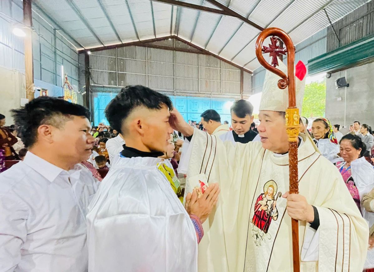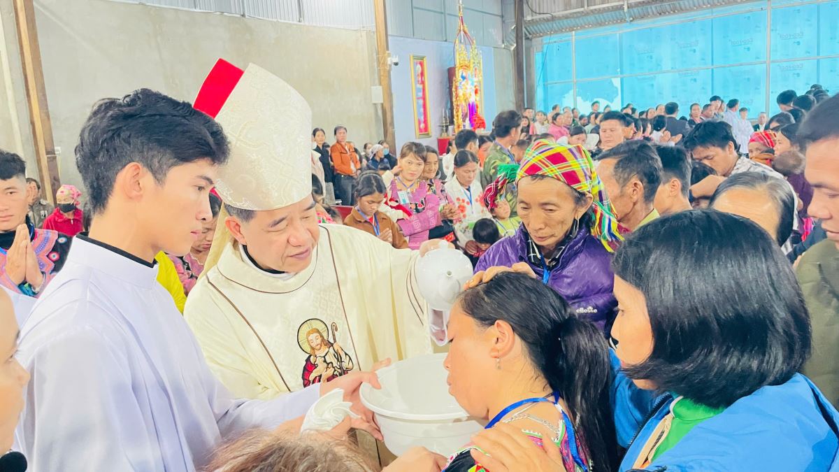 Sau nghi thức Rửa Tội, Đức cha Đaminh tiếp tục ban Bí tích Thêm Sức cho những tân tòng trưởng thành. Khi đặt tay và xức dầu Thánh lên trán từng người, Đức cha cầu xin Chúa Thánh Thần ngự xuống, ban cho họ sức mạnh, lòng can đảm và khôn ngoan để sống đức tin giữa đời. Cử chỉ đặt tay và xức dầu Thánh là dấu chỉ của việc sai đi. Như các tông đồ xưa được Thánh Thần thúc đẩy ra đi loan báo Tin Mừng, các tân tòng hôm nay cũng được mời gọi trở nên chứng nhân của Đức Kitô, để đem Chúa đến với đồng bào mình, đến với những bản làng còn chưa biết Chúa đang sống giữa núi rừng Tây Bắc, nơi đức tin đang được ươm mầm và lớn lên từng ngày. Chính trong giây phút ấy, người ta cảm nhận được sự hiện diện mầu nhiệm của Chúa Thánh Thần đang lan tỏa, đang hoạt động và thổi luồng sinh khí mới vào Giáo hội nơi miền sơn cước này.
