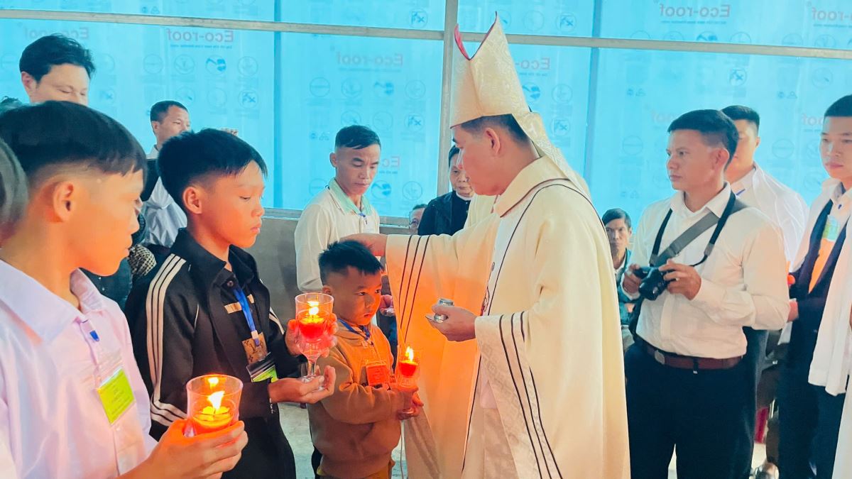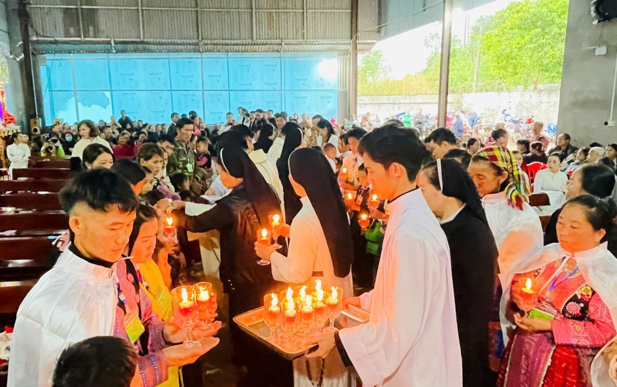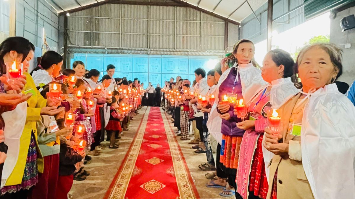 – biểu tượng của Đức Kitô Phục Sinh, Ánh sáng vĩnh cửu. Cây nến cháy sáng là dấu chỉ họ đã đón nhận ánh sáng của Đức Kitô, để từ nay họ cũng được mời gọi trở thành “ánh sáng thế gian”, mang niềm tin và tình yêu Chúa đến cho người khác. Khi những ngọn nến cùng thắp sáng, ánh sáng lung linh ấy chiếu rực khắp khuôn viên nhà nguyện, như minh chứng đức tin đã được thắp lên giữa núi rừng Tây Bắc.