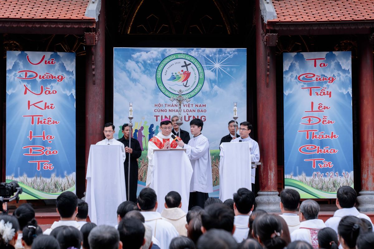 Trong bài giảng, Đức Cha Phaolô mời gọi cộng đoàn dâng lời tạ ơn Thiên Chúa vì muôn vàn hồng ân Người đã tuôn đổ trên Giáo xứ Hoàng Xá suốt 130 năm lịch sử đức tin. Ngài cũng nhấn mạnh ý nghĩa của Năm Thánh, của việc hành hương và thánh hiến nhà thờ, qua đó mời gọi mỗi tín hữu trở nên những ngôi đền sống động của Thiên Chúa, trung thành sống và làm chứng cho đức tin giữa đời sống hôm nay.