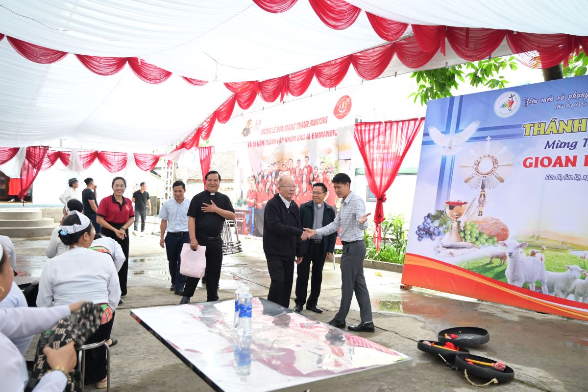 Từ 08g30 quý cha, quý khách, quý ân nhân tiến về nhà thờ giáo họ Sơn Lộ để chúc mừng nhân dịp kỷ niệm 15 năm thành lập nhóm Bác ái Emmanuel. Trong đó có các bà, các chị trong đội chiêng giáo xứ Đồng Gianh (Tổng giáo phận Hà Nội); đặc biệt có các anh chị em ân nhân vùng Tây Bắc xa xôi cũng trở về để hiệp dâng Thánh lễ và chúc mừng nhóm.