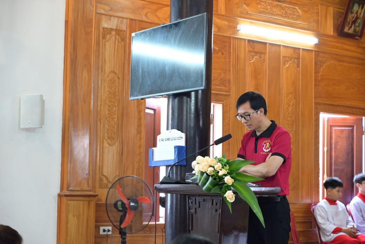 Ngỏ lời với cộng đoàn đầu lễ, Đức cha Antôn Vũ Huy Chương chúc mừng nhóm Bác ái Emmanuel nhân dịp mừng lễ quan thầy và kỷ niệm 15 năm thành lập. Đồng thời, ngài cho biết những hoạt động của nhóm, với sự tham gia của mọi thành phần trong Giáo hội từ tu sĩ đến giáo dân là minh chứng sống động cho tinh thần hiệp hành, góp phần mang tình yêu Chúa đến với những người kém may mắn.