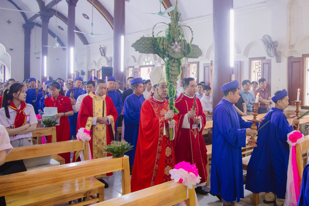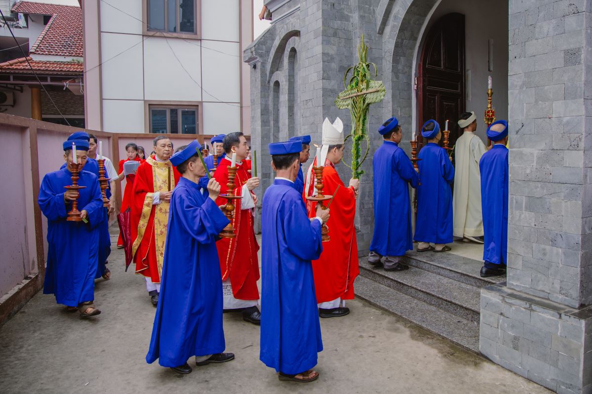 Ngay từ sớm, khuôn viên nhà thờ đã rộn ràng trong niềm vui và sự chuẩn bị trang nghiêm. Nghi thức làm phép lá được cử hành tại tiền sảnh nhà thờ. Những cành lá xanh tươi trên tay cộng đoàn như tái hiện lại hình ảnh dân thành Giêrusalem xưa tung hô Chúa Giêsu tiến vào thành thánh. Sau nghi thức làm phép lá, đoàn rước tiến vào Nhà thờ trong tiếng hát hoan ca, diễn tả niềm tin và lòng tôn kính đối với Đức Kitô – Vua Hòa Bình.
