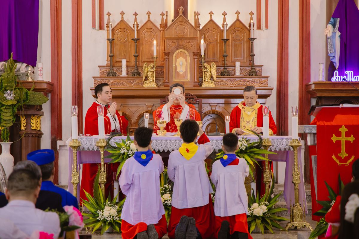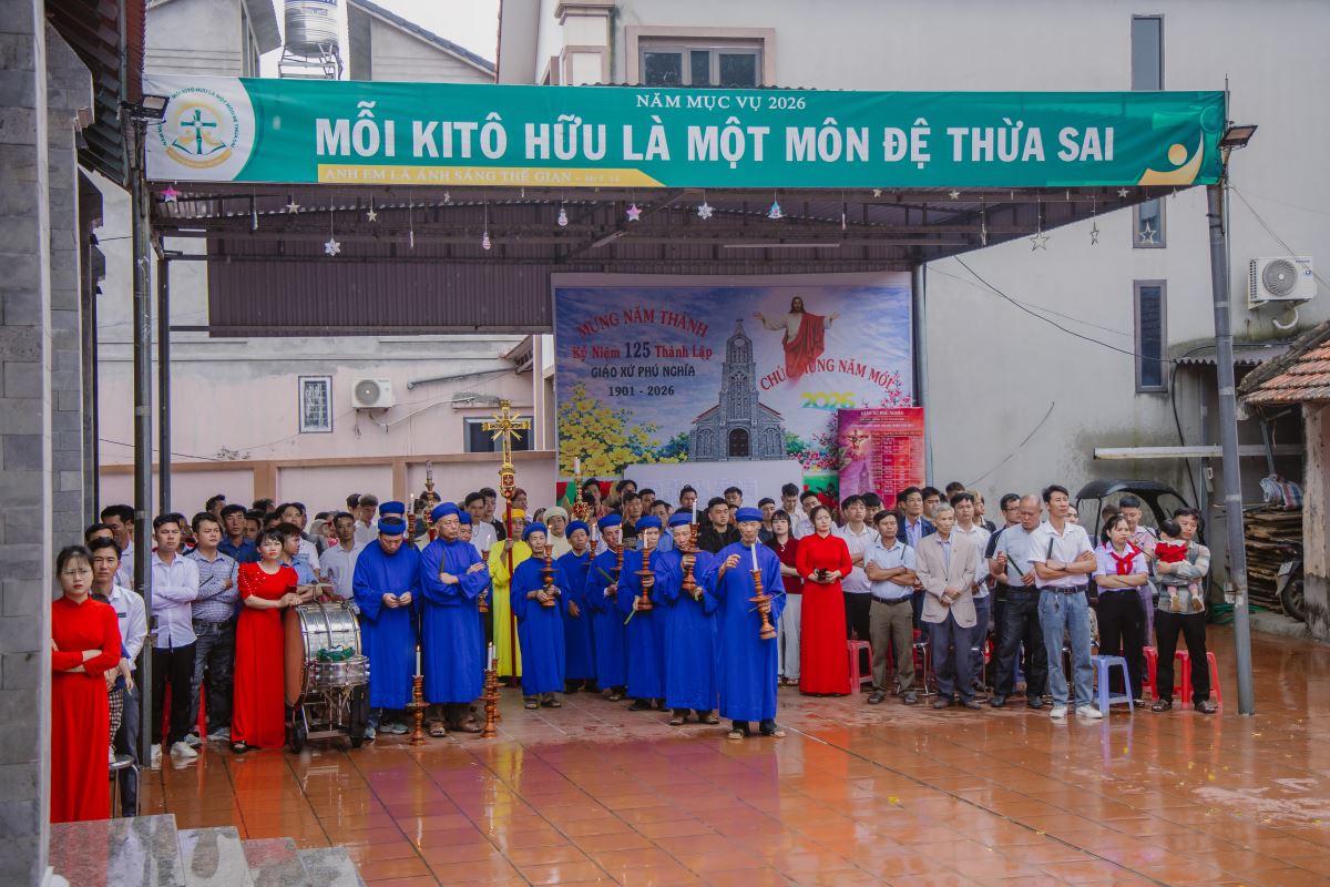 WGPHH - Trong bầu khí linh thiêng và sốt sắng của toàn thể Giáo Hội bước vào Tuần Thánh, vào lúc 9g00 sáng Chúa nhật Lễ Lá, cộng đoàn dân Chúa tại Giáo xứ Phú Nghĩa đã long trọng cử hành Thánh lễ Lá và khai mạc Thời Gian Thánh kỷ niệm 125 năm thành lập giáo xứ (1901–2026). Thánh lễ do Đức Cha Đaminh Hoàng Minh Tiến chủ sự, cùng quý cha, với sự hiện diện đông đảo của cộng đoàn giáo dân.