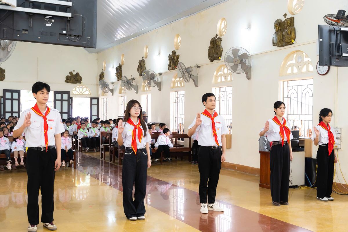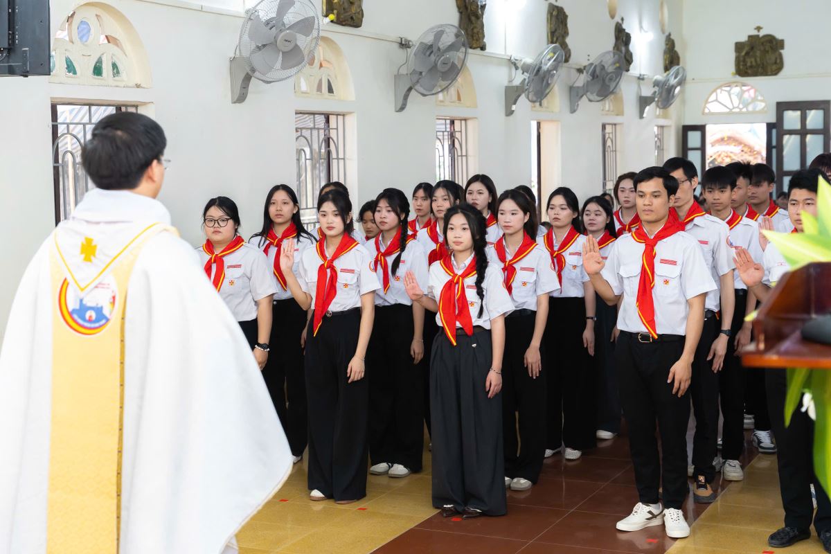 Các em đã long trọng tuyên hứa trước Chúa Giêsu Thánh Thể – Thủ Lãnh Tối Cao, là trung tâm, nguồn sống và lý tưởng của Phong trào TNTT. Ngay sau đó là nghi thức trao văn thư bổ nhiệm Ban Quản trị Xứ đoàn, kết thúc bằng nghi thức trao cờ và chào cờ trang nghiêm, sốt sắng.