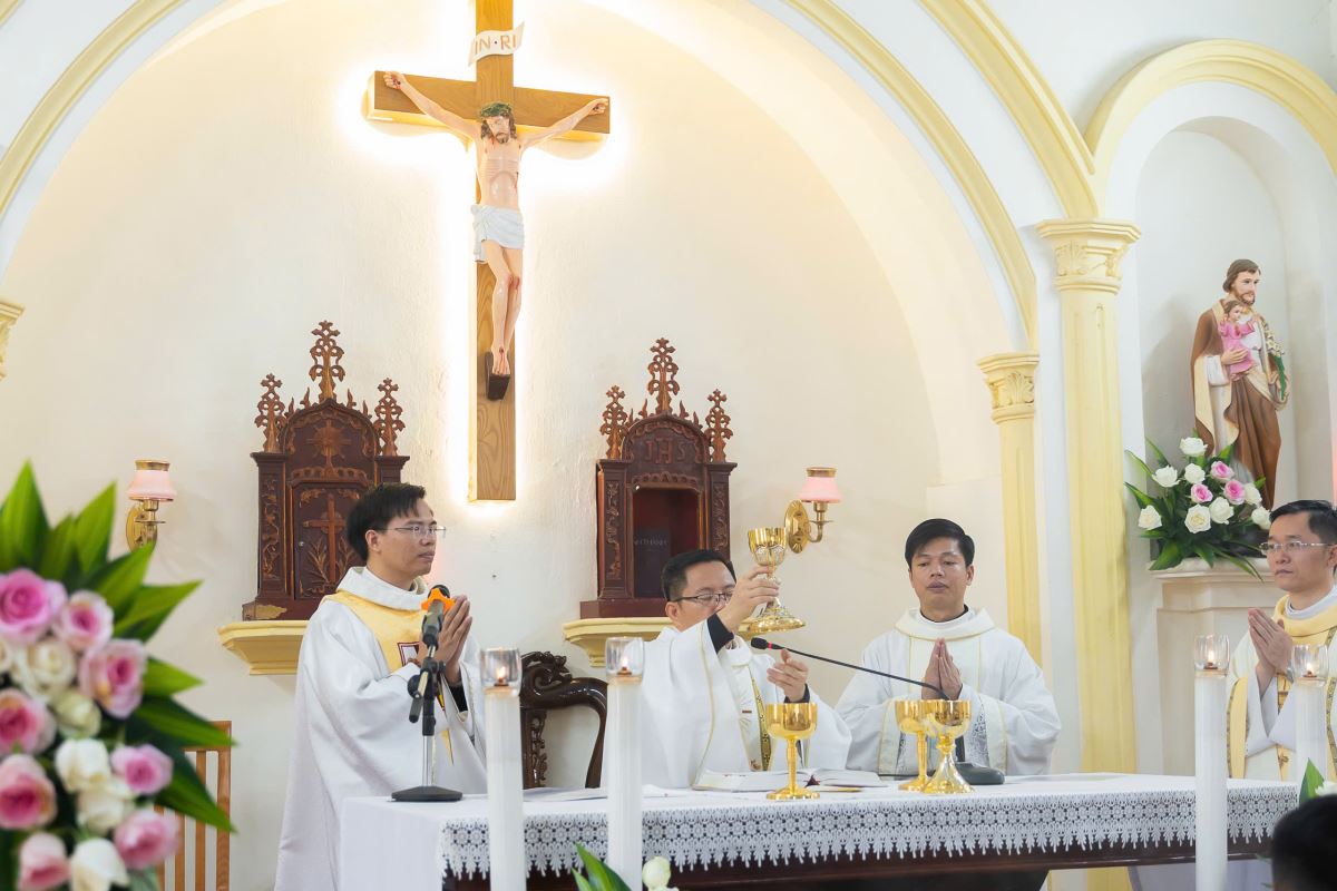 Đúng 09g00 sáng, đoàn rước long trọng tiến từ nhà mục vụ vào nhà thờ trong tiếng đàn rộn ràng và những giai điệu thánh ca thánh thiêng do các em thiếu nhi toàn xứ cất vang.